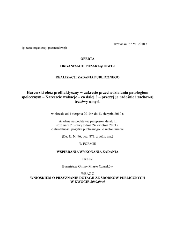 ........................................................ Trzcianka, 27.VI..2010 r. (pieczęć organizacji pozarządowej) OFERTA ORGANIZACJI POZARZĄDOWEJ REALIZACJI ZADANIA PUBLICZNEGO Harcerski obóz profilaktyczny w zakresie przeciwdziałania patologiom społecznym – Nareszcie wakacje – co dalej ? – przeŜyj je radośnie i zachowaj trzeźwy umysł. w okresie od 4 sierpnia 2010 r. do 13 sierpnia 2010 r. składana na podstawie przepisów działu II rozdziału 2 ustawy z dnia 24 kwietnia 2003 r. o działalności poŜytku publicznego i o wolontariacie (Dz. U. Nr 96, poz. 873, z późn. zm.) W FORMIE WSPIERANIA WYKONANIA ZADANIA PRZEZ Burmistrza Gminy Miasto Czarnków WRAZ Z WNIOSKIEM O PRZYZNANIE DOTACJI ZE ŚRODKÓW PUBLICZNYCH W KWOCIE 3000,00 zł I. Dane na temat organizacji pozarządowej 1) pełna nazwa Związek Harcerstwa Polskiego Chorągiew Wielkopolska Hufiec Trzcianka 2) forma prawna: stowarzyszenie 3) numer w Krajowym Rejestrze Sądowym: 0000266321 4) data wpisu , rejestracji lub utworzenia: 31.10.2006 5) nr NIP 778-14-40-251 nr REGON 300429024 6) dokładny adres: miejscowość 61-809 Poznań, ul. Św. Marcin 80/82 gmina Poznań powiat Poznań, województwo wielkopolskie 7) tel. 0672162170 faks 067 2162170 e-mail: [email protected] http:// www.trzcianka.zhp.wlkp.pl 8) nazwa banku i numer rachunku PKO BP S. A. o/ Trzcianka 19102038440000110200069294 9) nazwiska i imiona osób upowaŜnionych do podpisywania umowy o wykonanie zadania publicznego phm. Hanna Sotek – Komendantka Hufca Trzcianka Aleksandra BłaŜejewska – Skarbnik Hufca Trzcianka 10) nazwa, adres i telefon kontaktowy jednostki bezpośrednio wykonującej zadanie, o którym mowa w ofercie Związek Harcerstwa Polskiego – Komenda Hufca ul. Broniewskiego 7 64-980 Trzcianka tel. (067) 2162170 11) osoba upowaŜniona do składania wyjaśnień i uzupełnień dotyczących oferty (imię i nazwisko oraz nr telefonu kontaktowego) Hm. Edward Joachimiak – tel 666251190 12) przedmiot działalności statutowej: a) DZIAŁALNOŚĆ NIEODPŁATNA b) DZIAŁALNOŚĆ ODPŁATNA 1. Zrzeszanie swoich członków w podstawowych jednostkach organizacyjnych 2. Prowadzenie działalności wychowawczej i oświatowej wśród dzieci i młodzieŜy, prowadzenie wśród nich całorocznej działalności oświatowo-wychowawczej posługując się harcerskimi formami pracy 3. Upowszechnianie idei wolontariatu oraz organizowanie wolontariuszy do realizacji celów statutowych 4. Podejmowanie zadań w zakresie pomocy społecznej w tym takŜe poprzez prowadzenie działalności charytatywnej i opiekuńczej 5. Prowadzenie działalności na rzecz osób niepełnosprawnych, a w szczególności rehabilitacji i rewalidacji dzieci nieprzystosowanych społecznie 6. Prowadzenie wykształcenia kadry instruktorskiej 7. Upowszechnianie zasad wolności i praw 1. Prowadzenie działalności edukacyjnej i kształceniowej wśród osób dorosłych 2. Tworzenie ośrodków oraz placówek oświatowo-wychowawczych, naukowobadawczych i kulturalnych 3. Organizowanie przedsięwzięć związanych z rozwojem zainteresowań i specjalności, działalnością w zakresie kultury, kultury fizycznej, sportu oraz turystyki i krajoznawstwa 4. Inicjowanie i realizowanie programów profilaktycznych i przeciwdziałających uzaleŜnieniom 5. Prowadzenie działalności wydawniczej, radiowej, informacyjnej 6. Organizowanie letniego i zimowego wypoczynku w formach wyjazdowych i miejscu zamieszkania człowieka oraz swobód obywatelskich a takŜe prowadzenie działań wspomagających rozwój demokracji 8. Przyczynianie się do budowania społeczeństwa obywatelskiego 9. Prowadzenie działalności międzynarodowej w tym działalności na rzecz integracji europejskiej 10. Stwarzanie warunków do nawiązywania i utrwalania silnych więzi międzyludzkich ponad podziałami rasowymi, narodowymi i wyznaniowymi 11. Upowszechnianie i umacnianie w społeczeństwie przywiązania do wartości: wolności, prawdy, sprawiedliwości, demokracji, samorządności, równouprawnienia, tolerancji i przyjaźni 12. Upowszechnianie wiedzy o świecie przyrody, przeciwstawianie się jego niszczeniu przez cywilizację, kształtowanie potrzeby kontaktu z nieskaŜoną przyrodą, organizowanie przedsięwzięć związanych z ochroną środowiska naturalnego 13. Działanie na rzecz obrony narodowej i bezpieczeństwa powszechnego 14. Troszczenie się o tradycję i dziedzictwo narodowe, kształtowanie postaw patriotycznych 15. Działanie na rzecz promocji zdrowego trybu Ŝycia oraz ochrony zdrowia 16. Dbanie o dobra kultury związane z historią harcerstwa, chronienie ich i udostępnianie dla celów naukowo-badawczych i wychowawczych 17. Przygotowanie członków organizacji do aktywności na rynku pracy 18. Wypowiadanie się w sprawach dzieci i młodzieŜy 13) jeŜeli organizacja pozarządowa prowadzi działalność gospodarczą: a) numer wpisu do rejestru przedsiębiorców, b) przedmiot działalności gospodarczej ad. a) KRS 0000266321 ad. b) 1. Pomoc drogowa oraz pozostała działalność usługowa związana z pojazdami samochodowymi 2. Wynajem nieruchomości na własny rachunek 3. SprzedaŜ detaliczna artykułów nieŜywnościowych w wyspecjalizowanych sklepach, gdzie indziej niesklasyfikowana 4. Wydawanie ksiąŜek 5. Transport pasaŜerski miejski 6. Transport pasaŜerski międzymiastowy 7. Transport pasaŜerski rozkładowy pozostały 8. Transport lądowy pasaŜerski, pozostały 9. SprzedaŜ detaliczna pozostała prowadzona poza siecią sklepową, gdzie indziej niesklasyfikowana 10. Stołówki 11. Przygotowywanie i dostarczanie Ŝywności dla odbiorów zewnętrznych (catering) 12. Pola kempingowe, włączając pola dla samochodowych przyczep kempingowych 13. Wynajem pozostałych środków transportu lądowego 14. Wynajem środków transportu wodnego 15. Wynajem środków transportu lotniczego 16. Przetwarzanie danych 17. Działalność związana z bazami danych 18. Działalność związana z informatyką, pozostała 19. Dział