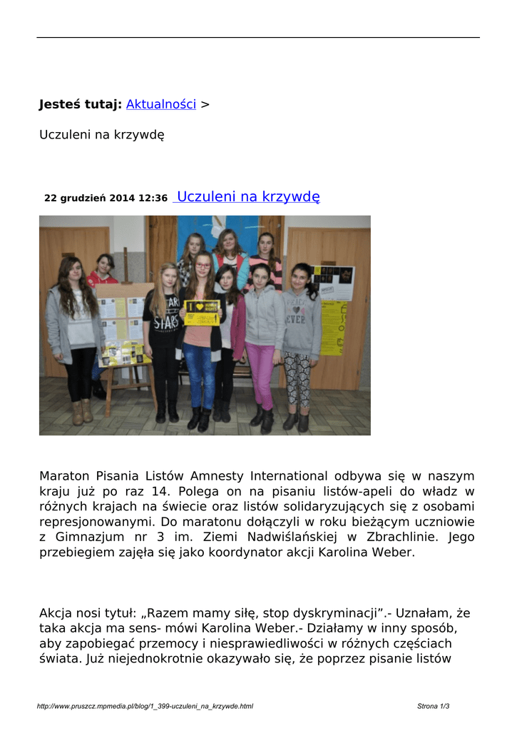 Jesteś tutaj: Aktualności > Uczuleni na krzywdę 22 grudzień 2014 12:36 Uczuleni na krzywdę Maraton Pisania Listów Amnesty International odbywa się w naszym kraju już po raz 14. Polega on na pisaniu listów-apeli do władz w różnych krajach na świecie oraz listów solidaryzujących się z osobami represjonowanymi. Do maratonu dołączyli w roku bieżącym uczniowie z Gimnazjum nr 3 im. Ziemi Nadwiślańskiej w Zbrachlinie. Jego przebiegiem zajęła się jako koordynator akcji Karolina Weber. Akcja nosi tytuł: „Razem mamy siłę, stop dyskryminacji”.- Uznałam, że taka akcja ma sens- mówi Karolina Weber.- Działamy w inny sposób, aby zapobiegać przemocy i niesprawiedliwości w różnych częściach świata. Już niejednokrotnie okazywało się, że poprzez pisanie listów http://www.pruszcz.mpmedia.pl/blog/1_399-uczuleni_na_krzywde.html Strona 1/3 realnie można wpłynąć na poprawę sytuacji kilku bądź kilkunastu osób, których prawa człowieka zostały złamane- dodaje. Taki list może napisać każdy z nas. Niezależnie czy jest on pisany w domu, pracy, bibliotece itp. Gimnazjaliści robili to na języku polskim, angielskim oraz na zajęciach pozalekcyjnych. W tegorocznej akcji w obronę wzięto 11 osób. A są nimi: Chelsa E Manning z USA-szeregowa skazana za ujawnienie zbrodni, Daniel Quintero z Wenezueli, student torturowany za udział w proteście, John Jeanette z Norwegii, dyskryminowana ze względu na tożsamość płciową, Oleg Seńcow z Ukrainy, reżyser uwięziony za pokojową demonstrację, Paraskewi Kokoni z Grecji- Romka pobita w rasistowskim ataku, Erkin Musajew z Uzbekistanu więziony po 3 niesprawiedliwych procesach, Liu Ping z Chin, aktywistka więziona za walkę z korupcją, Raif Badawi z Arabii Saudyjskiej, bloger, za założenie strony internetowej, Moses Akatugba z Nigerii, nastolatek skazany na karę śmierci, Społeczność BhopaluIndie, walczą o sprawiedliwość dla ofiar katastrofy przemysłowej, Kobiety i dziewczęta z Mkhondo z RPA. Życie tych kobiet w ciąży jest zagrożone. Uczniowie z gimnazjum w Zbrachlnie wzięli pod obronę 4 osoby. Pisali listy na języku polskim, języku angielskim oraz na zajęciach pozalekcyjnych. To oni sami zadecydowali, kogo chcą bronić i komu pomóc. – My bronimy społeczność Bhopalu w Indiach, gdzie podczas wycieku toksycznych substancji z fabryki zginęło od 3 do 7 tys. ludzi i nikt praktycznie nie zajmuje się tym problemem- mówi Jagoda.- A stało się to 30 lat temu. Wiele dzieci rodzi się niepełnosprawnych, kalekich. To skażenie do dzisiejszego dnia nie zostało należycie zneutralizowane. Osoby odpowiedzialne za taki stan rzeczy nie zostały pociągnięte do odpowiedzialności karnej- dodaje. -Bronimy także Raifa Badawiego, który założył stronę internetową w Arabii Saudyjskiej- mówi Beata.- Okazuje się , że tam nie można ani mówić prawdy, ani pisać jej w internecie. Różni aktywiści i obrońcy praw człowieka są zamykani w więzieniu i grozi im wysoka kara. W przypadku Raifiego być może kara śmierci bo jego czyn został zakwalifikowany do tzw. „apostazji”- dodaje. Angelikę poruszyła historia Romki z Grecji, która została brutalnie http://www.pruszcz.mpmedia.pl/blog/1_399-uczuleni_na_krzywde.html Strona 2/3 pobita wraz z innymi Romami przez skrajnie prawicowe ugrupowanie. Ich domy zdemolowano a oni na wiele miesięcy musieli opuścić swoje mieszkania. Poza tym uczniowie na języku angielskim zajęli się pisaniem listów w sprawie pomocy dla kobiet i dziewcząt z gminy Mkhondo w RPA, gdzie jest wiele zagrożeń dla w kwestii zdrowia macierzyńskiego, prawa seksualnego i reprodukcyjnego. Niektóre z tych listów trafią do rządów państw, z których wywodzą się pokrzywdzeni, inne jako słowa solidarności trafią do samych poszkodowanych. Gimnazjaliści napisali ogółem 35 listów i są pewni, że ich głosy chociaż w małym stopniu przyczynią się do pomocy pokrzywdzonym. KP „Czas Świecia”, 19 grudnia 2014 r. drukuj Wróć http://www.pruszcz.mpmedia.pl/blog/1_399-uczuleni_na_krzywde.html Powered by TCPDF (www.tcpdf.org) Strona 3/3