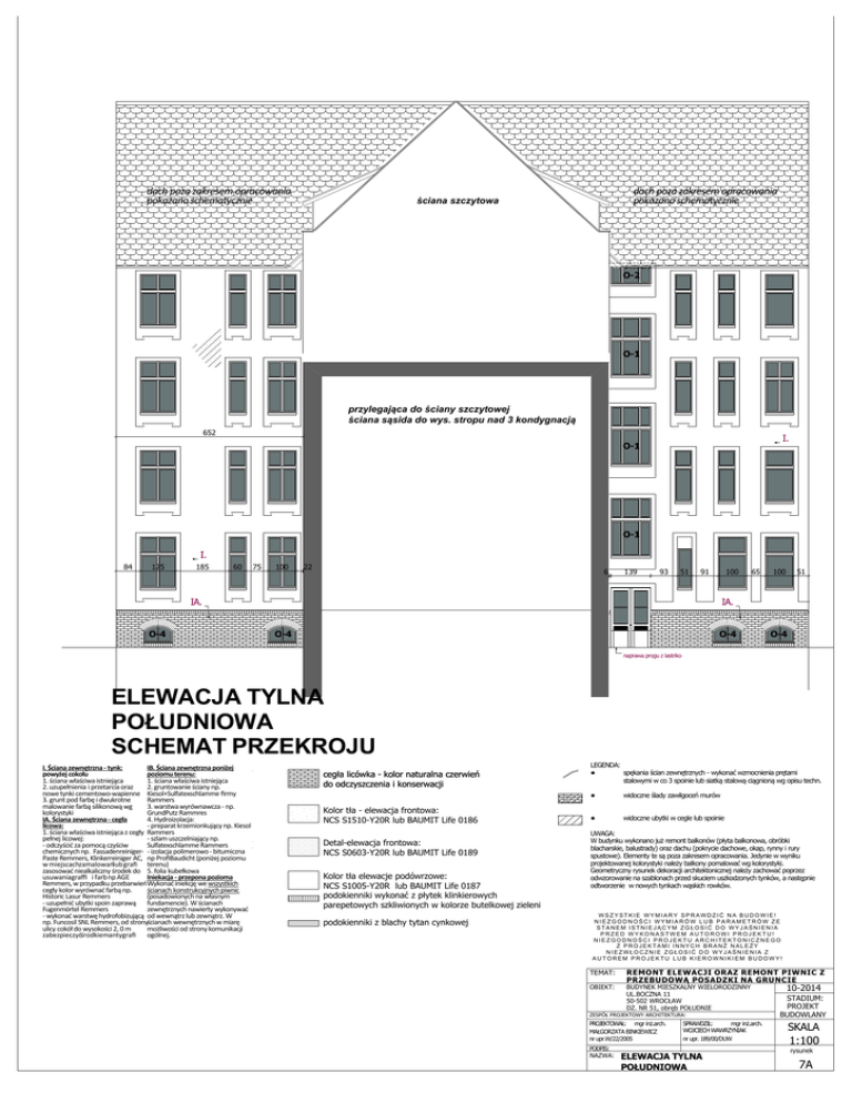 dach poza zakresem opracowania pokazano schematycznie dach poza zakresem opracowania pokazano schematycznie ściana szczytowa O-2 O-1 przylegająca do ściany szczytowej ściana sąsida do wys. stropu nad 3 kondygnacją 652 I. O-1 O-1 I. 84 125 185 60 75 100 22 6 139 93 51 91 100 IA. O-4 65 100 51 IA. O-4 O-4 O-4 naprawa progu z lastriko ELEWACJA TYLNA POŁUDNIOWA SCHEMAT PRZEKROJU ELEWACJA FRONTOWA - UL. BOCZNA 11 I. Ściana zewnętrzna - tynk: IB. Ściana zewnętrzna poniżej II. Ściana wewnętrzna piwnic powyżej cokołu poziomu terenu: 1. ściana właściwa istniejąca cegła licówka - kolor naturalna czerwień 1. ściana właściwa istniejąca 1. ściana właściwa istniejąca 2. obrzutka np. Vorspritzmortel do odczyszczenia i konserwacji 2. uzupełnienia i przetarcia oraz 2. gruntowanie ściany np. Remmers nowe tynki cementowo-wapienne Kiesol+Sulfatexschlamme firmy 3 podkład tynkarski np. Grundputz 3. grunt pod farbę i dwukrotne Rammers Remmers malowanie farbą silikonową wg 3. warstwa wyrównawcza - np. 4. Tynk renowacyjny np. Sanierputz Kolor tła - elewacja frontowa: kolorystyki GrundPutz Rammres Remmers IA. Ściana zewnętrzna - cegła 4. Hydroizolacja: 4. grunt pod farbę i dwukrotne NCS S1510-Y20R lub BAUMIT Life 0186 licowa: - preparat krzemionkujący np. Kiesol malowanie farbą silikonową lub 1. ściana właściwa istniejąca z cegły Rammers akrylową wg kolorystyki pełnej licowej: - szlam uszczelniający np. IIa. Ściana wewnętrzna piwnic przy Detal-elewacja frontowa: - odczyścić za pomocą czyściw Sulfatexschlamme Rammers ścianie z sąsiadem chemicznych np. Fassadenreiniger- - izolacja polimerowo - bitumiczna 1. ściana właściwa istniejąca NCS S0603-Y20R lub BAUMIT Life 0189 Paste Remmers, Klinkerreiniger AC, np ProfiBaudicht (poniżej poziomu 2. gruntowanie ściany np. w miejscachzamalowańlub grafi terenu) Kiesol+Sulfatexschlamme firmy zasosować niealkaliczny środek do 5. folia kubełkowa Rammers usuwaniagraffi i farb np AGE Iniekacja - przepona pozioma 3. warstwa wyrównawczaKolor - np. tła elewacje podówrzowe: Remmers, w przypadku przebarwień Wykonać iniekcję we wszystkich GrundPutz Rammres NCS S1005-Y20R lub BAUMIT Life 0187 cegły kolor wyrównać farbą np. ścianach konstrukcyjnych piwnic 4. Hydroizolacja: podokienniki wykonać z płytek klinkierowych Historic Lasur Remmers (posadowionych na własnym - preparat krzemionkujący np. Kiesol - uzupełnić ubytki spoin zaprawą fundamencie). W ścianach Rammers parepetowych szkliwionych w kolorze butelkowej zieleni Fugenmörtel Remmers zewnętrznych nawierty wykonywać - szlam uszczelniający np. - wykonać warstwę hydrofobizującą od wewnątrz lub zewnątrz. W Sulfatexschlamme Rammers np. Funcosil SNL Remmers, od stronyścianach wewnętrznych w miarę 5. obrzutka np. Vorspritzmortel podokienniki z blachy tytan cynkowej ulicy cokół do wysokości 2, 0 m możliwości od strony komunikacji Remmers zabezpieczyćśrodkiemantygrafi ogólnej. 6 podkład tynkarski np. Grundputz Remmers 7. Tynk renowacyjny np. Sanierputz Remmers 8. grunt pod farbę i dwukrotne malowanie farbą silikonową lub akrylową wg kolorystyki LEGENDA: ● spękania ścian zewnętrznych - wykonać wzmocnienia prętami stalowymi w co 3 spoinie lub siatką stalową ciągnioną wg opisu techn. ● widoczne ślady zawilgoceń murów ● widoczne ubytki w cegle lub spoinie UWAGA: W budynku wykonano już remont balkonów (płyta balkonowa, obróbki blacharskie, balustrady) oraz dachu (pokrycie dachowe, okap, rynny i rury spustowe). Elementy te są poza zakresem opracowania. Jedynie w wyniku projektowanej kolorystyki należy balkony pomalować wg kolorystyki. Geometryczny rysunek dekoracji architektonicznej należy zachować poprzez odwzorowanie na szablonach przed skuciem uszkodzonych tynków, a następnie odtworzenie w nowych tynkach wąskich rowków. WSZYSTKIE WYMIARY SPRAWDZIĆ NA BUDOWIE! NIEZGODNOŚCI WYMIARÓW LUB PARAMETRÓW ZE STANEM ISTNIEJĄCYM ZGŁOSIĆ DO WYJAŚNIENIA PRZED WYKONASTWEM AUTOROWI PROJEKTU! NIEZGODNOŚCI PROJEKTU ARCHITEKTONICZNEGO Z PROJEKTAMI INNYCH BRANŻ NALEŻY NIEZWŁOCZNIE ZGŁOSIĆ DO WYJAŚNIENIA Z AUTOREM PROJEKTU LUB KIEROWNIKIEM BUDOWY! TEMAT: OBIEKT: REMONT ELEWACJI ORAZ REMONT PIWNIC Z PRZEBUDOWĄ POSADZKI NA GRUNCIE BUDYNEK MIESZKALNY WIELORODZINNY UL.BOCZNA 11 50-502 WROCŁAW DZ. NR 51, obręb POŁUDNIE ZESPÓŁ PROJEKTOWY ARCHITEKTURA: PROJEKTOWAŁ: mgr inż.arch. MAŁGORZATA BINKIEWICZ nr upr.W/22/2005 PODPIS: NAZWA: SPRAWDZIŁ: mgr inż.arch. WOJCIECH WAWRZYNIAK nr upr. 189/00/DUW ELEWACJA TYLNA POŁUDNIOWA 10-2014 STADIUM: PROJEKT BUDOWLANY SKALA 1:100 rysunek 7A