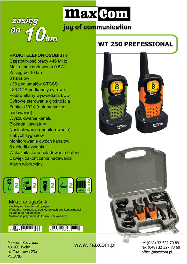 WT 250 PREFESSIONAL RADIOTELEFON OSOBISTY Czêstotliwoœæ pracy 446 MHz Maks. moc nadawania 0.5W Zasiêg do 10 km 8 kana³ów - 38 podkana³ów CTCSS - 83 DCS podkana³y cyfrowe Podœwietlany wyœwietlacz LCD Cyfrowe sterowanie g³oœnoœci¹ Funkcja VOX (automatyczne nadawanie) Wyszukiwanie kana³u Blokada klawiatury Nas³uchiwanie (monitorowanie) s³abych sygna³ów Monitorowanie dwóch kana³ów 5 melodii dzwonka WskaŸnik stanu na³adowania baterii DŸwiêk zakoñczenia nadawania Alarm wibracyjny Mikrofonog³oœnik z uchwytem i kablem skrêtnym Wygodna ³¹cznoœæ w obu kierunkach bez koniecznoœci siêgania po radiotelefon Mo¿liwoœæ przypiêcia do koszuli lub ko³nierza WT 250 PROF green/zielony 5 908235 971148 Maxcom Sp. z o.o. 43-100 Tychy, ul. Towarowa 23a POLAND WT 250 PROF orange/pomarañcz 5 908235 971117 www.maxcom.pl tel.(048) 32 327 70 89 fax (048) 32 327 78 60 [email protected]