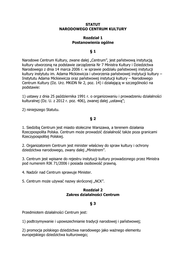 STATUT NARODOWEGO CENTRUM KULTURY Rozdział 1 Postanowienia ogólne §1 Narodowe Centrum Kultury, zwane dalej „Centrum”, jest państwową instytucją kultury utworzoną na podstawie zarządzenia Nr 7 Ministra Kultury i Dziedzictwa Narodowego z dnia 14 marca 2006 r. w sprawie podziału państwowej instytucji kultury instytutu im. Adama Mickiewicza i utworzenia państwowej instytucji kultury – Instytutu Adama Mickiewicza oraz państwowej instytucji kultury – Narodowego Centrum Kultury (Dz. Urz. MKiDN Nr 2, poz. 14) i działającą w szczególności na podstawie: 1) ustawy z dnia 25 października 1991 r. o organizowaniu i prowadzeniu działalności kulturalnej (Dz. U. z 2012 r. poz. 406), zwanej dalej „ustawą”; 2) niniejszego Statutu. §2 1. Siedzibą Centrum jest miasto stołeczne Warszawa, a terenem działania Rzeczpospolita Polska. Centrum może prowadzić działalność także poza granicami Rzeczypospolitej Polskiej. 2. Organizatorem Centrum jest minister właściwy do spraw kultury i ochrony dziedzictwa narodowego, zwany dalej „Ministrem”. 3. Centrum jest wpisane do rejestru instytucji kultury prowadzonego przez Ministra pod numerem RIK 71/2006 i posiada osobowość prawną. 4. Nadzór nad Centrum sprawuje Minister. 5. Centrum może używać nazwy skróconej „NCK”. Rozdział 2 Zakres działalności Centrum §3 Przedmiotem działalności Centrum jest: 1) podtrzymywanie i upowszechnianie tradycji narodowej i państwowej; 2) promocja polskiego dziedzictwa narodowego jako ważnego elementu europejskiego dziedzictwa kulturowego; 3) edukacja kulturalna oraz kreowanie zainteresowania kulturą i sztuką; 4) inspirowanie i wspomaganie działających w dziedzinie kultury i dziedzictwa narodowego osób fizycznych, prawnych i innych podmiotów; 5) prowadzenie informacji kulturalnej oraz prac badawczych i eksperckich w zakresie kultury i dziedzictwa narodowego oraz gromadzenie, przetwarzanie i udostępnianie informacji o procesach zachodzących w działalności kulturalnej, szczególnie nadzorowanej przez samorządy terytorialne; 6) pozyskiwanie środków pozabudżetowych z funduszy krajowych i zagranicznych, w tym Unii Europejskiej i wykorzystywanie ich na realizacją zadań Centrum; 7) stwarzanie możliwości podwyższania kwalifikacji kadr zajmujących się działalnością kulturalną oraz wymiany doświadczeń w tym zakresie; 8) przygotowywanie na potrzeby własne oraz administracji publicznej, szczególnie dla Ministra corocznych raportów z dziedziny objętej zakresem działalności Centrum. Tematyka i zakres corocznych raportów uzgadniane są z Ministrem; 9) analiza, dokumentowanie i upowszechnianie w skali międzynarodowej wiedzy o historii Polski i Europy XX wieku, w szczególności wiedzy o reżimach totalitarnych, cierpieniach ludności cywilnej, ofiarach wojen, ucisku, przymusowych wysiedleniach, represjach nacjonalistycznych, rasistowskich i innych motywowanych ideologicznie, a także wiedzy o sprzeciwie i o walce społeczeństw Europy Środkowej i Wschodniej z tymi reżimami. §4 Centrum realizuje zadania określone w § 3, w szczególności poprzez: 1) inicjowanie, prowadzenie i wspieranie projektów badawczych, edukacyjnych, kulturalnych, akcji społecznych realizujących cele Centrum, opracowywanie i zlecanie analiz i ekspertyz służących diagnozie oraz prognozowaniu kierunków rozwoju dziedziny objętej zakresem działania Centrum, na terenie kraju i poza jego granicami; 2) prowadzenie akcji promocyjnych i informacyjnych; 3) dokumentowanie działalności społeczno-kulturalnej; 4) gromadzenie i zarządzanie informacjami na temat wydarzeń i projektów kulturalnych, organizacji pozarządowych i instytucji kultury; 5) gromadzenie i upowszechnianie informacji na temat polskiego dziedzictwa narodowego na terenie kraju i poza jego granicami; 6) organizowanie na terenie kraju i poza jego granicami konferencji, seminariów, sympozjów, opracowywanie analiz, raportów i ekspertyz oraz upowszechnianie ich wyników; 7) organizowanie i prowadzenie kształcenia, szkoleń, doskonalenia zawodowego dla pracowników kultury oraz wolontariuszy i animatorów organizacji pozarządowych; 8) organizowanie imprez artystycznych i rozrywkowych; 9) prowadzenie działalności wydawniczej; 10) zawieranie umów i porozumień z innymi instytucjami jak również z organizacjami pozarządowymi w celu wspólnej realizacji lub zlecenia projektu realizującego cele Centrum; 11) organizowanie, na zlecenie Ministra, czynności związanych z przyznawaniem nagród i stypendiów Ministra, w tym ogłaszanie i przeprowadzanie konkursów; 12) realizowanie programów mających na celu finansowanie lub dofinansowanie zadań podmiotów prowadzących działalność w dziedzinie kultury i ochrony dziedzictwa narodowego, w zakresie działalności Centrum; 13) produkcję i koprodukcję telewizyjnych i radiowych audycji artystycznych oraz edukacyjno-informacyjnych związanych z kulturą w celu ich emisji w programach jednostek publicznej radiofonii i telewizji, innych nadawców lub w Internecie oraz rozporządzania nimi w inny sposób. Rozdział 3 Organizacja i zarządzanie §5 Organami Centrum są: Dyrektor Centrum, zwany dalej „Dyrektorem”, i Rada Programowa, zwana dalej „Radą”. §6 1. Dyrektor zarządza Centrum i reprezentuje je na zewnątrz. 2. Do obowiązków Dyrektora należy realizacja zadań statutowych, a w szczególności: 1) odpowiedzialność za bieżącą działalność Centrum; 2) przygotowywanie programów działania i planów finansowych Centrum na każdy rok kalendarzowy; 3) nadzór i koordynacja wykonania przygotowanych programów działania i planów finansowych Centrum; 4) sporządzanie sprawozdań merytorycznych i sprawozdań finansowych za każdy rok kalendarzowy i ich publikowanie; 5) wydawanie wewnętrznych regulaminów i innych dokumentów wewnętrznych Centrum. 3. Dyrektora powołuje i odwołuje Minister w trybie określonym ustawą. 4. Dyrektor zarządza Centrum przy p