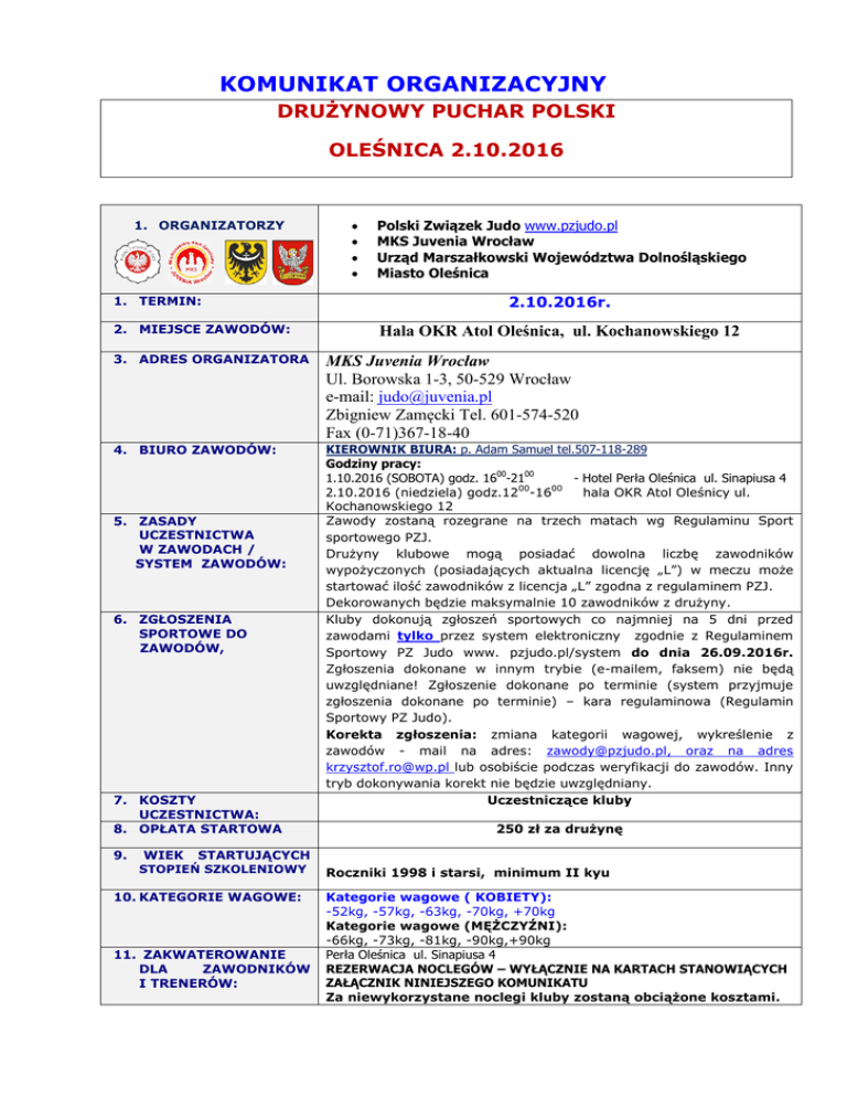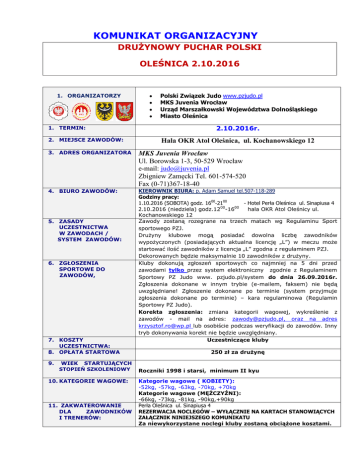 KOMUNIKAT ORGANIZACYJNY DRUŻYNOWY PUCHAR POLSKI OLEŚNICA 2.10.2016 1. ORGANIZATORZY 1. TERMIN: 2. MIEJSCE ZAWODÓW: Polski Związek Judo www.pzjudo.pl MKS Juvenia Wrocław Urząd Marszałkowski Województwa Dolnośląskiego Miasto Oleśnica 2.10.2016r. Hala OKR Atol Oleśnica, ul. Kochanowskiego 12 3. ADRES ORGANIZATORA MKS Juvenia Wrocław Ul. Borowska 1-3, 50-529 Wrocław e-mail: [email protected] Zbigniew Zamęcki Tel. 601-574-520 Fax (0-71)367-18-40 4. BIURO ZAWODÓW: KIEROWNIK BIURA: p. Adam Samuel tel.507-118-289 Godziny pracy: 1.10.2016 (SOBOTA) godz. 1600-2100 - Hotel Perła Oleśnica ul. Sinapiusa 4 2.10.2016 (niedziela) godz.1200-1600 hala OKR Atol Oleśnicy ul. Kochanowskiego 12 Zawody zostaną rozegrane na trzech matach wg Regulaminu Sport sportowego PZJ. Drużyny klubowe mogą posiadać dowolna liczbę zawodników wypożyczonych (posiadających aktualna licencję „L”) w meczu może startować ilość zawodników z licencja „L” zgodna z regulaminem PZJ. Dekorowanych będzie maksymalnie 10 zawodników z drużyny. Kluby dokonują zgłoszeń sportowych co najmniej na 5 dni przed zawodami tylko przez system elektroniczny zgodnie z Regulaminem Sportowy PZ Judo www. pzjudo.pl/system do dnia 26.09.2016r. Zgłoszenia dokonane w innym trybie (e-mailem, faksem) nie będą uwzględniane! Zgłoszenie dokonane po terminie (system przyjmuje zgłoszenia dokonane po terminie) – kara regulaminowa (Regulamin Sportowy PZ Judo). Korekta zgłoszenia: zmiana kategorii wagowej, wykreślenie z zawodów - mail na adres: [email protected], oraz na adres [email protected] lub osobiście podczas weryfikacji do zawodów. Inny tryb dokonywania korekt nie będzie uwzględniany. Uczestniczące kluby 5. ZASADY UCZESTNICTWA W ZAWODACH / SYSTEM ZAWODÓW: 6. ZGŁOSZENIA SPORTOWE DO ZAWODÓW, 7. KOSZTY UCZESTNICTWA: 8. OPŁATA STARTOWA 9. WIEK 250 zł za drużynę STARTUJĄCYCH STOPIEŃ SZKOLENIOWY 10. KATEGORIE WAGOWE: 11. ZAKWATEROWANIE DLA ZAWODNIKÓW I TRENERÓW: Roczniki 1998 i starsi, minimum II kyu Kategorie wagowe ( KOBIETY): -52kg, -57kg, -63kg, -70kg, +70kg Kategorie wagowe (MĘŻCZYŹNI): -66kg, -73kg, -81kg, -90kg,+90kg Perła Oleśnica ul. Sinapiusa 4 REZERWACJA NOCLEGÓW – WYŁĄCZNIE NA KARTACH STANOWIĄCYCH ZAŁĄCZNIK NINIEJSZEGO KOMUNIKATU Za niewykorzystane noclegi kluby zostaną obciążone kosztami. 12. ZAKWATEROWANIE DLA DELEGATÓW PZJUDO, KOMISARZA ZAWODÓW, SĘDZIÓW: 13. PROGRAM ZAWODÓW: 14. KOMISARZ ZAWODÓW 15. WERYFIKACJA DO LOSOWANIA: 16. KONFERENCJA TECHNICZNA I LOSOWANIE: 17. SĘDZIA GŁÓWNY 18. JUDOGI Hotel Perła Oleśnica ul. Sinapiusa 4 . 1.10.2016r. (sobota): 1600 – 2100 > Przyjazd, zakwaterowanie ekip 2000 – 2030 > weryfikacja wstępna 2100 > konferencja techniczna i losowanie 2.10.2016r. (niedziela): 700 - 800 – waga nieoficjalna 800 - 900 – waga oficjalna i przegląd lekarski drużyn kobiet i mężczyzn – Hotel Perła 925 - 940 – weryfikacja ostateczna - hala 1000 – walki eliminacyjne i repasażowe drużyn kobiet i mężczyzn: 5 min po zakończeniu walk eliminacyjnych i repasażowych - walki finałowe, 10 min po zakończeniu walk finałowych - dekoracja medalistów. Krzysztof Rogulski; tel. 534-651-939, e-mail: [email protected] Hotel Perła Oleśnica ul. Sinapiusa 4 Weryfikację do zawodów przeprowadza Komisarz zawodów w terminie : 1.10.2016r. > 2000 - 2030 Hotel Perła Oleśnica ul. Sinapiusa 4 1.10.2016r. (niedziela) > 2100 NA KONFERENCJI TECHNICZNEJ I LOSOWANIU OBOWIĄZUJE DRESS CODE sędzia główny uczestniczy w konferencji technicznej 20. CZAS WALKI 1. Kontrola judog odbywa się zgodnie z przepisami walki. 2. Do dekoracji obowiązuje judoga koloru białego. Waga kontrolna 1.10.2016r. (sobota) > od 1400 na hali zawodów Waga oficjalna Hotel Perła Oleśnica ul. Sinapiusa 4 2.10.2016r. (niedziela) w godzinach 800 - 900 Uwaga: Podczas ważenia należy posiadać dokument tożsamości oraz ważne badania lekarskie. Drużyny na wagę zgłaszają się w komplecie. Zawodniczki/zawodnicy startujący w LID – 1.10.2016r. – tolerancja 5%. Czas walki – 4 minuty kobiety, 5 minut mężczyźni 21. PRZEGLĄD LEKARSKI W trakcie ważenia oficjalnego 22. INNE INFORMACJE: Zawodniczki / zawodnicy muszą posiadać ważne ubezpieczenie od następstw nieszczęśliwych wypadków NNW. Zawodniczki/zawodnicy muszą posiadać aktualne orzeczenie lekarskie. Organizator nie ponosi odpowiedzialności za zaistniałe wydarzenia. Obowiązują zasady Dress Code oraz Code of Conduct for Judo Coeches 19. WAŻENIE ŻYCZYMY MIŁEGO POBYTU W OLEŚNICY