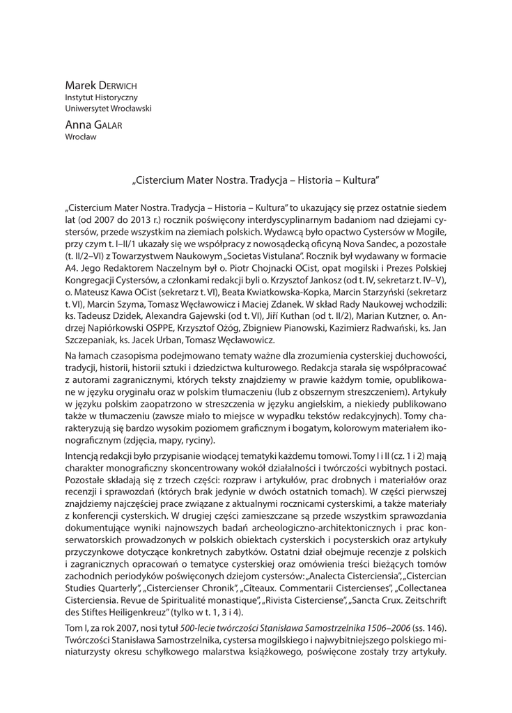 Marek Derwich Instytut Historyczny Uniwersytet Wrocławski Anna Galar Wrocław „Cistercium Mater Nostra. Tradycja – Historia – Kultura” „Cistercium Mater Nostra. Tradycja – Historia – Kultura” to ukazujący się przez ostatnie siedem lat (od 2007 do 2013 r.) rocznik poświęcony interdyscyplinarnym badaniom nad dziejami cystersów, przede wszystkim na ziemiach polskich. Wydawcą było opactwo Cystersów w Mogile, przy czym t. I–II/1 ukazały się we współpracy z nowosądecką oficyną Nova Sandec, a pozostałe (t. II/2–VI) z Towarzystwem Naukowym „Societas Vistulana”. Rocznik był wydawany w formacie A4. Jego Redaktorem Naczelnym był o. Piotr Chojnacki OCist, opat mogilski i Prezes Polskiej Kongregacji Cystersów, a członkami redakcji byli o. Krzysztof Jankosz (od t. IV, sekretarz t. IV–V), o. Mateusz Kawa OCist (sekretarz t. VI), Beata Kwiatkowska-Kopka, Marcin Starzyński (sekretarz t. VI), Marcin Szyma, Tomasz Węcławowicz i Maciej Zdanek. W skład Rady Naukowej wchodzili: ks. Tadeusz Dzidek, Alexandra Gajewski (od t. VI), Jiří Kuthan (od t. II/2), Marian Kutzner, o. Andrzej Napiórkowski OSPPE, Krzysztof Ożóg, Zbigniew Pianowski, Kazimierz Radwański, ks. Jan Szczepaniak, ks. Jacek Urban, Tomasz Węcławowicz. Na łamach czasopisma podejmowano tematy ważne dla zrozumienia cysterskiej duchowości, tradycji, historii, historii sztuki i dziedzictwa kulturowego. Redakcja starała się współpracować z autorami zagranicznymi, których teksty znajdziemy w prawie każdym tomie, opublikowane w języku oryginału oraz w polskim tłumaczeniu (lub z obszernym streszczeniem). Artykuły w języku polskim zaopatrzono w streszczenia w języku angielskim, a niekiedy publikowano także w tłumaczeniu (zawsze miało to miejsce w wypadku tekstów redakcyjnych). Tomy charakteryzują się bardzo wysokim poziomem graficznym i bogatym, kolorowym materiałem ikonograficznym (zdjęcia, mapy, ryciny). Intencją redakcji było przypisanie wiodącej tematyki każdemu tomowi. Tomy I i II (cz. 1 i 2) mają charakter monograficzny skoncentrowany wokół działalności i twórczości wybitnych postaci. Pozostałe składają się z trzech części: rozpraw i artykułów, prac drobnych i materiałów oraz recenzji i sprawozdań (których brak jedynie w dwóch ostatnich tomach). W części pierwszej znajdziemy najczęściej prace związane z aktualnymi rocznicami cysterskimi, a także materiały z konferencji cysterskich. W drugiej części zamieszczane są przede wszystkim sprawozdania dokumentujące wyniki najnowszych badań archeologiczno-architektonicznych i prac konserwatorskich prowadzonych w polskich obiektach cysterskich i pocysterskich oraz artykuły przyczynkowe dotyczące konkretnych zabytków. Ostatni dział obejmuje recenzje z polskich i zagranicznych opracowań o tematyce cysterskiej oraz omówienia treści bieżących tomów zachodnich periodyków poświęconych dziejom cystersów: „Analecta Cisterciensia”, „Cistercian Studies Quarterly”, „Cistercienser Chronik”, „Cîteaux. Commentarii Cistercienses”, „Collectanea Cisterciensia. Revue de Spiritualité monastique”, „Rivista Cisterciense”, „Sancta Crux. Zeitschrift des Stiftes Heiligenkreuz” (tylko w t. 1, 3 i 4). Tom I, za rok 2007, nosi tytuł 500-lecie twórczości Stanisława Samostrzelnika 1506–2006 (ss. 146). Twórczości Stanisława Samostrzelnika, cystersa mogilskiego i najwybitniejszego polskiego miniaturzysty okresu schyłkowego malarstwa książkowego, poświęcone zostały trzy artykuły. 408 Tu warto zajrzeć M. Zdanek i M. Starzyński ukazali zarys dziejów opactwa w czasach artystycznej działalności Samostrzelnika, Barbara Miodońska scharakteryzowała jego twórczość malarską, a M. Starzyński omówił rolę i funkcje herbów w miniaturach jego autorstwa. Znajdziemy tu poza tym charakterystykę duchowości cysterskiej (o. Iwo Kołodziejczyk OCist), pierwszą część opracowania rezultatów prac konserwatorskich prowadzonych w krużgankach klasztoru w Mogile w latach 2006–2007 (T. Węcławowicz) oraz opracowanie średniowiecznej genezy kompozycji krajobrazowej w opactwie w Rudach (o. Dariusz Tabor CR). Tom II, za 2008 r., jako jedyny składa się z dwóch części. Część 1, zatytułowaną Aelred z Rievaulx – myśl i czasy (pod redakcją M. Starzyńskiego, ss. 195), w całości poświęcono myśli i biografii jednego z ojców duchowości cysterskiej, angielskiego mnicha Aelreda z Rievaulx, którego 900. rocznica urodzin przypadła w 2007 r. Wszystkie prace zostały opublikowane w polskiej i obcojęzycznej (angielskiej, włoskiej lub czeskiej) wersji językowej. David H. Williams przedstawił rozwój fundacji cysterskich w Anglii w latach 1143–1167, B. Kwiatkowska-Kopka – przypadającą na okres piastowania tu przez Aelreda godności opackiej przebudowę opactwa Rievaulx, a o. Bernard A. Grenz OCist opublikował w polskim tłumaczeniu i opatrzył komentarzem list św. Bernarda z Clairvaux do Aelreda z Rievaulx, polecający mu napisanie jego największego dzieła – Zwierciadła miłości. Większość prac poświęcona jest myśli Aelreda: teologii przyjaźni, uznanej za „hermeneutyczny klucz” do jego dzieł (o. Wincenty W. Polek OCist), teorii trzech szabatów – ikon odpoczynku – jako formie życia duchowego (Domenico Pezzini), porządkowi natury rozumianemu jako wieczny odpoczynek wszystkich bytów (o. Ryszard Groń OCist), a także Aelredowi jako wychowawcy mnichów, pomagającemu im odnaleźć w klasztorze własne doświadczenie duchowe (o. Alexius Vandrovec OSB). Poza tym Andrzej M. Wyrwa omówił ideę i przebieg szlaku cysterskiego na ziemiach polskich. Część 2, zatytułowana Błogosławiony Wincenty Kadłubek. W 800-lecie sakry biskupiej (pod redakcją M. Starzyńskiego i M. Zdanka, ss. 332), stanowi pokłosie konferencji zorganizowanej 3 XI 2008 r. przez opactwo Cystersów w Mogile, Archiwum i Bibliotekę Krakowskiej Kapituły Katedralnej