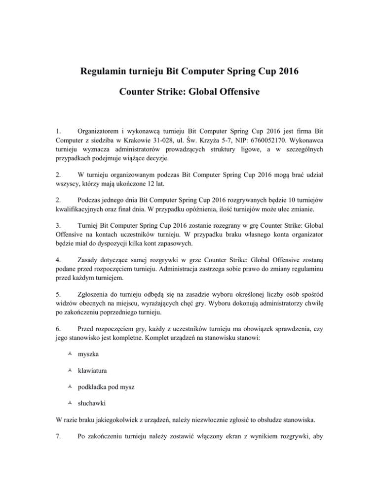 Regulamin turnieju Bit Computer Spring Cup 2016 Counter Strike: Global Offensive 1. Organizatorem i wykonawcą turnieju Bit Computer Spring Cup 2016 jest firma Bit Computer z siedziba w Krakowie 31-028, ul. Św. Krzyża 5-7, NIP: 6760052170. Wykonawca turnieju wyznacza administratorów prowadzących struktury ligowe, a w szczególnych przypadkach podejmuje wiążące decyzje. 2. W turnieju organizowanym podczas Bit Computer Spring Cup 2016 mogą brać udział wszyscy, którzy mają ukończone 12 lat. 2. Podczas jednego dnia Bit Computer Spring Cup 2016 rozgrywanych będzie 10 turniejów kwalifikacyjnych oraz finał dnia. W przypadku opóźnienia, ilość turniejów może ulec zmianie. 3. Turniej Bit Computer Spring Cup 2016 zostanie rozegrany w grę Counter Strike: Global Offensive na kontach uczestników turnieju. W przypadku braku własnego konta organizator będzie miał do dyspozycji kilka kont zapasowych. 4. Zasady dotyczące samej rozgrywki w grze Counter Strike: Global Offensive zostaną podane przed rozpoczęciem turnieju. Administracja zastrzega sobie prawo do zmiany regulaminu przed każdym turniejem. 5. Zgłoszenia do turnieju odbędą się na zasadzie wyboru określonej liczby osób spośród widzów obecnych na miejscu, wyrażających chęć gry. Wyboru dokonują administratorzy chwilę po zakończeniu poprzedniego turnieju. 6. Przed rozpoczęciem gry, każdy z uczestników turnieju ma obowiązek sprawdzenia, czy jego stanowisko jest kompletne. Komplet urządzeń na stanowisku stanowi: myszka klawiatura podkładka pod mysz słuchawki W razie braku jakiegokolwiek z urządzeń, należy niezwłocznie zgłosić to obsłudze stanowiska. 7. Po zakończeniu turnieju należy zostawić włączony ekran z wynikiem rozgrywki, aby umożliwić administracji wyłonienie zwycięzcy. 8. Zwycięzca turnieju otrzymuje awans do finału dnia, który odbywa się każdego dnia w okolicach godziny 19. Zwycięzca jest zobligowany do podania danych osobowych, które pozwolą administracji zidentyfikowanie go przed rozpoczęciem finału dnia oraz do stawienia się o godzinie 19 na miejscu odbywania się imprezy. 9. W przypadku, gdy podczas finału ilość zakwalifikowanych zawodników będzie mniejsza niż 10, zostanie rozegrany dodatkowy turniej uzupełniający. Turniej uzupełniający może się różnić zasadami od pozostałych turniejów. W przypadku, gdy po turnieju uzupełniającym nie będzie dostępna pełna grupa finalistów, brakujące osoby zostaną dobrane z widowni. 10. Każdy z uczestników może wystąpić w turnieju raz dziennie. 11. Nagrodzeni są najlepsi trzej zawodnicy w finale dnia. Odbiór nagród za czołowe miejsca w turnieju odbywa się wyłącznie w dniu turnieju. Nie ma możliwości odebrania nagrody w dniu późniejszym: 12. Nagrody nie podlegają wymianie na inny sprzęt bądź też ekwiwalent pieniężny. Zwycięzca ma prawo zrzec się nagrody. 13. Na teren stoiska podczas gry nie wolno spożywać jedzenia oraz picia. 14. Uczestnicy są zobowiązani do zachowania kultury. Osoby zachowujące się wulgarnie, agresywnie bądź w innym stopniu niewłaściwie będą dyskwalifikowane. 15. Uczestnicy są zobowiązani do zachowania porządku na swoim stanowisku gry. Po zakończeniu gry należy sprawdzić swoje stanowisko pod względem czystości. 16. W przypadkach spornych, nieokreślonych w regulaminie, decyzje podejmuje administracja turnieju.
