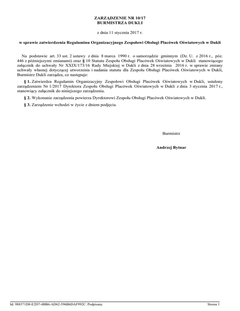 ZARZĄDZENIE NR 10/17 BURMISTRZA DUKLI z dnia 11 stycznia 2017 r. w sprawie zatwierdzenia Regulaminu Organizacyjnego Zespołowi Obsługi Placówek Oświatowych w Dukli Na podstawie art. 33 ust. 2 ustawy z dnia 8 marca 1990 r. o samorządzie gminnym (Dz. U. z 2016 r., póz. 446 z późniejszymi zmianami) oraz § 10 Statutu Zespołu Obsługi Placówek Oświatowych w Dukli stanowiącego załącznik do uchwały Nr XXIX/173/16 Rady Miejskiej w Dukli z dnia 28 września 2016 r. w sprawie zmiany uchwały własnej dotyczącej utworzenia i nadania statutu dla Zespołu Obsługi Placówek Oświatowych w Dukli, Burmistrz Dukli zarządza, co następuje: § 1. Zatwierdza Regulamin Organizacyjny Zespołowi Obsługi Placówek Oświatowych w Dukli, ustalony zarządzeniem Nr 1/2017 Dyrektora Zespołu Obsługi Placówek Oświatowych w Dukli z dnia 3 stycznia 2017 r., stanowiący załącznik do niniejszego zarządzenia. § 2. Wykonanie zarządzenia powierza Dyrektorowi Zespołu Obsługi Placówek Oświatowych w Dukli. § 3. Zarządzenie wchodzi w życie z dniem podjęcia. Burmistrz Andrzej Bytnar Id: 988571D8-E2D7-4BB6-AD62-596B6DAF992C. Podpisany Strona 1 Załącznik do zarządzenia Nr 10/17 Burmistrza Dukli z dnia 11 stycznia 2017 r. REGULAMIN ORGANIZACYJNY ZESPOŁU OBSŁUGI PLACÓWEK OŚWIATOWYCH W DUKLI Postanowienia ogólne § 1. 1. Niniejszy Regulamin Organizacyjny określa organizację wewnętrzną i zasady funkcjonowania Zespołu Obsługi Placówek Oświatowych w Dukli, zwany dalej „ZOPO". 2. ZOPO zapewnia wspólną obsługę, w szczególności administracyjną finansową i organizacyjną, o których mowa w art. 10a o samorządzie gminnym oraz zapewnia realizację zadań własnych gminy i zleconych w zakresie edukacji publicznej. 3. Podstawy prawne oraz szczegółowy przedmiot i zakres działania określa Statut ZOPO 4. Ilekroć w regulaminie organizacyjnym ZOPO w Dukli jest mowa o: 1) Burmistrzu - należy przez to rozumieć Burmistrza Dukli; 2) Dyrektorze - należy przez to rozumieć Dyrektora ZOPO w Dukli; 3) Dyrektorach szkół - należy przez to rozumieć dyrektorów obsługiwanych jednostek oświatowych; 4) Główny Księgowy - należy przez to rozumieć Głównego Księgowego ZOPO; 5) Statucie - należy przez to rozumieć Statut ZOPO w Dukli, stanowiący załącznik do uchwały Rady Miejskiej w Dukli; 5. ZOPO działa na podstawie uchwały Nr XXIX/172/16 Rady Miejskiej w Dukli z dnia 28 września 2016 r. w sprawie określenia jednostki obsługującej, jednostek obsługiwanych, zakresu obowiązku powierzonych jednostce obsługującej w ramach wspólnej obsług oraz uchwały Nr XI/79/03 Rady Miejskiej w Dukli z dnia 29 września 2003 r. w sprawie utworzenia i nadania statutu dla Zespołu Obsługi Placówek Oświatowych w Dukli zmienionej uchwałami: Nr XVI/98/11 Rady Miejskiej w Dukli z dnia 29 listopada 2011 r. w sprawie zmianu uchwały własnej dotyczącej utworzenia i nadania statutu dla Zespołu Obsługi Placówek Oświatowych w Dukli i Nr XXIX/173/16 Rady Miejskiej w Dukli z dnia 28 września 2016 r. sprawie zmiany uchwały własnej dotyczącej utworzenia i nadania statutu dla Zespołu Obsługi Placówek Oświatowych w Dukli. § 2. 1. ZOPO jest jednostką organizacyjną Gminy Dukla. 2. Siedziba ZOPO mieści się w budynku Urzędu Miejskiego w Dukli, przy ul. Trakt Węgierski nr 11. 3. ZOPO pracuje w godzinach pracy wyznaczonych dla Urzędu Miejskiego w Dukli tj. od poniedziałku do piątku 7:00 – 15:00. 4. Nadzór i kontrolę nad działalnością ZOPO sprawuje Rada Miejska w Dukli, a bieżący nadzór - Burmistrz. § 3. 1. Dyrektor ZOPO kieruje działalnością jednostki i reprezentuje ją na zewnątrz. 2. Dyrektor ZOPO działa na podstawie pełnomocnictwa udzielonego przez Burmistrza i upoważnień nadanych uchwałą przez Radę Miejską w Dukli 3. Dyrektora zatrudnia i zwalnia Burmistrz. 4. Dyrektor ZOPO jest kierownikiem zakładu pracy (pracodawcą) w rozumieniu przepisów prawa pracy. 5. Dyrektor i pracownicy ZOPO są pracownikami samorządowymi. 6. W przypadku nieobecności Dyrektora ZOPO, jego obowiązki na ten czas pełni upoważniony pracownik. Struktura organizacyjna § 4. 1. Dyrektor ZOPO kieruje jednostką poprzez wydawanie zarządzeń, instrukcji, regulaminów oraz poleceń służbowych. Id: 988571D8-E2D7-4BB6-AD62-596B6DAF992C. Podpisany Strona 1 2. W skład Zespołu wchodzą następujące stanowiska pracy: 1) Dyrektor - 1 etat, 2) Główny Księgowy - 1 etat, 3) Inspektor d/s księgowo - finansowych - 2,5 etatu, 4) Inspektor d/s kadrowych i administracyjnych - 1 etat, 5) Referent– 0,5 etat, 6) Inspektor d/s kadr i płac - 2 etaty. 3. Poszczególne stanowiska pracy podejmują działania i prowadzą sprawy związane z realizacją zadań ZOPO w zakresie określonym w statucie. 4. Szczegółowy zakres czynności, uprawnień i odpowiedzialności dla pracowników ZOPO ustala Dyrektor, kierując się pragmatyzmem i zasadą równomiernego obciążenia pracowników zadaniami 5. Główny Księgowy odpowiada bezpośrednio przed Dyrektorem za prawidłową i terminową realizacje zadań z zakresu rachunkowości, sprawozdawczości budżetowej i finansowej oraz gospodarki finansowej. 6. W celu zapewnienia sprawnej realizacji zadań ZOPO, Dyrektor (po wyrażeniu zgody przez Burmistrza), w ramach robót publicznych, prac interwencyjnych i staży może tworzyć stanowiska obsługi. 7. Schemat struktury organizacyjnej ZOPO stanowi załącznik nr 1 do niniejszego regulaminu. Zakres działania § 5. 1. Przedmiotem działalności ZOPO jest prowadzenie wspólnej obsługi administracyjnej, finansowej i organizacyjnej jednostek obsługiwanych, o których mowa w art. 10a ustawy o samorządzie gminnym oraz zapewnienie realizacji zadań własnych gminy i zleconych z zakresu edukacji publicznej z oświaty. 2. Do podstawowych zadań ZOPO należy w szczególności: 1) prowadzenie obsługi rachunków bankowych, 2) opracowywanie projektów planów dochodów i wydatków budżetowych, planów rachunków do
