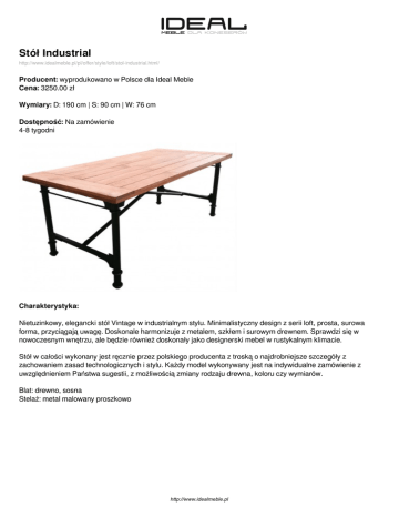 Stół Industrial http://www.idealmeble.pl/pl/offer/style/loft/stol-industrial.html/ Producent: wyprodukowano w Polsce dla Ideal Meble Cena: 3250.00 zł Wymiary: D: 190 cm | S: 90 cm | W: 76 cm Dostępność: Na zamówienie 4-8 tygodni Charakterystyka: Nietuzinkowy, elegancki stół Vintage w industrialnym stylu. Minimalistyczny design z serii loft, prosta, surowa forma, przyciągają uwagę. Doskonale harmonizuje z metalem, szkłem i surowym drewnem. Sprawdzi się w nowoczesnym wnętrzu, ale będzie również doskonały jako designerski mebel w rustykalnym klimacie. Stół w całości wykonany jest ręcznie przez polskiego producenta z troską o najdrobniejsze szczegóły z zachowaniem zasad technologicznych i stylu. Każdy model wykonywany jest na indywidualne zamówienie z uwzględnieniem Państwa sugestii, z możliwością zmiany rodzaju drewna, koloru czy wymiarów. Blat: drewno, sosna Stelaż: metal malowany proszkowo http://www.idealmeble.pl Dostępne wersje produktu: nazwa produktu Stół Industrial warianty blat sosna drewno, kolor naturalny cena 3250.00zł http://www.idealmeble.pl dostępne 4-8 tygodni Zdjęcia produktu: http://www.idealmeble.pl Powered by TCPDF (www.tcpdf.org)