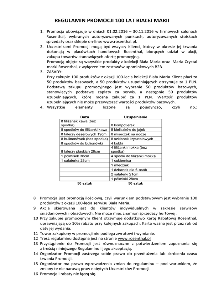 REGULAMIN PROMOCJI 100 LAT BIAŁEJ MARII 1. Promocja obowiązuje w dniach 01.02.2016 – 30.11.2016 w firmowych salonach Rosenthal, wybranych autoryzowanych punktach, autoryzowanych stoiskach sprzedaży oraz sklepie on-line: www.rosenthal.pl. 2. Uczestnikami Promocji mogą być wszyscy Klienci, którzy w okresie jej trwania dokonają w placówkach handlowych Rosenthal, biorących udział w akcji, zakupu towarów stanowiących ofertę promocyjną. Promocją objęte są wszystkie produkty z kolekcji Biała Maria oraz Maria Crystal marki Rosenthal, z wyłączeniem zestawów upominkowych B2B. 3. ZASADY: Przy zakupie 100 produktów z okazji 100-lecia kolekcji Biała Maria Klient płaci za 50 produktów bazowych, a 50 produktów uzupełniających otrzymuje za 1 PLN. Podstawą zakupu promocyjnego jest wybranie 50 produktów bazowych, stanowiących podstawę zapłaty za serwis, a następnie 50 produktów uzupełniających, które można zakupić za 1 PLN. Wartość produktów uzupełniających nie może przewyższać wartości produktów bazowych. 4. Wszystkie elementy liczone są pojedynczo, czyli np.: Baza 8 filiżanek kawa (bez spodka) 8 spodków do filiżanki kawa 8 talerzy deserowych 19cm 8 bulinonówek (bez spodka) 8 spodków do bulionówki 8 talerzy płaskich 26cm 1 półmisek 38cm 1 salaterka 28cm 50 sztuk Uzupełnienie 8 kompotierek 8 kieliszków do jajek 8 miseczek na nodze 8 szklanek kryształowych 4 kubki 4 filiżanki mokka (bez spodka) 4 spodki do filiżanki mokka 1 cukiernica 1 mlecznik 1 dzbanek dla 6-osób 2 salaterki 21cm 1 półmiski 28cm 50 sztuk 8 Promocja jest promocją ilościową, czyli warunkiem podstawowym jest wybranie 100 produktów z okazji 100-lecia serwisu Biała Maria. 9 Akcja skierowana jest do klientów indywidualnych w zakresie serwisów śniadaniowych i obiadowych. Nie może mieć znamion sprzedaży hurtowej. 10 Przy zakupie promocyjnym Klient otrzymuje dodatkowo Kartę Rabatową Rosenthal, uprawniającą do 10% rabatu przy kolejnych zakupach. Karta ważna jest przez rok od daty jej wydania. 11 Towar zakupiony w promocji nie podlega zwrotowi i wymianie. 12 Treść regulaminu dostępna jest na stronie www.rosenthal.pl 13 Przystąpienie do Promocji jest równoznaczne z potwierdzeniem zapoznania się z treścią niniejszego Regulaminu i jego akceptacją. 14 Organizator Promocji zastrzega sobie prawo do przedłużenia lub skrócenia czasu trwania Promocji. 15 Organizator ma prawo wprowadzenia zmian do regulaminu – pod warunkiem, że zmiany te nie naruszą praw nabytych Uczestników Promocji. 16 Promocje i rabaty nie łączą się.