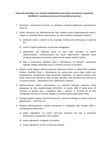 Załącznik określający cel i sposób wydatkowania darowizny pieniężnej w wysokości 20.000,00 zł przekazanej UŁ przez Panią Helenę Kacprzyk 1. Darowizna umieszczona zostanie na odrębnym rachunku bankowym, prowadzonym przez UŁ. 2. Celem darowizny jest dofinansowanie toku studiów osoby rozpoczynającej studia II stopnia na Wydziale Nauk o Wychowaniu UŁ, która spełnia następujące kryteria: a) ukończyła studia I stopnia na UŁ, uzyskując średnią ocen wynoszącą co najmniej 4,5; b) studia II stopnia podejmuje na kierunku pedagogika; c) wykonywała lub wykonuje pracę na rzecz ludzi starszych, co potrafi udokumentować zaświadczeniem lub innym dokumentem wydanym przez instytucję zajmującą się pomocą społeczną lub opieką nad tymi ludźmi; d) złoży w Dziekanacie Wydziału Nauk o Wychowaniu UŁ wniosek o przyznanie nagrody według ustalonego wzoru w terminie do dnia 25.10.2012r.; 3. Wyboru osoby objętej dofinansowaniem dokonuje komisja, w skład której wchodzą Dziekan Wydziału Nauk o Wychowaniu lub wyznaczona przez niego osoba oraz przedstawiciel Wydziałowej Rady Samorządu Studentów. W pracach komisji może także uczestniczyć darczyńca, który ma głos doradczy. Jeśli darczyńca nie uczestniczy w pracach komisji, informowany jest o dokonanym wyborze. 4. Dofinansowanie będzie przekazywane na rachunek bankowy wybranej osoby począwszy od roku akademickiego 2012/2013, w kwocie 1000 zł brutto przez 10 miesięcy w każdym roku z wyjątkiem lipca i sierpnia, w terminie do 20 dnia następnego miesiąca za miesiąc ubiegły, aż do wyczerpania jego pełnej kwoty. 5. Obsługę wypłat zapewnia Dział Finansowy UŁ, natomiast obsługę w zakresie rozliczeń podatkowych – Dział Płac UŁ. 6. Wypłata dofinansowania zostaje wstrzymana w przypadku, gdy wystąpi jedna z następujących okoliczności: a) osoba nagrodzona nie uzyska zaliczenia semestru lub roku w terminach określonych w regulaminie toku studiów; b) osoba nagrodzona zrezygnuje ze studiów; c) osoba nagrodzona zmieni uczelnię lub wydział; 7. W razie wstrzymania wypłat, pozostałą do wykorzystania kwotę dofinansowania przyznaje się innej osobie, spośród tych, które spełniły kryteria określone w pkt 2. Zasady określone w pkt 3-6 stosuje się analogicznie. 8. Jeśli w roku akademickim 2012/2013 nikt nie spełni kryteriów wskazanych w ust. 2, dofinansowanie zostanie przyznane w latach następnych, według zasad określonych w niniejszym załączniku.