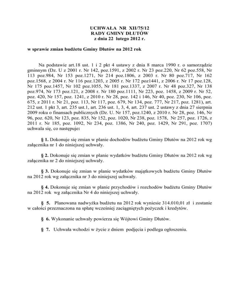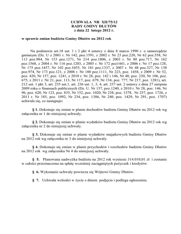 UCHWAŁA NR XII/75/12 RADY GMINY DŁUTÓW z dnia 22 lutego