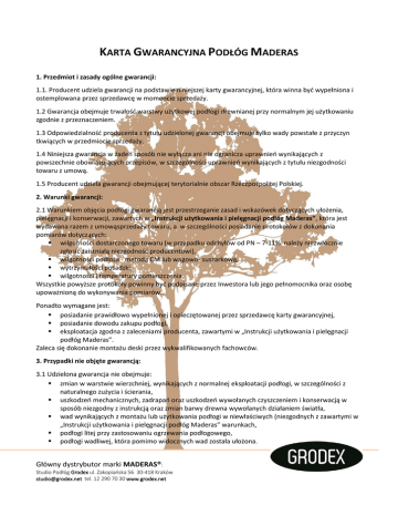 KARTA GWARANCYJNA PODŁÓG MADERAS 1. Przedmiot i zasady ogólne gwarancji: 1.1. Producent udziela gwarancji na podstawie niniejszej karty gwarancyjnej, która winna być wypełniona i ostemplowana przez sprzedawcę w momencie sprzedaży. 1.2 Gwarancja obejmuje trwałość warstwy użytkowej podłogi drewnianej przy normalnym jej użytkowaniu zgodnie z przeznaczeniem. 1.3 Odpowiedzialność producenta z tytułu udzielonej gwarancji obejmuje tylko wady powstałe z przyczyn tkwiących w przedmiocie sprzedaży. 1.4 Niniejsza gwarancja w żaden sposób nie wyłącza ani nie ogranicza uprawnień wynikających z powszechnie obowiązujących przepisów, w szczególności uprawnień wynikających z tytułu niezgodności towaru z umową. 1.5 Producent udziela gwarancji obejmującej terytorialnie obszar Rzeczpospolitej Polskiej. 2. Warunki gwarancji: 2.1 Warunkiem objęcia podłogi gwarancją jest przestrzeganie zasad i wskazówek dotyczących ułożenia, pielęgnacji i konserwacji, zawartych w „Instrukcji użytkowania i pielęgnacji podłóg Maderas”, która jest wydawana razem z umowąsprzedaży towaru, a w szczególności posiadanie protokołów z dokonania pomiarów dotyczących: wilgotności dostarczonego towaru (w przypadku odchyłów od PN – 7-11% należy niezwłocznie zgłosić zaistniałą niezgodność producentowi), wilgotności podłoża - metodą CM lub wagowo- suszarkową, wytrzymałości posadzki, wilgotności i temperatury pomieszczenia, Wszystkie powyższe protokoły powinny być podpisane przez Inwestora lub jego pełnomocnika oraz osobę upoważnioną do wykonywania pomiarów. Ponadto wymagane jest: posiadanie prawidłowo wypełnionej i opieczętowanej przez sprzedawcę karty gwarancyjnej, posiadanie dowodu zakupu podłogi, eksploatacja zgodna z zaleceniami producenta, zawartymi w „Instrukcji użytkowania i pielęgnacji podłóg Maderas”. Zaleca się dokonanie montażu deski przez wykwalifikowanych fachowców. 3. Przypadki nie objęte gwarancją: 3.1 Udzielona gwarancja nie obejmuje: zmian w warstwie wierzchniej, wynikających z normalnej eksploatacji podłogi, w szczególności z naturalnego zużycia i ścierania, uszkodzeń mechanicznych, zadrapań oraz uszkodzeń wywołanych czyszczeniem i konserwacją w sposób niezgodny z instrukcją oraz zmian barwy drewna wywołanych działaniem światła, wad wynikających z montażu lub użytkowania podłogi w niewłaściwych (niezgodnych z zawartymi w „Instrukcji użytkowania i pielęgnacji podłóg Maderas” warunkach, podłogi litej przy zastosowaniu ogrzewania podłogowego, podłogi wadliwej, która pomimo widocznych wad została ułożona. Główny dystrybutor marki MADERAS®: Studio Podłóg Grodex ul. Zakopiańska 56 30-418 Kraków [email protected] tel. 12 290 70 30 www.grodex.net 4. Zgłaszanie reklamacji: 4.1 W wypadku stwierdzenia wadliwości podłogi, w świetle zasad wskazanych w niniejszej karcie gwarancyjnej, należy zgłosić reklamację. Reklamacje dotyczące towaru, kwestionujące selekcję materiału mogą być rozpatrywane wyłącznie przed położeniem. 4.2 Reklamację należy zgłaszać w formie pisemnej (listownie lub pocztą elektroniczną), w nieprzekraczalnym terminie 14 dni od wystąpienia wady/ujawnienia się wady. 4.3 Reklamacja powinna być zgłoszona do sprzedawcy, u którego zakupiona została podłoga. Do reklamacji należy załączyć dokumenty wymienione w pkt. 2.1 niniejszej gwarancji, a w miarę możliwości także dokumentację fotograficzną wadliwej podłogi. 5. Sposoby rozpatrzenia reklamacji: 5.1 W celu zweryfikowania zasadności roszczeń gwarancyjnych producent zastrzega sobie prawo oględzin wadliwej podłogi w miejscu jej ułożenia w uzgodnionym terminie. Podmiot zgłaszający reklamację powinien powołać rzeczoznawcę ze Stowarzyszenia Parkieciarzy Polskich lub Ogólnopolskiego Stowarzyszenia Parkieciarzy.Koszty związane z oględzinami i wydaniem ekspertyzy ponosi strona odpowiedzialna za wszelkie nieprawidłowości wynikające z jej winy. 5.2 Reklamacja zostanie rozpatrzona w terminie 21 dni od daty zgłoszenia reklamacji, a w wypadku przeprowadzenia oględzin, w terminie 21 dni od daty ich ukończenia. O sposobie załatwienia roszczeń gwarancyjnych producent zawiadamia na piśmie, telefonicznie lub pocztą elektroniczną. 5.3 W razie uwzględnienia reklamacji w okresie gwarancji Producent może wymienić wadliwy produkt na wolny od wad, albo nieodpłatnie usunąć wszelkie usterki wynikające z ukrytych wad materiałowych lub konstrukcyjnych podłogi. 5.4 Odpowiedzialność Producenta w żadnym wypadku nie może przekroczyć wartości zakupionej podłogi. nazwa handlowa podłogi data sprzedaży pieczęć i podpis sprzedawcy nr zamówienia Główny dystrybutor marki MADERAS®: Studio Podłóg Grodex ul. Zakopiańska 56 30-418 Kraków [email protected] tel. 12 290 70 30 www.grodex.net