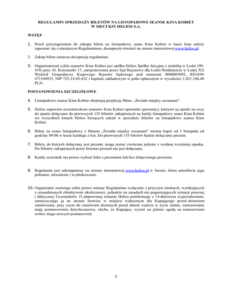 REGULAMIN SPRZEDAŻY BILETÓW NA LISTOPADOWE SEANSE KINA KOBIET W SIECI KIN HELIOS S.A. WSTĘP 1. Przed przystąpieniem do zakupu biletu na listopadowy seans Kina Kobiet w kasie kina należy zapoznać się z niniejszym Regulaminem, dostępnym również na stronie internetowej www.helios.pl 2. Zakup biletu oznacza akceptację regulaminu. 3. Organizatorem cyklu seansów Kina Kobiet jest spółka Helios Spółka Akcyjna z siedzibą w Łodzi (90418) przy Al. Kościuszki 17, zarejestrowana przez Sąd Rejonowy dla Łodzi-Śródmieścia w Łodzi XX Wydział Gospodarczy Krajowego Rejestru Sądowego pod numerem 0000005092, REGON 471544933, NIP 725-14-82-632 i kapitale zakładowym w pełni opłaconym w wysokości 1.021.346,40 PLN. POSTANOWIENIA SZCZEGÓŁOWE 4. Listopadowe seanse Kina Kobiet obejmują projekcję filmu: „Światło między oceanami”. 5. Helios zapewnia uczestniczkom seansów Kina Kobiet upominki (prezenty), którymi są opaski na oczy do spania dołączane do pierwszych 135 biletów zakupionych na każdy listopadowy seans Kina Kobiet we wszystkich kinach Helios biorących udział w sprzedaży biletów na listopadowe seanse Kina Kobiet. 6. Bilety na seans listopadowy z filmem „Światło między oceanami” można kupić od 1 listopada od godziny 09:00 w kasie każdego z kin. Do pierwszych 135 biletów będzie dołączany prezent. 7. Bilety, do których dołączany jest prezent, mogą zostać zwrócone jedynie z wydaną wcześniej opaską. Do biletów zakupionych przez Internet prezent nie jest dołączany. 8. Każdy uczestnik ma prawo wybrać bilet z prezentem lub bez dołączonego prezentu. 9. Regulamin jest udostępniony na stronie internetowej www.helios.pl w formie, która umożliwia jego pobranie, utrwalenie i wydrukowanie. 10. Organizator zastrzega sobie prawo zmiany Regulaminu wyłącznie z przyczyn istotnych, wynikających z uzasadnionych obiektywnie okoliczności, jednakże na zasadach nie pogorszających sytuacji prawnej i faktycznej Uczestników. O planowanej zmianie Helios poinformuje z 14-dniowym wyprzedzeniem, zamieszczając ją na stronie Serwisu w miejscu widocznym dla Kupującego przed złożeniem zamówienia, przy czym do zamówień złożonych przed dniem wejścia w życie zmian, zastosowania mają postanowienia dotychczasowe, chyba, że Kupujący wyrazi na piśmie zgodę na zastosowanie wobec niego nowych postanowień. 1