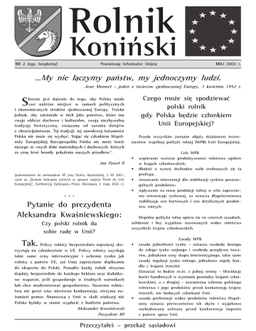 NR 2 (egz. bezp³atny) Powiatowy Informator Unijny MAJ 2003 r. My nie ³¹czymy pañstw, my jednoczymy ludzi. Jean Monnet - jeden z twórców zjednoczonej Europy, 3 kwietnia 1952 r. S ³uszne jest d¹¿enie do tego, aby Polska mia³a swe nale¿ne miejsce w ramach politycznych i ekonomicznych struktur zjednoczonej Europy. Trzeba jednak, aby zaistnia³a w nich jako pañstwo, które ma swoje oblicze duchowe i kulturalne, swoj¹ niezbywaln¹ tradycjê historyczn¹, zwi¹zan¹ od zarania dziejów z chrzecijañstwem. Tej tradycji, tej narodowej to¿samoci Polska nie mo¿e siê wyzbyæ. Staj¹c siê cz³onkiem Wspólnoty Europejskiej Rzeczpospolita Polska nie mo¿e traciæ niczego ze swych dóbr materialnych i duchowych, których za cenê krwi broni³y pokolenia naszych przodków. Jan Pawe³ II Czego mo¿e siê spodziewaæ polski rolnik gdy Polska bêdzie cz³onkiem Unii Europejskiej? Przede wszystkim zostanie objêty dzia³aniem instrumentów wspólnej polityki rolnej (WPR) Unii Europejskiej. (przemówienie do ambasadora RP przy Stolicy Apostolskiej, 3 XII 2001; cytat za S³owem biskupów polskich w sprawie wejcia Polski do Unii Europejskiej, Konferencja Episkopatu Polski, Warszawa, 2 maja 2003 r.). * * * Pytanie do prezydenta Aleksandra Kwaniewskiego: Czy polski rolnik da sobie radê w Unii? Tak. Polscy rolnicy bezporednio najwiêcej sko- rzystaj¹ na cz³onkostwie w UE. Polscy rolnicy uzyskaj¹ takie same ceny interwencyjne i ochronê rynku jak rolnicy z pañstw UE, za Unia zaprzestane dop³acania do eksportu do Polski. Ponadto ka¿dy rolnik otrzyma dop³aty bezporednie do ka¿dego hektara oraz dodatkowe wsparcie, jeli gospodaruje w trudnych warunkach lub chce modernizowaæ gospodarstwo. Naszemu rolnictwu nie grozi wiêc nierówna konkurencja, otrzyma natomiast pomoc finansow¹ z Unii w skali wiêkszej ni¿ Polska by³aby w stanie wyp³aciæ z bud¿etu pañstwa. Aleksander Kwaniewski Prezydent RP Cele WPR wspieranie wzrostu produktywnoci rolnictwa ogó³em w krajach cz³onkowskich; dba³oæ o wzrost dochodów osób trudni¹cych siê t¹ profesj¹; stosowanie interwencji dla stabilizacji rynków poszczególnych produktów; wp³ywanie na masê produkcji rolnej w celu zapewnienia równowagi rynkowej, co oznacza d³ugoterminow¹ stabilizacjê cen hurtowych i cen detalicznych produktów rolnych. Wspólna polityka rolna opiera siê na czterech zasadach, solidarnie i bez wyj¹tków stosowanych wobec rolnictwa wszystkich krajów cz³onkowskich. Zasady WPR zasada jednolitoci rynku oznacza swobodê dostêpu do ca³ego rynku unijnego i swobodê przep³ywu towarów, jednakowe ceny skupu interwencyjnego, takie same zasady regulacji rynku rolnego, jednakowe regu³y handlu z krajami trzecimi. Oznaczaæ to bêdzie m.in. z jednej strony - likwidacjê barier handlowych w wymianie pomiêdzy krajami cz³onkowskimi, a z drugiej - zewnêtrzn¹ ochronê polskiego rolnictwa i jego produktów przed konkurencj¹ krajów trzecich, nie bêd¹cych cz³onkami Unii. zasada preferencji wobec produktów rolnictwa Wspólnoty oznacza pierwszeñstwo ich zbytu i wyj¹tkowo rozbudowan¹ ochronê przed konkurencj¹ importu z pañstw spoza Unii. Przeczyta³e przeka¿ s¹siadowi ROLNIK KONIÑSKI Charakterystyka ogólna rolnictwa powiatu koniñskiego (c.d.) Kramsk Produkcja rolinna W strukturze zasiewów w 2001 roku zbo¿a zajmuj¹ powierzchniê 58,3 tys. ha w tym pszenica 7,8 tys. ha, ¿yto 28,1 tys. ha, jêczmieñ 3,7 tys. ha, pszen¿yto 4,0 tys. ha oraz 10,1 tys. ha mieszanki jare. Produkcja rolinna ma decyduj¹cy wp³yw na produkcjê roln¹, która stanowi wa¿ne ród³o dochodów wszystkich gospodarstw rolnych i w istotny sposób oddzia³uje na stan zasobnoci rynku ¿ywnociowego. Struktura gatunkowa uprawianych rolin w powiecie ró¿ni siê bardzo od redniej krajowej. Jest to spowodowane miêdzy innymi okrelonymi warunkami glebowymi, które zmuszaj ¹ rolników do uprawy gatunków umiej wymagaj¹cych tj. ¿yta, mieszanek zbo¿owych i pszen¿yta. W powiecie koniñskim produkcja rolinna jest w du¿ej mierze podporz¹dkowana produkcji zwierzêcej i z tym zwi¹zanej produkcji paszy. Decyduj¹cy wp³yw na wielkoæ powierzchni uprawianych zbó¿ jak i procentowy udzia³ uprawianych gatunków zbó¿ w powicie koniñskim maj¹ warunki glebowo - klimatyczne, które sanie najlepsze. Du¿a iloæ gleb lekkich, na których koncentruje siê uprawa ¿yta i ziemniaków powoduje, ¿e mimo du¿ych wahañ w plonowaniu ziemniaków dalej ich udzia³ w strukturze zasiewów jest du¿y i stanowi 8-9%. Dominuj¹ ziemniaki jadalne, w tym rozszerza siê uprawa odmian pod przetwórstwo spo¿ywcze i przemys³owe. Plony zbó¿ uzyskiwane przez rolników w powiecie s¹ ni¿sze od rednich tak w Polsce jak i Wielkopolsce. Niska bonitacja gleb - w wiêkszoci klasy V i VI, które stanowi¹ ³¹cznie 53,49% powoduje, ¿e w strukturze zasiewów obok uprawy ¿yta i owsa uprawa ziemniaków zajmuje 8,9 tys. ha. Skutkiem tego powiat koniñski nale¿y do najwiêkszych w Polsce producentów ¿yta i ziemniaków. Jest tak¿e najwiêkszym dostawc¹ ¿yta w województwie wielkopolskim, a drugim pod wzglêdem produkcji ziemniaków. Kleczew W gospodarce gminy dominuj¹c¹ rolê odgrywa przemys³ wydobywczy. Ogó³em w gminie funkcjonuje ponad 420 podmiotów gospodarczych, w których pracuje 3,8 tys. osób. Baz¹ dla rolnictwa jest 8,0 tys. ha u¿ytków rolnych, wród których dominuj¹ grunty orne. Do podstawowych upraw nale¿¹ ¿yto, ziemniaki, pszenica, buraki cukrowe, warzywa. Na terenie gminy znajduje siê oko³o 1000 indywidualnych gospodarstw rolnych. W gospodarce gminy dominuj¹c¹ rolê odgrywa rolnictwo. Powierzchnia u¿ytków rolnych siêga 9,9 tys. ha, w tym oko³o 4,7 tys. ha zajmuj¹ ³¹ki i pastwiska. W zasiewach dominuj¹ zbo¿a, g³ównie ¿yto i mieszanki zbo¿owe oraz ziemniaki. W hodowli przewa¿a trzoda chlewna i byd³o. Krzymów W gospodarce gminy najwa¿niejsz¹ rolê odgrywa rolnictwo. U¿ytki rolne zajmuj¹ 6,2 tys. ha z czego 2/3 stanowi¹ grunty or