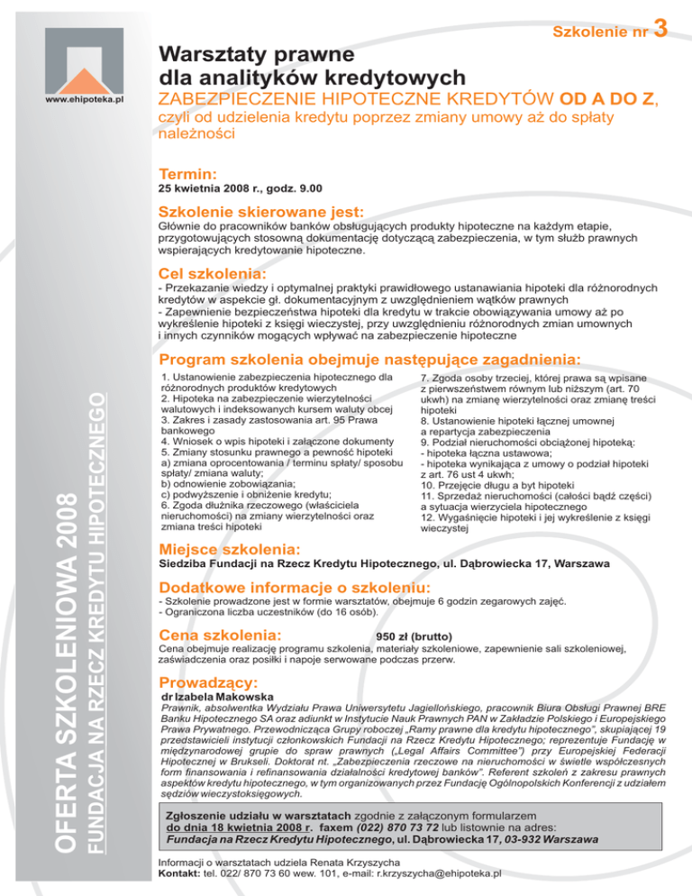 Szkolenie nr 3 Warsztaty prawne dla analityków kredytowych www.ehipoteka.pl I ZABEZPIECZENIE HIPOTECZNE KREDYTÓW OD A DO Z, czyli od udzielenia kredytu poprzez zmiany umowy a¿ do sp³aty nale¿noœci Termin: 25 kwietnia 2008 r., godz. 9.00 Szkolenie skierowane jest: G³ównie do pracowników banków obs³uguj¹cych produkty hipoteczne na ka¿dym etapie, przygotowuj¹cych stosown¹ dokumentacjê dotycz¹c¹ zabezpieczenia, w tym s³u¿b prawnych wspieraj¹cych kredytowanie hipoteczne. Cel szkolenia: - Przekazanie wiedzy i optymalnej praktyki prawid³owego ustanawiania hipoteki dla ró¿norodnych kredytów w aspekcie g³. dokumentacyjnym z uwzglêdnieniem w¹tków prawnych - Zapewnienie bezpieczeñstwa hipoteki dla kredytu w trakcie obowi¹zywania umowy a¿ po wykreœlenie hipoteki z ksiêgi wieczystej, przy uwzglêdnieniu ró¿norodnych zmian umownych i innych czynników mog¹cych wp³ywaæ na zabezpieczenie hipoteczne FUNDACJA NA RZECZ KREDYTU HIPOTECZNEGO OFERTA SZKOLENIOWA 2008 Program szkolenia obejmuje nastêpuj¹ce zagadnienia: 1. Ustanowienie zabezpieczenia hipotecznego dla ró¿norodnych produktów kredytowych 2. Hipoteka na zabezpieczenie wierzytelnoœci walutowych i indeksowanych kursem waluty obcej 3. Zakres i zasady zastosowania art. 95 Prawa bankowego 4. Wniosek o wpis hipoteki i za³¹czone dokumenty 5. Zmiany stosunku prawnego a pewnoœæ hipoteki a) zmiana oprocentowania / terminu sp³aty/ sposobu sp³aty/ zmiana waluty; b) odnowienie zobowi¹zania; c) podwy¿szenie i obni¿enie kredytu; 6. Zgoda d³u¿nika rzeczowego (w³aœciciela nieruchomoœci) na zmiany wierzytelnoœci oraz zmiana treœci hipoteki 7. Zgoda osoby trzeciej, której prawa s¹ wpisane z pierwszeñstwem równym lub ni¿szym (art. 70 ukwh) na zmianê wierzytelnoœci oraz zmianê treœci hipoteki 8. Ustanowienie hipoteki ³¹cznej umownej a repartycja zabezpieczenia 9. Podzia³ nieruchomoœci obci¹¿onej hipotek¹: - hipoteka ³¹czna ustawowa; - hipoteka wynikaj¹ca z umowy o podzia³ hipoteki z art. 76 ust 4 ukwh; 10. Przejêcie d³ugu a byt hipoteki 11. Sprzeda¿ nieruchomoœci (ca³oœci b¹dŸ czêœci) a sytuacja wierzyciela hipotecznego 12. Wygaœniêcie hipoteki i jej wykreœlenie z ksiêgi wieczystej Miejsce szkolenia: Siedziba Fundacji na Rzecz Kredytu Hipotecznego, ul. D¹browiecka 17, Warszawa Dodatkowe informacje o szkoleniu: - Szkolenie prowadzone jest w formie warsztatów, obejmuje 6 godzin zegarowych zajêæ. - Ograniczona liczba uczestników (do 16 osób). Cena szkolenia: 950 z³ (brutto) Cena obejmuje realizacjê programu szkolenia, materia³y szkoleniowe, zapewnienie sali szkoleniowej, zaœwiadczenia oraz posi³ki i napoje serwowane podczas przerw. Prowadz¹cy: dr Izabela Makowska Prawnik, absolwentka Wydzia³u Prawa Uniwersytetu Jagielloñskiego, pracownik Biura Obs³ugi Prawnej BRE Banku Hipotecznego SA oraz adiunkt w Instytucie Nauk Prawnych PAN w Zak³adzie Polskiego i Europejskiego Prawa Prywatnego. Przewodnicz¹ca Grupy roboczej „Ramy prawne dla kredytu hipotecznego”, skupiaj¹cej 19 przedstawicieli instytucji cz³onkowskich Fundacji na Rzecz Kredytu Hipotecznego; reprezentuje Fundacjê w miêdzynarodowej grupie do spraw prawnych („Legal Affairs Committee”) przy Europejskiej Federacji Hipotecznej w Brukseli. Doktorat nt. „Zabezpieczenia rzeczowe na nieruchomoœci w œwietle wspó³czesnych form finansowania i refinansowania dzia³alnoœci kredytowej banków”. Referent szkoleñ z zakresu prawnych aspektów kredytu hipotecznego, w tym organizowanych przez Fundacjê Ogólnopolskich Konferencji z udzia³em sêdziów wieczystoksiêgowych. Zg³oszenie udzia³u w warsztatach zgodnie z za³¹czonym formularzem do dnia 18 kwietnia 2008 r. faxem (022) 870 73 72 lub listownie na adres: Fundacja na Rzecz Kredytu Hipotecznego, ul. D¹browiecka 17, 03-932 Warszawa Informacji o warsztatach udziela Renata Krzyszycha Kontakt: tel. 022/ 870 73 60 wew. 101, e-mail: [email protected]