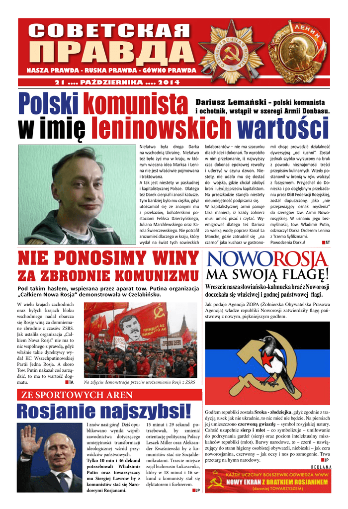 СОВЕТСКАЯ ПРАВДА NASZA PRAWDA - RUSKA PRAWDA - GÓWNO PRAWDA 21 .... PAŹDZIERNIKA .... 2014 Polski komunista w imię leninowskich wartości Dariusz Lemański – polski komunista i ochotnik, wstąpił w szeregi Armii Donbasu. Niełatwa była droga Darka na wschodnią Ukrainę. Niełatwo też było żyć mu w kraju, w którym wieczna idea Marksa i Lenina nie jest właściwie pojmowana i traktowana. A tak jest niestety w paskudnej i kapitalistycznej Polsce. Dlatego też Darek cierpiał i znosil katusze. Tym bardziej było mu ciężko, gdyż utożsamiał się ze znanymi mu z przekazów, bohaterskimi postaciami Feliksa Dzierżyńskiego, Juliana Marchlewskiego oraz Karola Świerczewskiego. Nie potrafił zrozumieć dlaczego w kraju, który wydał na świat tych sowieckich kolaborantów – nie ma szacunku dla ich idei i dokonań. To wyrobiło w nim przekonanie, iż najwyższy czas dokonać epokowej rewolty i uderzyć w czynu dzwon. Niestety, nie udało mu się dostać do wojska, gdzie chciał zdobyć broń i użyć jej przeciw kapitalistom. Na przeszkodzie stanęła niestety nieumiejętność podpisania się. W kapitalistycznej armii panuje taka maniera, iż każdy żołnierz musi umieć pisać i czytać. Wyemigrował dlatego też Dariusz za wielką wodę poprzez Kanał La Manche, gdzie zatrudnił się „na czarno“ jako kucharz w gastrono- mii chcąc prowadzić działalność dywersyjną „od kuchni“. Został jednak szybko wyrzucony na bruk z powodu nieznajomości treści przepisów kulinarnych. Wtedy postanowił w bronią w ręku walczyć z faszyzmem. Przyjechał do Doniecka i po dogłębnym przebadaniu przez KGB Federacji Rosyjskiej, został dopuszczony, jako „nie przejawiający oznak myślenia“ do szeregów tzw. Armii Noworosyjskiej. W uznaniu jego bezmyślności, tow. Władimir Putin, odznaczył Darka Orderem Lenina z Trzema Syfilizmami. Powodzenia Darku! nST NIE PONOSIMY WINY NOWOROSJA ZA ZBRODNIE KOMUNIZMU Pod takim hasłem, wspierana przez aparat tow. Putina organizacja „Całkiem Nowa Rosja“ demonstrowała w Czelabińsku. W wielu krajach zachodnich oraz byłych krajach bloku wschodniego nadal obarcza się Rosję winą za domniemane zbrodnie z czasów ZSRS. Jak ustaliła organizacja „Całkiem Nowa Rosja“ nie ma to nic wspólnego z prawdą, gdyż właśnie takie dyrektywy wydał KC Wszechputinowskiej Partii Jedna Rosja. A skoro Tow. Putin nakazał coś zarządzić, to ma to wartość dogmatu. nTA ma swoją flagę! Wreszcie nasza słowiańsko-kałmucka brać z Noworosji doczekała się właściwej i godnej państwowej flagi. Jak podaje Agencja ŻOPA (Żołnierska Obywatelska Prasowa Agencja) władze republiki Noworosji zatwierdziły flagę państwową z nowym, piękniejszym godłem. Na zdjęciu demonstracja przeciw utożsamianiu Rosji z ZSRS ZE SPORTOWYCH AREN Rosjanie najszybsi! I znów nasi górą! Dziś opublikowano wyniki współzawodnictwa dotyczącego umiejętności transformacji ideologicznej wśród przywódców państwowych. Tylko 10 min i 46 dekund potrzebowali Władzimir Putin oraz towarzyszacy mu Siergiej Ławrow by z komunistów stać się Narodowymi Rosjanami. 15 minut i 29 sekund potrzebowali, by zmienić orientację polityczną Polacy Leszek Miller oraz Aleksander Kwaśniewski by z komunistów stać sie Socjaldemokratami. Trzecie miejsce zajął białorusin Łukaszenka, który w 18 minut i 16 sekund z komunisty stał się dyktatorem i fuehrerem. nJP Godłem republiki została Sroka - złodziejka, gdyż zgodnie z tradycją rusek jak nie ukradnie, to nic mieć nie będzie. Na piersiach jej umieszczono czerwoną gwiazdę – symbol rosyjskiej natury. Całość uzupełnie sierp i młot – co symbolizuje – umiłowanie do podrzynania gardeł (sierp) oraz poziom intelektualny miszkańców republiki (młot). Barwy narodowe, to – czerń – nawiązujący do stanu higieny osobistej obywateli, niebieski – jak cera noworosjanina, czerwony – jak oczy i nos po samogonie. Trwa przetarg na hymn narodowy. nJP REKLAMA