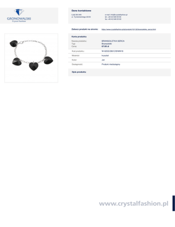 Powered by TCPDF (www.tcpdf.org) Dane kontaktowe Łódź 90-349 ul. Tymienieckiego 22/24 Zobacz produkt na stronie: e-mail: [email protected] tel. +48 42 648 05 60 fax +48 42 648 05 80 https://www.crystalfashion.pl/pl/produkt/10/132/bransoletka_serca.html Karta produktu Nazwa produktu: Typ: Cena: BRANSOLETKA SERCA Bransoletki 87.00 zł Kod produktu: W-6202/280/C/B/MM18 Materiał: kryształ Kolor: Jet Dostępność: Produkt niedostępny Opis produktu