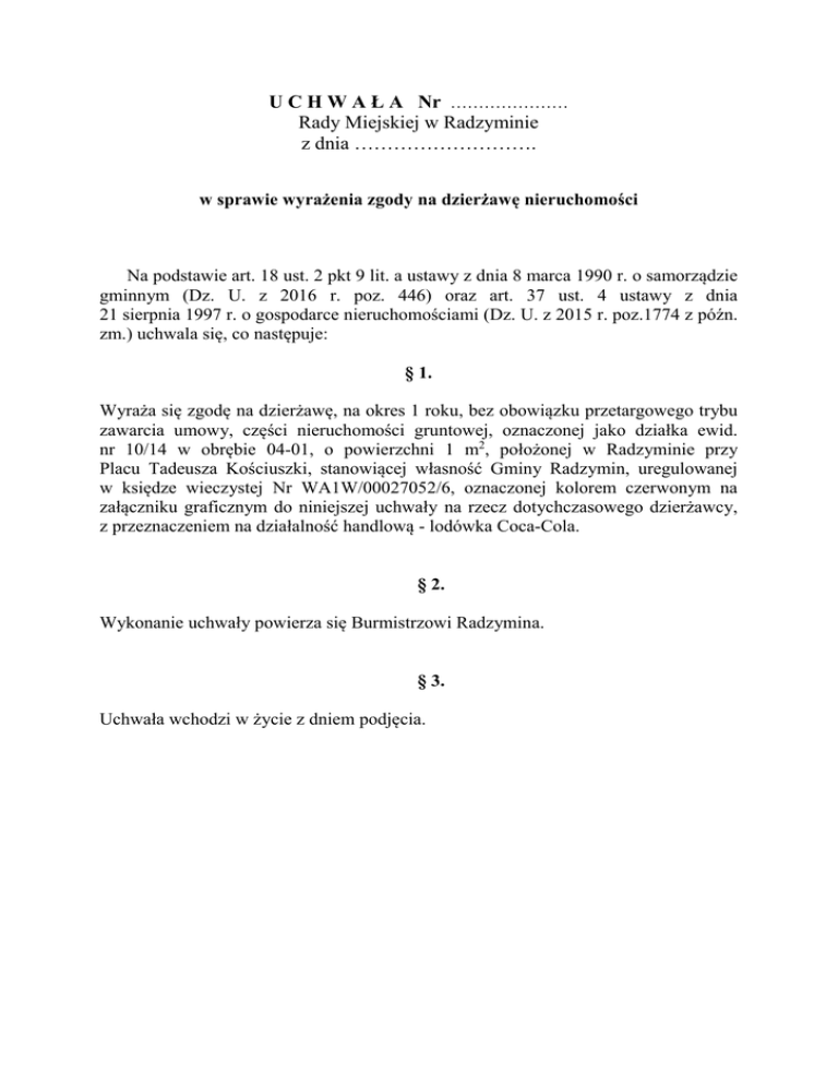 U C H W A Ł A Nr ………………… Rady Miejskiej w Radzyminie z dnia ………………………. w sprawie wyrażenia zgody na dzierżawę nieruchomości Na podstawie art. 18 ust. 2 pkt 9 lit. a ustawy z dnia 8 marca 1990 r. o samorządzie gminnym (Dz. U. z 2016 r. poz. 446) oraz art. 37 ust. 4 ustawy z dnia 21 sierpnia 1997 r. o gospodarce nieruchomościami (Dz. U. z 2015 r. poz.1774 z późn. zm.) uchwala się, co następuje: § 1. Wyraża się zgodę na dzierżawę, na okres 1 roku, bez obowiązku przetargowego trybu zawarcia umowy, części nieruchomości gruntowej, oznaczonej jako działka ewid. nr 10/14 w obrębie 04-01, o powierzchni 1 m2, położonej w Radzyminie przy Placu Tadeusza Kościuszki, stanowiącej własność Gminy Radzymin, uregulowanej w księdze wieczystej Nr WA1W/00027052/6, oznaczonej kolorem czerwonym na załączniku graficznym do niniejszej uchwały na rzecz dotychczasowego dzierżawcy, z przeznaczeniem na działalność handlową - lodówka Coca-Cola. § 2. Wykonanie uchwały powierza się Burmistrzowi Radzymina. § 3. Uchwała wchodzi w życie z dniem podjęcia. Uzasadnienie Dotychczasowy dzierżawca wystąpił z wnioskiem o przedłużenie umowy dzierżawy terenu położonego w Radzyminie przy Placu Tadeusza Kościuszki, stanowiącego część działki ewid. nr 10/14 w obrębie 04-01, o powierzchni 1 m2, na okres 1 roku, z przeznaczeniem na działalność handlową – lodówka Coca-Cola. Przedmiotowa nieruchomość, na której usytuowana jest lodówka Coca-Cola, stanowiąca własność Gminy Radzymin, jest dzierżawiona przez Coca-Cola HBC Polska Sp. z o.o. z siedzibą w Warszawie, na podstawie umowy zawartej w dniu 7 lipca 2015 r. na okres 1 roku. Zgodnie z przepisami ustawy o samorządzie gminnym uchwała rady gminy jest wymagana w przypadku, gdy po umowie zawartej na czas oznaczony do 3 lat strony zawierają kolejne umowy, których przedmiotem jest ta sama nieruchomość, burmistrz może dokonać tych czynności wyłącznie za zgodą rady gminy. Z uwagi na fakt, iż dzierżawienie przedmiotowej nieruchomości nie koliduje z aktualnym zagospodarowaniem terenu zawarcie z dotychczasowym dzierżawcą kolejnej umowy, należy uznać za zasadne.