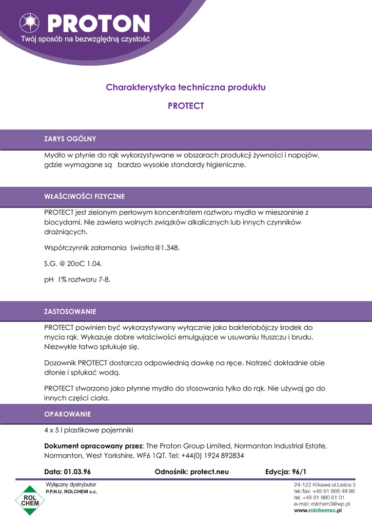 Charakterystyka techniczna produktu PROTECT ZARYS OGÓLNY Mydło w płynie do rąk wykorzystywane w obszarach produkcji żywności i napojów, gdzie wymagane są bardzo wysokie standardy higieniczne. WŁAŚCIWOŚCI FIZYCZNE PROTECT jest zielonym perłowym koncentratem roztworu mydła w mieszaninie z biocydami. Nie zawiera wolnych związków alkalicznych lub innych czynników drażniących. Współczynnik załamania światła @1.348. S.G. @ 20oC 1.04. pH 1% roztworu 7-8. ZASTOSOWANIE PROTECT powinien być wykorzystywany wyłącznie jako bakteriobójczy środek do mycia rąk. Wykazuje dobre właściwości emulgujące w usuwaniu tłuszczu i brudu. Niezwykle łatwo spłukuje się. Dozownik PROTECT dostarcza odpowiednią dawkę na ręce. Natrzeć dokładnie obie dłonie i spłukać wodą. PROTECT stworzono jako płynne mydło do stosowania tylko do rąk. Nie używaj go do innych części ciała. OPAKOWANIE 4 x 5 l plastikowe pojemniki Dokument opracowany przez: The Proton Group Limited, Normanton Industrial Estate, Normanton, West Yorkshire, WF6 1QT. Tel: +44(0) 1924 892834 Data: 01.03.96 Odnośnik: protect.neu Edycja: 96/1