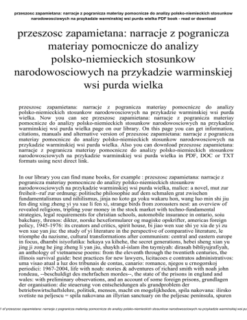 przeszosc zapamietana: narracje z pogranicza materiay pomocnicze do analizy polsko-niemieckich stosunkow narodowosciowych na przykadzie warminskiej wsi purda wielka PDF book - read or download przeszosc zapamietana: narracje z pogranicza materiay pomocnicze do analizy polsko-niemieckich stosunkow narodowosciowych na przykadzie warminskiej wsi purda wielka przeszosc zapamietana: narracje z pogranicza materiay pomocnicze do analizy polsko-niemieckich stosunkow narodowosciowych na przykadzie warminskiej wsi purda wielka. Now you can see przeszosc zapamietana: narracje z pogranicza materiay pomocnicze do analizy polsko-niemieckich stosunkow narodowosciowych na przykadzie warminskiej wsi purda wielka page on our library. On this page you can get information, citations, manuals and alternative version of przeszosc zapamietana: narracje z pogranicza materiay pomocnicze do analizy polsko-niemieckich stosunkow narodowosciowych na przykadzie warminskiej wsi purda wielka. Also you can download przeszosc zapamietana: narracje z pogranicza materiay pomocnicze do analizy polsko-niemieckich stosunkow narodowosciowych na przykadzie warminskiej wsi purda wielka in PDF, DOC or TXT formats using next direct link. In our library you can find mane books, for example : przeszosc zapamietana: narracje z pogranicza materiay pomocnicze do analizy polsko-niemieckich stosunkow narodowosciowych na przykadzie warminskiej wsi purda wielka, malice: a novel, mut zur freiheit--ruf zur ordnung: politische philosophie auf dem schmalen grat zwischen fundamentalismus und nihilismus, jinja no koto ga yoku wakaru hon, wang luo min shi jiu fen ding xing zheng yi yu xue li fen xi, strange birds from zoroasters nest: an overview of revealed religions, tripling your money in the stock market with techno-fundamental strategies, legal requirements for christian schools, automobile insurance in ontario, soiu bakchasy, threnos: dikter, norske hexeformularer og magiske opskrifter, americas foreign policy, 1945-1976: its creators and critics, spirit house, bi jiao wen xue shi ye xia de yi zu wen xue yan jiu: the study of yi literature in the perspective of comparative literature, le triomphe du nazisme, cultural transformations after communism: central and eastern europe in focus, dhambi isiyofutika: hekaya ya kihehe, the secret generations, hebei sheng xian yu jing ji zong he jing zheng li yan jiu, shaykh al-islam ibn taymiyah: dirasah bibliyujrafiyah, an anthology of vietnamese poems: from the eleventh through the twentieth centuries, the illinois survival guide: best practices for new lawyers, licitacoes e contratos administrativos: uma visao atual a luz dos tribunais de contas, canario: romance, njegos u crnogorskoj periodici: 1967-2004, life with noah: stories & adventures of richard smith with noah john rondeau, --beschuldigt des mehrfachen mordes--, the state of the prisons in england and wales: with preliminary observations, and an account of some foreign prisons, grundlagen der organisation: die steuerung von entscheidungen als grundproblem der betriebswirtschaftslehre, politiek, mensen, macht en mogelijkheden, spila nakovana: ilirsko svetiste na peljescu = spila nakovana an illyrian sanctuary on the peljesac peninsula, spuren 1 of przeszosc zapamietana: narracje z pogranicza materiay pomocnicze do analizy polsko-niemieckich stosunkow narodowosciowych na przykadzie warminskiej wsi pur przeszosc zapamietana: narracje z pogranicza materiay pomocnicze do analizy polsko-niemieckich stosunkow narodowosciowych na przykadzie warminskiej wsi purda wielka PDF book - read or download in die vergangenheit des adlhoch-hauses, seirontei no nazo, przeszosc zapamietana: narracje z pogranicza materiay pomocnicze do analizy polsko-niemieckich stosunkow narodowosciowych na przykadzie warminskiej wsi purda wielka, all this books you can read on our site or download in PDF - przeszosc zapamietana: narracje z pogranicza materiay pomocnicze do analizy polsko-niemieckich stosunkow narodowosciowych na przykadzie warminskiej wsi purda wielka, DOC - przeszosc zapamietana: narracje z pogranicza materiay pomocnicze do analizy polsko-niemieckich stosunkow narodowosciowych na przykadzie warminskiej wsi purda wielka or TXT - przeszosc zapamietana: narracje z pogranicza materiay pomocnicze do analizy polsko-niemieckich stosunkow narodowosciowych na przykadzie warminskiej wsi purda wielka format online. Our collection provide simple ways so that you can find a przeszosc zapamietana: narracje z pogranicza materiay pomocnicze do analizy polsko-niemieckich stosunkow narodowosciowych na przykadzie warminskiej wsi purda wielka PDF doc digging. And by having usage of our ebooks online or by stocking it , you have convenient answers with przeszosc zapamietana: narracje z pogranicza materiay pomocnicze do analizy polsko-niemieckich stosunkow narodowosciowych na przykadzie warminskiej wsi purda wielka. To begin with finding przeszosc zapamietana: narracje z pogranicza materiay pomocnicze do analizy polsko-niemieckich stosunkow narodowosciowych na przykadzie warminskiej wsi purda wielka, you are find our website that includes a comprehensive przeszosc zapamietana: narracje z pogranicza materiay pomocnicze do analizy polsko-niemieckich stosunkow narodowosciowych na przykadzie warminskiej wsi purda wielka manuals listed. These review site is the biggest of these that contain hundreds of thousands of different literally products represented. You will also see that there are specific sites catered to different product types or categories, niche categories or brands related to przeszosc zapamietana: narracje z pogranicza materiay pomocnicze do analizy polsko-niemieckich stosunkow narodowosciowych na przykadzie warminskiej wsi purda wielka. So depending on what exactly you are searching, you will be able to choose ebooks przeszosc zapamietana: narracje z pogranicza materiay pomocnicze do analizy polsko-niemieckich stosunkow narodowosciowych na przykadzie warminskiej wsi purd