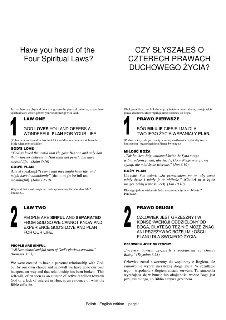 CZY SŁYSZAŁEŚ O CZTERECH PRAWACH DUCHOWEGO ŻYCIA? Have you heard of the Four Spiritual Laws? Just as there are physical laws that govern the physical universe, so are there spiritual laws which govern your relationship with God. Obok praw fizycznych, które rządzą światem materialnym, istnieją także prawa duchowe, które regulują nasz stosunek do Boga. LAW ONE PRAWO PIERWSZE GOD LOVES YOU AND OFFERS A WONDERFUL PLAN FOR YOUR LIFE. BÓG MIŁUJE CIEBIE I MA DLA TWOJEGO ŻYCIA WSPANIAŁY PLAN. (References contained in this booklet should be read in context from the Bible whenever possible) GOD’S LOVE “God so loved the world that He gave His one and only Son, that whoever believes in Him shall not perish, but have eternal life.” (John 3:16) GOD’S PLAN (Podane teksty biblijne należy w miarę możliwości czytać -łącznie z kontekstem - bezpośrednio z Pisma Świętego.) MIŁOŚĆ BOŻA „Tak bowiem Bóg umiłował świat, że Syna swego jednorodzonego dał, aby każdy, kto w Niego wierzy, nie zginął, ale miał życie wieczne.” (Jan 3,16) [Christ speaking] “I came that they might have life, and might have it abundantly” [that it might be full and meaningful]. (John 10:10) BOŻY PLAN Why is it that most people are not experiencing the abundant life? Because… Dlaczego jednak większość ludzi nie posiada życia w obfitości? Ponieważ: Chrystus Pan mówi: „Ja przyszedłem po to, aby owce miały życie i miały je w obfitośc.” (Chodzi tu o życie mające pełną wartość i cel). (Jan 10,10) LAW TWO PRAWO DRUGIE PEOPLE ARE SINFUL AND SEPARATED FROM GOD SO WE CANNOT KNOW AND EXPERIENCE GOD’S LOVE AND PLAN FOR OUR LIFE. CZŁOWIEK JEST GRZESZNY I W KONSEKWENCJI ODDZIELONY OD BOGA, DLATEGO TEŻ NIE MOŻE ZNAĆ ANI PRZEŻYWAĆ BOŻEJ MIŁOŚCI I PLANU DLA SWOJEGO ŻYCIA. PEOPLE ARE SINFUL CZŁOWIEK JEST GRZESZNY “All have sinned and fall short of God’s glorious standard.” (Romans 3:23) „Wszyscy bowiem zgrzeszyli i pozbawieni są chwały Bożej.” (Rzymian 3,23). We were created to have a personal relationship with God, but by our own choice and self-will we have gone our own independent way and that relationship has been broken. This self-will, often seen as an attitude of active rebellion towards God or a lack of interest in Him, is an evidence of what the Bible calls sin. Człowiek został stworzony do wspólnoty z Bogiem, ale samowolnie wybrał niezależną drogę życia. W rezultacie tego – wspólnota z Bogiem została zerwana. Ta samowola wyrażająca się w buncie lub obojętności wobec Boga jest przejawem tego, co Biblia nazywa grzechem. Polish - English edition page 1 CZŁOWIEK JEST ODDZIELONY OD BOGA PEOPLE ARE SEPARATED “The wages of sin is death” [spiritual separation from God]. (Romans 6:23) „Albowiem zapłatą za grzech jest śmierć” (to znaczy duchowe odłączenie od Boga). (Rzymian 6,23) HOLY GOD ŚWIĘTY BÓG SINFUL MAN GRZESZNY CZŁOWIEK This picture illustrates that God is holy and people are sinful. A great gap separates the two. The arrows illustrate that people are continually trying to reach God and the abundant life through their own efforts, such as a good life, philosophy, or religion – but they always fail. Bóg jest święty, a człowiek jest grzeszny. Dzieli ich wielka przepaść. Te strzałki ilustrują, że człowiek ustawicznie usiłuje dosięgnąć Boga i zdobyć obfite życie przez swoje wysiłki, takie jak: dobre, uczciwe życie, etyka, filozofia lub religia. The third law explains the only way to bridge this gap… Trzecie prawo daje nam jedyny sposób pokonania tej przepaści. LAW THREE PRAWO TRZECIE JESUS CHRIST IS GOD’S ONLY PROVISION FOR OUR SIN. THROUGH HIM YOU CAN KNOW AND EXPERIENCE GOD’S LOVE AND PLAN FOR YOUR LIFE. JEZUS CHRYSTUS JEST JEDYNYM, BOŻYM ROZWIĄZANIEM PROBLEMU GRZECHU I WINY CZŁOWIEKA. PRZEZ NIEGO MOŻESZ POZNAĆ BOŻĄ MIŁOŚĆ I PLAN DLA TWEGO ŻYCIA. HE DIED IN OUR PLACE ON ZMARŁ ZA NAS... “God demonstrates His own love towards us, in that while we were yet sinners, Christ died for us.” (Romans 5:8) „Bóg zaś okazuje nam swą miłość właśnie przez to, że Chrystus umarł za nas, gdyśmy byli jeszcze grzesznikami.” (Rzymian 5,8) HE ROSE FROM THE DEAD I ZMARTWYCHWSTAŁ “Christ died for our sins…He was buried…He was raised on the third day, according to the Scriptures…He appeared to Peter, then to the twelve. After that He appeared to more than five hundred…” (1 Corinthians 15:3-6) „Chrystus umarł za grzechy nasze... został pogrzebany... zmartwychwstał trzeciego dnia, zgodnie z Pismem... ukazał się Kefasowi, potem dwunastu. Potem ukazał się więcej niż pięciuset braciom naraz…” (1 Koryntian 15,3-6) HE IS THE ONLY WAY TO GOD I DLATEGO ON JEST JEDYNĄ DROGĄ “Jesus said to him, ‘I am the way, and the truth, and the life; no one comes to the Father, but through Me’.” (John 14:6) „Odpowiedział mu Jezus: Ja jestem drogą i prawdą, i życiem. Nikt nie przychodzi do Ojca inaczej jak tylko przeze Mnie.” (Jan 14,6) GOD J E S U S BÓG J E Z U S MAN CZŁOWIEK This picture illustrates that God has bridged the gap which separates us from Him by sending His Son, Jesus Christ, to die on the cross in our place to pay the penalty for our sins. It is not enough just to know these three laws… Bóg przerzucił pomost nad tą przepaścią, która dzieli nas od Niego, przez posłanie swego Syna, Jezusa Chrystusa, aby umarł zamiast nas, płacąc w ten sposób karę za nasze grzechy. Jednakże nie wystarczy tylko intelektualna znajomość tych trzech praw... Polish - English edition page 2 LAW FOUR PRAWO CZWARTE WE MUST INDIVIDUALLY RECEIVE JESUS CHRIST AS SAVIOUR AND LORD; THEN WE CAN KNOW AND EXPERIENCE GOD’S LOVE AND PLAN FOR OUR LIVES. MUSIMY OSOBIŚCIE PRZYJĄĆ JEZUSA CHRYSTUSA JAKO ZBAWICIELA I PANA. WTEDY DOPIERO MOŻEMY POZNAĆ I PRZEŻYWAĆ BOŻĄ MIŁOŚĆ I JEGO PLAN DLA NASZEGO ŻYCIA. WE MUST RECEIVE CHRIST MUSIMY PRZYJĄĆ CHRY