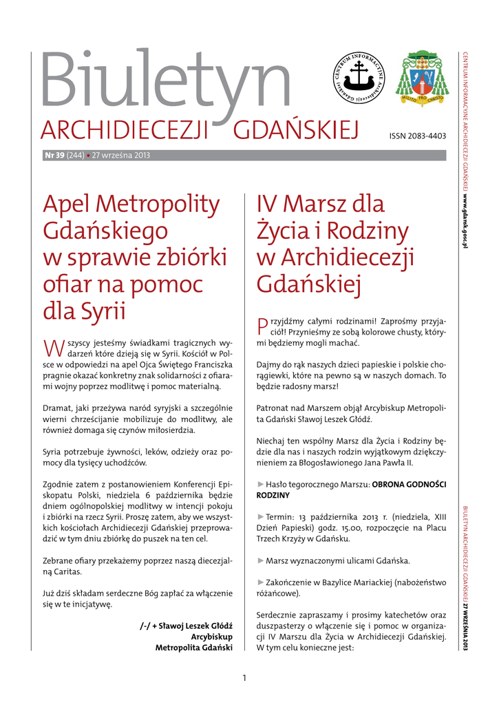 Nr 39 (244) • 27 wrześna 2013 Apel Metropolity Gdańskiego w sprawie zbiórki ofiar na pomoc dla Syrii W IV Marsz dla Życia i Rodziny w Archidiecezji Gdańskiej Dramat, jaki przeżywa naród syryjski a szczególnie wierni chrześcijanie mobilizuje do modlitwy, ale również domaga się czynów miłosierdzia. Patronat nad Marszem objął Arcybiskup Metropolita Gdański Sławoj Leszek Głódź. Centrum Informacyjne Archidiecezji Gdańskiej www.gdansk.gosc.pl ISSN 2083-4403 P rzyjdźmy całymi rodzinami! Zaprośmy przyjaciół! Przynieśmy ze sobą kolorowe chusty, którymi będziemy mogli machać. szyscy jesteśmy świadkami tragicznych wydarzeń które dzieją się w Syrii. Kościół w Polsce w odpowiedzi na apel Ojca Świętego Franciszka pragnie okazać konkretny znak solidarności z ofiarami wojny poprzez modlitwę i pomoc materialną. Dajmy do rąk naszych dzieci papieskie i polskie chorągiewki, które na pewno są w naszych domach. To będzie radosny marsz! Niechaj ten wspólny Marsz dla Życia i Rodziny będzie dla nas i naszych rodzin wyjątkowym dziękczynieniem za Błogosławionego Jana Pawła II. Syria potrzebuje żywności, leków, odzieży oraz pomocy dla tysięcy uchodźców. ►►Hasło tegorocznego Marszu: OBRONA GODNOŚCI RODZINY Zebrane ofiary przekażemy poprzez naszą diecezjalną Caritas. ►►Marsz wyznaczonymi ulicami Gdańska. ►►Termin: 13 października 2013 r. (niedziela, XIII Dzień Papieski) godz. 15.00, rozpoczęcie na Placu Trzech Krzyży w Gdańsku. ►►Zakończenie w Bazylice Mariackiej (nabożeństwo różańcowe). Już dziś składam serdeczne Bóg zapłać za włączenie się w te inicjatywę. Serdecznie zapraszamy i prosimy katechetów oraz duszpasterzy o włączenie się i pomoc w organizacji IV Marszu dla Życia w Archidiecezji Gdańskiej. W tym celu konieczne jest: /-/ + Sławoj Leszek Głódź Arcybiskup Metropolita Gdański 1 Biuletyn Archidiecezji Gdańskiej 27 września 2013 Zgodnie zatem z postanowieniem Konferencji Episkopatu Polski, niedziela 6 października będzie dniem ogólnopolskiej modlitwy w intencji pokoju i zbiórki na rzecz Syrii. Proszę zatem, aby we wszystkich kościołach Archidiecezji Gdańskiej przeprowadzić w tym dniu zbiórkę do puszek na ten cel. Centrum Informacyjne Archidiecezji Gdańskiej www.gdansk.gosc.pl nr 39 (244) - zachęcenie grupy dzieci i młodzieży szkolnej do udziału w Marszu (mile widziane grupy 5-10 osobowe, ale każda liczba jest dobra), rozpoczęcia w duchu wiary nowego okresu, jaki stoi przed światem nauki naszego regionu. Z tej okazji serdecznie zapraszam Władze Uczelni, Grono Profesorów i Pracowników oraz Studentów na Mszę św. inaugurującą Rok Akademicki, którą będę sprawował we wtorek, 1. października br. o godz. 8.00 w Bazylice Archikatedralnej w Gdańsku Oliwie. - przeprowadzenie katechezy szkolnej związanej z kwestią promocji godności życia, małżeństwa i rodziny oraz wyjaśnieniem idei i sensu marszu, - przygotowanie transparentów z hasłami o tematyce Marszu dla Życia Jednocześnie pragnę przekazać wszystkim Uczelniom życzenia owocnej pracy w nadchodzącym Roku Akademickim. - zabranie różnych flag i chust - wspólny wyjazd i uczestnictwo z dziećmi i młodzieżą w Marszu /-/ + Sławoj Leszek Głódź Arcybiskup Metropolita Gdański Liczymy na wasza pomoc a przez to dane świadectwo ►►1 października 2013 W celach organizacyjnych prosimy aby zgłaszać grupy szkolne, podając nazwę szkoły, liczbę dzieci/ młodzieży/, oraz imię nazwisko katechety na adres: [email protected] lub Waldemar Jaroszewicz, tel. 601 631 298. Zaproszenie metropolity gdańskiego na Mszę św. transmitowaną przez TV Polonia Informacje na temat marszu będą sukcesywnie umieszczane na stronie internetowej www.marszzycia.pl. D rodzy Diecezjanie, zapraszam wiernych naszej archidiecezji na Mszę św., którą będę sprawował w niedzielę, 6 października br. o godz. 13.00 w Sanktuarium Matki Bożej Trąbkowskiej w Trąbkach Wielkich. /-/ Ks. Grzegorz Świst Kanclerz Kurii /-/ Ks. Andrzej Pradela Dyrektor Wydziału Duszpasterskiego Msza św. będzie transmitowana przez Telewizję POLONIA. Biuletyn Archidiecezji Gdańskiej 27 września 2013 Komunikaty /-/ + Sławoj Leszek Głódź Arcybiskup Metropolita Gdański Zaproszenie metropolity gdańskiego na Mszę św. inaugurującą nowy rok akademicki ►►6 października 2013 Program uroczystości w Lasach Piaśnickich W krótce uczelnie wyższe w naszym kraju zainaugurują swój nowy rok. Także świat akademicki Trójmiasta rozpocznie kolejny okres pracy naukowej i dydaktycznej. Co roku inauguracji Roku Akademickiego w naszej archidiecezji towarzyszy Msza św. sprawowana w Archikatedrze w Gdańsku-Oliwie dla przedstawicieli Szkół Wyższych Wybrzeża. Niech i w tym roku stanie się ona okazją do Z apraszamy wiernych na uroczystości związane z 74. rocznicą wybuchu II Wojny Światowej i niemieckiego ludobójstwa w lasach piaśnickich jesienią 1939 r. oraz 14. rocznicą beatyfikacji siostry Alicji Kotowskiej. Uroczystości pod przewodnictwem Arcybiskupa 2 nr 39 (244) Pierwsze wystąpienie: Ks. dr Grzegorz Stolarski (Uniwersytet Humanistyczno – Przyrodniczy w Siedlcach) – Sprawiedliwość a prawo naturalne Drugie wystąpienie: P. Prof. Aurelia Nowicka (Uniwersytet im. Adama Mickiewicza w Poznaniu) – Prawo naturalne a prawo stanowione w praktyce Program godz. 10.45 – nabożeństwo oczekiwania. godz.11.00 - Rozpoczęcie Mszy św. w kaplicy leśnej (kolor szat liturgicznych- czerwony: formularz mszalny. „Msza św. za poległych w obronie Ojczyzny” Liturgię Mszy św. uświetnia Kompania Honorowa Wojska Polskiego. /-/ Ks. Andrzej Pradela Dyrektor Wydziału Duszpasterskiego /-/ Ks. Grzegorz Świst Diecezjalny Duszpasterz Prawników /-/ Ks. Grzegorz Świst Kanclerz Kurii ►►5 października 2013 Informacja w sprawie przygotowań do obchodów XIII Dnia Papieskiego w Archidiecezji Gdańskiej /-/ Ks. Daniel Nowak Proboszcz