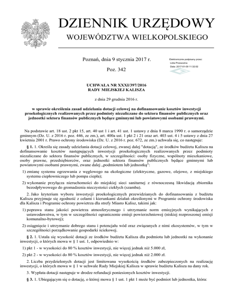 DZIENNIK URZĘDOWY WOJEWÓDZTWA WIELKOPOLSKIEGO Poznań, dnia 9 stycznia 2017 r. Elektronicznie podpisany przez: Lidia Przewoźna Poz. 342 Data: 2017-01-09 11:32:02 UCHWAŁA NR XXXI/397/2016 RADY MIEJSKIEJ KALISZA z dnia 29 grudnia 2016 r. w sprawie określenia zasad udzielania dotacji celowej na dofinansowanie kosztów inwestycji proekologicznych realizowanych przez podmioty niezaliczane do sektora finansów publicznych oraz jednostki sektora finansów publicznych będące gminnymi lub powiatowymi osobami prawnymi. Na podstawie art. 18 ust. 2 pkt 15, art. 40 ust 1 i art. 41 ust. 1 ustawy z dnia 8 marca 1990 r. o samorządzie gminnym (Dz. U. z 2016 r. poz. 446, ze zm.), art. 400a ust. 1 pkt 2 i 21 oraz art. 403 ust. 4 i 5 ustawy z dnia 27 kwietnia 2001 r. Prawo ochrony środowiska (Dz. U. z 2016 r. poz. 672, ze zm.) uchwala się, co następuje: § 1. 1. Określa się zasady udzielania dotacji celowej, zwanej dalej "dotacją", ze środków budżetu Kalisza na dofinansowanie kosztów następujących inwestycji proekologicznych realizowanych przez podmioty niezaliczane do sektora finansów publicznych, w szczególności: osoby fizyczne, wspólnoty mieszkaniowe, osoby prawne, przedsiębiorców, oraz jednostki sektora finansów publicznych będące gminnymi lub powiatowymi osobami prawnymi, zwane dalej „podmiotem lub jednostką": 1) zmianę systemu ogrzewania z węglowego na ekologiczne (elektryczne, gazowe, olejowe, z miejskiego systemu ciepłowniczego lub pompa ciepła); 2) wykonanie przyłącza nieruchomości do miejskiej sieci sanitarnej z równoczesną likwidacją zbiornika bezodpływowego do gromadzenia nieczystości ciekłych (szamba). 2. Jako kryterium wyboru inwestycji proekologicznych przewidzianych do dofinansowania z budżetu Kalisza przyjmuje się zgodność z celami i kierunkami działań określonymi w Programie ochrony środowiska dla Kalisza i Programie ochrony powietrza dla strefy Miasto Kalisz, takimi jak: 1) poprawa stanu jakości powietrza atmosferycznego i utrzymanie norm emisyjnych wynikających z ustawodawstwa, w tym w szczególności ograniczenie emisji powierzchniowej (niskiej rozproszonej emisji komunalno-bytowej); 2) osiągnięcie i utrzymanie dobrego stanu i potencjału wód oraz związanych z nimi ekosystemów, w tym w szczególności porządkowanie gospodarki ściekowej. § 2. 1. Ustala się wysokość dotacji ze środków budżetu Kalisza dla podmiotu lub jednostki na wykonanie inwestycji, o których mowa w § 1 ust. 1, odpowiednio w: 1) pkt 1 - w wysokości do 80 % kosztów inwestycji, nie więcej jednak niż 5.000 zł, 2) pkt 2 - w wysokości do 80 % kosztów inwestycji, nie więcej jednak niż 2.000 zł. 2. Liczba przydzielonych dotacji jest limitowana wysokością środków zabezpieczonych na realizację inwestycji, o których mowa w § 1 w uchwale Rady Miejskiej Kalisza w sprawie budżetu Kalisza na dany rok. 3. Wypłata dotacji następuje w drodze refundacji poniesionych kosztów inwestycji. § 3. 1. Ubiegającym się o dotację, o której mowa § 1 ust. 1 pkt 1 może być podmiot lub jednostka, która: Dziennik Urzędowy Województwa Wielkopolskiego –2– Poz. 342 1) posiada tytuł prawny do nieruchomości (lokalu), w którym dokonano zmiany sposobu ogrzewania; 2) poniosła w danym roku budżetowym lub w roku poprzednim, udokumentowane dowodami księgowymi koszty związane z wykonaniem zmiany systemu ogrzewania z węglowego na ekologiczne (elektryczne, gazowe, olejowe, z miejskiego systemu ciepłowniczego lub pompa ciepła), z zastrzeżeniem ust. 7. 2. Ubiegający się o dotację, o której mowa w § 1 ust. 1 pkt 1 jest zobowiązany do: 1) złożenia wniosku o refundację kosztów zmiany systemu ogrzewania z węglowego na ekologiczne (elektryczne, gazowe, olejowe, z miejskiego systemu ciepłowniczego lub pompa ciepła) w terminie do 30 października danego roku budżetowego, nie wcześniej jednak niż przed zakończeniem zadania; wzór wniosku określi Prezydent Miasta Kalisza w formie zarządzenia; 2) przedłożenia: a) dokumentu potwierdzającego tytuł prawny do nieruchomości (lokalu), b) zgody właściciela lub zarządcy budynku na zmianę systemu ogrzewania z węglowego na ekologiczne (gazowe, elektryczne, olejowe, z miejskiego systemu ciepłowniczego lub pompa ciepła), c) oświadczenia właściciela lub zarządcy budynku o dokonaniu rozbiórki źródeł emisji opalanych paliwem stałym, w związku ze zmianą systemu ogrzewania z węglowego na ekologiczne (gazowe, elektryczne, olejowe, z miejskiego systemu ciepłowniczego lub pompa ciepła), d) dowodów księgowych (faktury, rachunki) potwierdzających koszty poniesione w danym roku budżetowym lub w roku poprzednim na zmianę systemu ogrzewania z węglowego na ekologiczne, e) aktualnej umowy odpowiednio z dostawcą: gazu, energii elektrycznej, energii cieplnej z miejskiego systemu ciepłowniczego; 3) trwałej likwidacji wszystkich źródeł emisji opalanych paliwem stałym, w tym również kominków, 4) zainstalowania na stałe ekologicznych urządzeń grzewczych, posiadających stosowny atest dopuszczający je do użytkowania. 3. Dotacja na inwestycje, o których mowa w § 1 ust. 1 pkt 1, może być udzielna wyłącznie na pokrycie kosztów, odpowiednio: 1) zakupu kotła c. o. lub grzejników – w przypadku zmiany ogrzewania z węglowego na gazowe, olejowe, elektryczne; 2) wykonania węzła cieplnego lub zakupu grzejników – w przypadku podłączenia do miejskiej sieci ciepłowniczej; 3) zakupu pompy ciepła – w przypadku zmiany systemu ogrzewania z węglowego na pompę ciepła. 4. Od zasady trwałej likwidacji urządzeń do ogrzewania opartego na paliwie stałym można odstąpić w przypadku gdy piece objęte są ochroną konserwatora zabytków, pod warunkiem trwałego usunięcia połączenia pieca z przewodem kominowym. 5. Przyznanie dotacji następuje po kontroli przeprowadzonej przez komisję powołaną zarządzeniem Prezydenta Miasta Kalisza z udziałem podległych Prezydentowi Mia