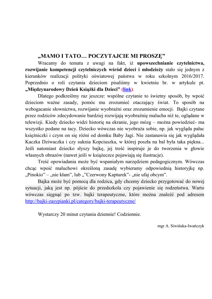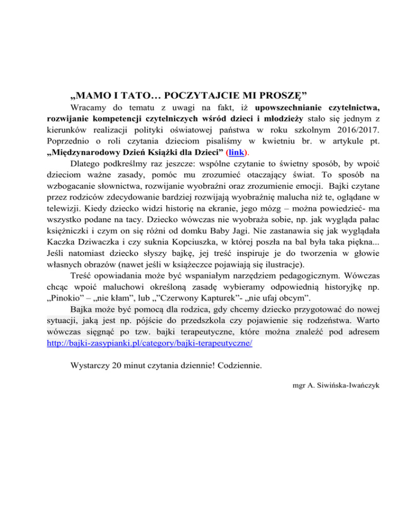 „MAMO I TATO… POCZYTAJCIE MI PROSZĘ” Wracamy do tematu z uwagi na fakt, iż upowszechnianie czytelnictwa, rozwijanie kompetencji czytelniczych wśród dzieci i młodzieży stało się jednym z kierunków realizacji polityki oświatowej państwa w roku szkolnym 2016/2017. Poprzednio o roli czytania dzieciom pisaliśmy w kwietniu br. w artykule pt. „Międzynarodowy Dzień Książki dla Dzieci” (link). Dlatego podkreślmy raz jeszcze: wspólne czytanie to świetny sposób, by wpoić dzieciom ważne zasady, pomóc mu zrozumieć otaczający świat. To sposób na wzbogacanie słownictwa, rozwijanie wyobraźni oraz zrozumienie emocji. Bajki czytane przez rodziców zdecydowanie bardziej rozwijają wyobraźnię malucha niż te, oglądane w telewizji. Kiedy dziecko widzi historię na ekranie, jego mózg – można powiedzieć- ma wszystko podane na tacy. Dziecko wówczas nie wyobraża sobie, np. jak wygląda pałac księżniczki i czym on się różni od domku Baby Jagi. Nie zastanawia się jak wyglądała Kaczka Dziwaczka i czy suknia Kopciuszka, w której poszła na bal była taka piękna... Jeśli natomiast dziecko słyszy bajkę, jej treść inspiruje je do tworzenia w głowie własnych obrazów (nawet jeśli w książeczce pojawiają się ilustracje). Treść opowiadania może być wspaniałym narzędziem pedagogicznym. Wówczas chcąc wpoić maluchowi określoną zasadę wybieramy odpowiednią historyjkę np. „Pinokio” – „nie kłam”, lub „”Czerwony Kapturek”- „nie ufaj obcym”. Bajka może być pomocą dla rodzica, gdy chcemy dziecko przygotować do nowej sytuacji, jaką jest np. pójście do przedszkola czy pojawienie się rodzeństwa. Warto wówczas sięgnąć po tzw. bajki terapeutyczne, które można znaleźć pod adresem http://bajki-zasypianki.pl/category/bajki-terapeutyczne/ Wystarczy 20 minut czytania dziennie! Codziennie. mgr A. Siwińska-Iwańczyk