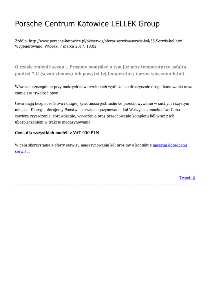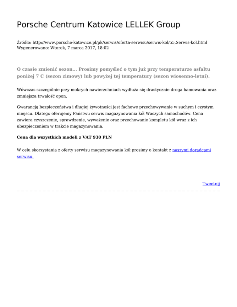 Porsche Centrum Katowice LELLEK Group Źródło: http://www.porsche-katowice.pl/pk/serwis/oferta-serwisu/serwis-kol/55,Serwis-kol.html Wygenerowano: Wtorek, 7 marca 2017, 18:02 O czasie zmienić sezon... Prosimy pomyśleć o tym już przy temperaturze asfaltu poniżej 7 C (sezon zimowy) lub powyżej tej temperatury (sezon wiosenno-letni). Wówczas szczególnie przy mokrych nawierzchniach wydłuża się drastycznie droga hamowania oraz zmniejsza trwałość opon. Gwarancją bezpieczeństwa i długiej żywotności jest fachowe przechowywanie w suchym i czystym miejscu. Dlatego oferujemy Państwu serwis magazynowania kół Waszych samochodów. Cena zawiera czyszczenie, sprawdzenie, wyważenie oraz przechowanie kompletu kół wraz z ich ubezpieczeniem w trakcie magazynowania. Cena dla wszystkich modeli z VAT 930 PLN W celu skorzystania z oferty serwisu magazynowania kół prosimy o kontakt z naszymi doradcami serwisu. Tweetnij