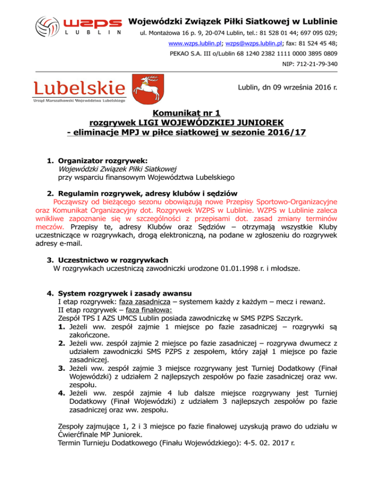 Wojewódzki Związek Piłki Siatkowej w Lublinie ul. Montażowa 16 p. 9, 20-074 Lublin, tel.: 81 528 01 44; 697 095 029; www.wzps.lublin.pl; [email protected]; fax: 81 524 45 48; PEKAO S.A. III o/Lublin 68 1240 2382 1111 0000 3895 0809 NIP: 712-21-79-340 Lublin, dn 09 września 2016 r. Komunikat nr 1 rozgrywek LIGI WOJEWÓDZKIEJ JUNIOREK - eliminacje MPJ w piłce siatkowej w sezonie 2016/17 1. Organizator rozgrywek: Wojewódzki Związek Piłki Siatkowej przy wsparciu finansowym Województwa Lubelskiego 2. Regulamin rozgrywek, adresy klubów i sędziów Począwszy od bieżącego sezonu obowiązują nowe Przepisy Sportowo-Organizacyjne oraz Komunikat Organizacyjny dot. Rozgrywek WZPS w Lublinie. WZPS w Lublinie zaleca wnikliwe zapoznanie się w szczególności z przepisami dot. zasad zmiany terminów meczów. Przepisy te, adresy Klubów oraz Sędziów – otrzymają wszystkie Kluby uczestniczące w rozgrywkach, drogą elektroniczną, na podane w zgłoszeniu do rozgrywek adresy e-mail. 3. Uczestnictwo w rozgrywkach W rozgrywkach uczestniczą zawodniczki urodzone 01.01.1998 r. i młodsze. 4. System rozgrywek i zasady awansu I etap rozgrywek: faza zasadnicza – systemem każdy z każdym – mecz i rewanż. II etap rozgrywek – faza finałowa: Zespół TPS I AZS UMCS Lublin posiada zawodniczkę w SMS PZPS Szczyrk. 1. Jeżeli ww. zespół zajmie 1 miejsce po fazie zasadniczej – rozgrywki są zakończone. 2. Jeżeli ww. zespół zajmie 2 miejsce po fazie zasadniczej – rozgrywa dwumecz z udziałem zawodniczki SMS PZPS z zespołem, który zajął 1 miejsce po fazie zasadniczej. 3. Jeżeli ww. zespół zajmie 3 miejsce rozgrywany jest Turniej Dodatkowy (Finał Wojewódzki) z udziałem 2 najlepszych zespołów po fazie zasadniczej oraz ww. zespołu. 4. Jeżeli ww. zespół zajmie 4 lub dalsze miejsce rozgrywany jest Turniej Dodatkowy (Finał Wojewódzki) z udziałem 3 najlepszych zespołów po fazie zasadniczej oraz ww. zespołu. Zespoły zajmujące 1, 2 i 3 miejsce po fazie finałowej uzyskują prawo do udziału w Ćwierćfinale MP Juniorek. Termin Turnieju Dodatkowego (Finału Wojewódzkiego): 4-5. 02. 2017 r. Wojewódzki Związek Piłki Siatkowej w Lublinie ul. Montażowa 16 p. 9, 20-074 Lublin, tel.: 81 528 01 44; 697 095 029; www.wzps.lublin.pl; [email protected]; fax: 81 524 45 48; PEKAO S.A. III o/Lublin 68 1240 2382 1111 0000 3895 0809 NIP: 712-21-79-340 Termin zakończenia I rundy: 27.11.2016 Termin zakończenia II rundy (rewanżowej): 29.01.2017 5. Zespoły uczestniczące 1. TPS Lublin 2. SL Salos Kalina Lublin 3. TKS Tomasovia Tomaszów Lubelski 4. SKS Szóstka TPS Biała Podlaska 5. UKS Międzyrzecka Trójka MIKA Międzyrzec Podlaski 6. Terminarz rozgrywek 1 2 3 4 5 6 7 8 9 10 I runda 16.10.2016 SL Salos Kalina Lublin * UKS Międzyrzecka Trójka MIKA Międzyrzec Podlaski TKS Tomasovia Tomaszów Lubelski * SKS Szóstka TPS Biała Podlaska 23.10.2016 UKS Międzyrzecka Trójka MIKA Międzyrzec Podlaski * TKS Tomasovia Tomaszów Lubelski TPS Lublin * SL Salos Kalina Lublin 30.10.2016 TPS Lublin * TKS Tomasovia Tomaszów Lubelski SKS Szóstka TPS Biała Podlaska * UKS Międzyrzecka Trójka MIKA Międzyrzec Podlaski 20.11.2016 TPS Lublin * SKS Szóstka TPS Biała Podlaska SL Salos Kalina Lublin * TKS Tomasovia Tomaszów Lubelski 27.11.2016 SKS Szóstka TPS Biała Podlaska * SL Salos Kalina Lublin UKS Międzyrzecka Trójka MIKA Międzyrzec Podlaski * TPS Lublin Wojewódzki Związek Piłki Siatkowej w Lublinie ul. Montażowa 16 p. 9, 20-074 Lublin, tel.: 81 528 01 44; 697 095 029; www.wzps.lublin.pl; [email protected]; fax: 81 524 45 48; PEKAO S.A. III o/Lublin 68 1240 2382 1111 0000 3895 0809 NIP: 712-21-79-340 11 12 13 14 15 16 17 18 19 20 II runda 11.12.2016 UKS Międzyrzecka Trójka MIKA Międzyrzec Podlaski * SL Salos Kalina Lublin SKS Szóstka TPS Biała Podlaska * TKS Tomasovia Tomaszów Lubelski 18.12.2016 TKS Tomasovia Tomaszów Lubelski * UKS Międzyrzecka Trójka MIKA Międzyrzec Podlaski SL Salos Kalina Lublin * TPS Lublin 8.01.2017 TKS Tomasovia Tomaszów Lubelski * TPS Lublin UKS Międzyrzecka Trójka MIKA Międzyrzec Podlaski * SKS Szóstka TPS Biała Podlaska 15.01.2017 SKS Szóstka TPS Biała Podlaska * TPS Lublin TKS Tomasovia Tomaszów Lubelski * SL Salos Kalina Lublin 29.01.2017 SL Salos Kalina Lublin * SKS Szóstka TPS Biała Podlaska TPS Lublin * UKS Międzyrzecka Trójka MIKA Międzyrzec Podlaski Terminarz nie może być samowolnie zmieniany przez Kluby. Przypomina się o obowiązku zgłaszania godziny i miejsca rozgrywania zawodów w regulaminowym terminie za pośrednictwem poczty elektronicznej do Biura WZPS w Lublinie. Klub ma obowiązek na co najmniej 3 dni przed przed zawodami zawiadomić całą obsadę sędziowską o dacie, godzinie i miejscu rozgrywania zawodów. Przewodniczący WGiD WZPS w Lublinie / ̶ / Edward Dziedzina - Wiwer