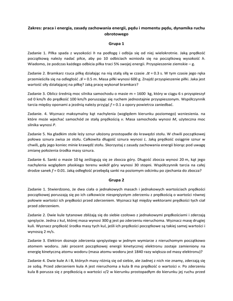 Zakres: praca i energia, zasady zachowania energii, pędu i momentu pędu, dynamika ruchu obrotowego Grupa 1 Zadanie 1. Piłka spada z wysokości h na podłogę i odbija się od niej wielokrotnie. Jaką prędkość początkową należy nadać piłce, aby po 10 odbiciach wzniosła się na początkową wysokość h. Wiadomo, że podczas każdego odbicia piłka traci 5% swojej energii. Przyspieszenie ziemskie – g. Zadanie 2. Bramkarz rzuca piłkę działając na nią stałą siłą w czasie t = 0.3 s. W tym czasie jego ręka przemieściła się na odległość l = 0.5 m. Masa piłki wynosi 600 g. Znajdź przyspieszenie piłki. Jaka jest wartość siły działającej na piłkę? Jaką pracę wykonał bramkarz? Zadanie 3. Oblicz średnią moc silnika samochodu o masie m = 1600 kg, który w ciągu 6 s przyspieszył od 0 km/h do prędkość 100 km/h poruszając się ruchem jednostajnie przyspieszonym. Współczynnik tarcia między oponami a jezdnią należy przyjąć f = 0.1 a opory powietrza zaniedbać. Zadanie. 4. Wyznacz maksymalny kąt nachylenia (względem kierunku poziomego) wzniesienia. na które może wjechać samochód ze stałą prędkością v. Masa samochodu wynosi M, użyteczna moc silnika wynosi P. Zadanie 5. Na gładkim stole leży sznur ułożony prostopadle do krawędzi stołu. W chwili początkowej połowa sznura zwisa ze stołu. Całkowita długość sznura wynosi L. Jaką prędkość osiągnie sznur w chwili, gdy jego koniec minie krawędź stołu. Skorzystaj z zasady zachowania energii biorąc pod uwagę zmianę położenia środka masy sznura. Zadanie 6. Sanki o masie 10 kg ześlizgują się ze zbocza góry. Długość zbocza wynosi 20 m, kąt jego nachylenia względem płaskiego terenu wokół góry wynosi 30 stopni. Współczynnik tarcia na całej drodze sanek f = 0.01. Jaką odległość przebędą sanki na poziomym odcinku po zjechania do zbocza? Grupa 2 Zadanie 1. Stwierdzono, że dwa ciała o jednakowych masach i jednakowych wartościach prędkości początkowej poruszają się po ich całkowicie niesprężystym zderzeniu z prędkością o wartości równej połowie wartości ich prędkości przed zderzeniem. Wyznacz kąt między wektorami prędkości tych ciał przed zderzeniem. Zadanie 2. Dwie kule tytanowe zbliżają się do siebie czołowo z jednakowymi prędkościami i zderzają sprężycie. Jedna z kul, której masa wynosi 300 g jest po zderzeniu nieruchoma. Wyznacz masę drugiej kuli. Wyznacz prędkość środka masy tych kul, jeśli ich prędkości początkowe są takiej samej wartości i wynoszą 2 m/s. Zadanie 3. Elektron doznaje zderzenia sprężystego w jednym wymiarze z nieruchomym początkowo atomem wodoru. Jaki procent początkowej energii kinetycznej elektronu zostaje zamieniony na energię kinetyczną atomu wodoru (masa atomu wodoru jest 1840 razy większa od masy elektronu)? Zadanie 4. Dwie kule A i B, których masy różnią się od siebie, ale żadnej z nich nie znamy, zderzają się ze sobą. Przed zderzeniem kula A jest nieruchoma a kula B ma prędkość o wartości v. Po zderzeniu kula B porusza się z prędkością o wartości v/2 w kierunku prostopadłym do kierunku jej ruchu przed zderzeniem. W jakim kierunku porusza się po zderzeniu kula A? Wykaż, że na podstawie tych danych nie można wyznaczyć prędkości kuli A po zderzeniu. Zadanie 5. Pudełko umieszczono na wadze wyskalowanej w jednostkach masy, którą wytarowano tak, aby wskazywała zero, gdy pudełko jest puste. Następnie do pudełka wrzucano kulki kamienne z wysokości h = 7.6 m nad dnem pudełka, z częstością R równą 100 kulek na sekundę. Każda z kulek miała masę m = 4.5 g. Wyznacz wskazanie wagi po czasie t = 10 s od początku wsypywania kulek, zakładając, że zderzenia kulek z pudełkiem były całkowicie niesprężyste. Zadanie 6. Wagon towarowy o masie 3.18·104 kg zderza się ze znajdującym się początkowo w spoczynku wagonem sypialnym. Po zderzeniu poruszają się one razem, a 27% początkowej energii kinetycznej zamienia się w energię termiczną, akustyczną, ruchu drgającego itp. Wyznacz masę wagonu sypialnego. Grupa 3 Zadanie 1. Na końcach nieważkiej nici, przerzuconej przez blok o promieniu R = 10 cm i momencie bezwładności względem środka masy I0 = 0.005 kg·m2, zawieszono ciężarki o masach m1 = 2 kg i m2 = 3 kg. Lżejszy z nich znajduje się o d = 2 m niżej od cięższego. Po jakim czasie znajdą się one na tej samej wysokości, jeśli puścimy je swobodnie? Przyjmij przyspieszenie ziemskie g = 10 m/s2. Wszelkie opory ruchu pominąć, nić nie ślizga się po bloku. Zakładając, że blok ma kształt jednorodnego walca oblicz jego masę. Zadanie 2. Z jaką siłą należy przycisnąć klocek hamulcowy do powierzchni koła rozpędowego o momencie bezwładności I0 i promieniu r, aby zatrzymać je po upływie czasu t, jeżeli wiruje ono z prędkością kątową 0? Współczynnik tarcia wynosi f. Zadanie 3. Na jednorodnym krążku o masie M i promieniu R nawinięta jest nierozciągliwa linka, której jeden z końców umocowany jest u sufitu. Oblicz przyspieszenie kątowe i liniowe środka ciężkości krążka oraz naciąg linki, jeżeli w pewnej chwili krążek zaczął spadać swobodnie Zadanie 4. Na poziomym stole leży szpulka nici. Z jakim przyspieszeniem a będzie się poruszać oś szpulki, jeśli ciągnąć ją siłą F? Pod jakim kątem należy ciągnąć nić, by szpulka poruszała się w prawo? Szpulka toczy się bez poślizgu. Moment bezwładności szpulki o masie m względem jej środka wynosi I0. Wskazówka: Należy napisać równania ruchów: postępowego środka masy oraz obrotowego szpulki i stąd wyprowadzić wzór na przyspieszenie a = F•(cos - r/R)/(m + I0/R2). Zadanie 5. Dwie masy: M i m są połączone prętem o długości L i znikomo małej masie. Pokazać, że moment bezwładności względem osi prostopadłej do pręta jest najmniejszy dla osi przechodzącej przez środek masy układu. Zadanie 6. Dziewczynka o mas