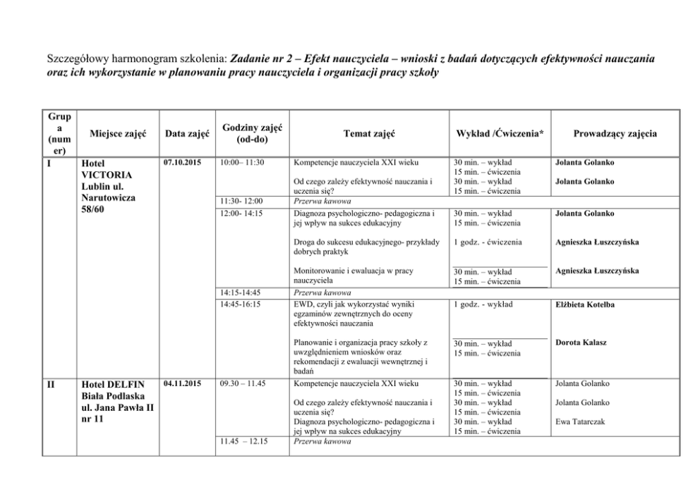 Szczegółowy harmonogram szkolenia: Zadanie nr 2 – Efekt nauczyciela – wnioski z badań dotyczących efektywności nauczania oraz ich wykorzystanie w planowaniu pracy nauczyciela i organizacji pracy szkoły Grup a (num er) I Miejsce zajęć Hotel VICTORIA Lublin ul. Narutowicza 58/60 Data zajęć Godziny zajęć (od-do) 07.10.2015 10:00– 11:30 Kompetencje nauczyciela XXI wieku 11:30- 12:00 Od czego zależy efektywność nauczania i uczenia się? Przerwa kawowa 04.11.2015 Hotel DELFIN Biała Podlaska ul. Jana Pawła II nr 11 Wykład /Ćwiczenia* Prowadzący zajęcia 30 min. – wykład 15 min. – ćwiczenia 30 min. – wykład 15 min. – ćwiczenia Jolanta Golanko Diagnoza psychologiczno- pedagogiczna i jej wpływ na sukces edukacyjny 30 min. – wykład 15 min. – ćwiczenia Jolanta Golanko Droga do sukcesu edukacyjnego- przykłady dobrych praktyk 1 godz. - ćwiczenia Agnieszka Łuszczyńska Monitorowanie i ewaluacja w pracy nauczyciela 30 min. – wykład 15 min. – ćwiczenia Agnieszka Łuszczyńska Przerwa kawowa EWD, czyli jak wykorzystać wyniki egzaminów zewnętrznych do oceny efektywności nauczania 1 godz. - wykład Elżbieta Kotelba Planowanie i organizacja pracy szkoły z uwzględnieniem wniosków oraz rekomendacji z ewaluacji wewnętrznej i badań 30 min. – wykład 15 min. – ćwiczenia Dorota Kalasz 09.30 – 11.45 Kompetencje nauczyciela XXI wieku Jolanta Golanko 11.45 – 12.15 Od czego zależy efektywność nauczania i uczenia się? Diagnoza psychologiczno- pedagogiczna i jej wpływ na sukces edukacyjny Przerwa kawowa 30 min. – wykład 15 min. – ćwiczenia 30 min. – wykład 15 min. – ćwiczenia 30 min. – wykład 15 min. – ćwiczenia 12:00- 14:15 14:15-14:45 14:45-16:15 II Temat zajęć Jolanta Golanko Jolanta Golanko Ewa Tatarczak 12.15 – 14.30 14.30 – 15.00 15.00 – 15.45 III Hotel KOZAK ul. Hrubieszowska 37 22-100 Chełm 19.11.2015 12.00– 12.45 12.45- 13.30 13.30-14.15 14.15- 15.00 15.00-15.30 15.30-16.15 16.15– 17.00 17.00- 17.45 IV 18.11.2015 Centrum Konferencyjno – r. Hotelowe ALEX, środa ul. Stefana Okrzei 32, 22400 Zamościu 10:30-11:15 11:15-12:00 12:00-12:30 Monitorowanie i ewaluacja w pracy nauczyciela Droga do sukcesu edukacyjnego- przykłady dobrych praktyk EWD, czyli jak wykorzystać wyniki egzaminów zewnętrznych do oceny efektywności nauczania Przerwa kawowa 30 min. – wykład 15 min. – ćwiczenia 1 godz. – ćwiczenia Ewa Tatarczak 1 godz. – wykład Anna Filipiuk Planowanie i organizacja pracy szkoły z uwzględnieniem wniosków oraz rekomendacji z ewaluacji wewnętrznej i badań Kompetencje nauczyciela XXI wieku 30 min. – wykład 15 min. – ćwiczenia Anna Filipiuk 30 min- wykład 15 min- ćwiczenia Dorota Mandzińska Od czego zależy efektywność nauczania i uczenia się? Diagnoza psychologiczno- pedagogiczna i jej wpływ na sukces edukacyjny Droga do sukcesu edukacyjnego- przykłady dobrych praktyk PRZERWA KAWOWA 30 min- wykład 15 min- ćwiczenia 30 min- wykład 15 min- ćwiczenia 45 min – ćwiczenia Małgorzata Kołodziejczyk Monitorowanie i ewaluacja w pracy nauczyciela EWD, czyli jak wykorzystać wyniki egzaminów zewnętrznych do oceny efektywności nauczania Planowanie i organizacja pracy szkoły z uwzględnieniem wniosków oraz rekomendacji z ewaluacji wewnętrznej i badań Kompetencje nauczyciela XXI wieku 30 min- wykład 15 min- ćwiczenia 1 godz. - wykład Od czego zależy efektywność nauczania i uczenia się? Przerwa kawowa Anna Filipiuk Małgorzata Kołodziejczyk Małgorzata Kołodziejczyk Dorota Mandzińska Dorota Mandzińska 30 min- wykład 15 min- ćwiczenia Dorota Mandzińska 30 min- wykład 15 min- ćwiczenia 30 min- wykład 15 min- ćwiczenia Maria Dyrda Jolanta Piekarczyk 400 Zamościu 12:30-13:15 13:15-14:00 14:00-14:45 14:45-15:15 15:15-16:00 16:00-16:45 * w formie dyskusji, analizy materiałów Diagnoza psychologiczno- pedagogiczna i jej wpływ na sukces edukacyjny Droga do sukcesu edukacyjnego- przykłady dobrych praktyk Monitorowanie i ewaluacja w pracy nauczyciela Przerwa kawowa 30 min- wykład 15 min- ćwiczenia 1 godz. - ćwiczenia Maria Dyrda 30 min- wykład 15 min- ćwiczenia Dorota Pintal EWD, czyli jak wykorzystać wyniki egzaminów zewnętrznych do oceny efektywności nauczania. Planowanie i organizacja pracy szkoły z uwzględnieniem wniosków oraz rekomendacji z ewaluacji wewnętrznej i badań. 1 godz. - wykład. Jolanta Piekarczyk 30 min- wykład 15 min- ćwiczenia Dorota Pintal Dorota Pintal