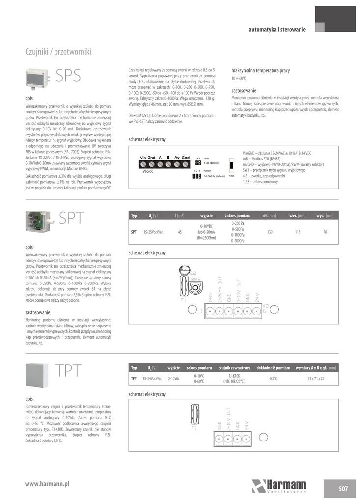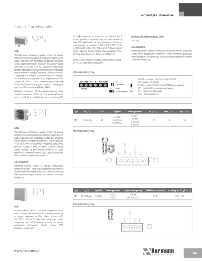 automatyka i sterowanie Czujniki / przetworniki SPS opis Wielozakresowy przetwornik o wysokiej czułości do pomiaru różnicy ciśnień powietrza lub innych niepalnych i nieagresywnych gazów. Przetwornik ten przekształca mechanicznie zmierzoną wartość odchyłki membrany silikonowej na wyjściowy sygnał elektryczny 0-10V lub 0-20 mA. Dodatkowe zastosowanie rezystorów półprzewodnikowych redukuje wpływ występującej różnicy temperatur na sygnał wyjściowy. Obudowa wykonana z odpornego na uderzenia i promieniowanie UV tworzywa ABS w kolorze jasnoszarym (RAL 7002). Stopień ochrony: IP54. Zasilanie 18-32Vdc / 15-24Vac, analogowy sygnał wyjściowy 0-10V lub 0-20mA ustawiany za pomocą zworki, cyfrowy sygnał wyjściowy PWM, komunikacja Modbus RS485. Czas reakcji regulowany za pomocą zworki w zakresie 0,5 do 5 sekund. Sygnalizacja poprawnej pracy oraz awarii za pomocą diody LED zlokalizowanej na płytce drukowanej. Przetwornik może pracować w zakresach: 0-100, 0-250, 0-500, 0-750, 0-1000, 0-2000, -50 do +50, -100 do +100 Pa. Wybór poprzez zworkę. Fabryczny zakres 0-1000Pa. Waga urządzenia: 120 g. Wymiary: głęb.ć 46 mm, szer. 80 mm, wys. 85(65) mm. Dławik M12x1.5, króćce podciśnienia 2 x 6mm. Sondy pomiarowe PVC-SET należy zamówić oddzielnie. opis Wielozakresowy przetwornik o wysokiej czułości do pomiaru różnicy ciśnień powietrza lub innych niepalnych i nieagresywnych gazów. Przetwornik ten przekształca mechanicznie zmierzoną wartość odchyłki membrany silikonowej na sygnał elektryczny 0-10V lub 0-20mA (R=250[Ohm]). Dostępne są cztery zakresy pomiaru: 0-250Pa, 0-500Pa, 0-1000Pa, 0-2000Pa. Wyboru zakresu dokonuje się przy pomocy zworek S1 na płytce przetwornika. Dokładność pomiaru 2,5%. Stopien ochrony IP20. Króćce pomiarowe należy nabyć osobno. 10 ÷ 60°C. zastosowanie Monitoring poziomu ciśnienia w instalacji wentylacyjnej: kontrola wentylatora i stanu filtrów, zabezpieczenie nagrzewnic i innych elementów grzewczych, kontrola przepływu, monitoring klap przeciwpożarowych i przepustnic, element automatyki budynku, itp.. schemat elektryczny Vin/GND – zasilanie 15-24 VAC ±10 %/18-34 VDC A/B – Modbus RTU (RS485) Ao/GND – wyjście 0-10V/0-20ma)/PWM(otwarty kolektor) SW1 – przełącznik trybu sygnału wyjściowego 4-5 – zworka, czas odpowiedzi 1,2,3 – zakres pomiarowy Dokładność pomiarowa ±3% dla wyjścia analogowego, długa stabilność pomiarowa ±1% na rok. Przetwornik wyposażony jest w przycisk do ręcznej kalibracji punktu pomiarowego”0”. SPT maksymalna temperatura pracy Typ Un [V] I [mA] wyjście zakres pomiaru dł. [mm] szer. [mm] wys. [mm] SPT 15-25Vdc/Vac 45 0-10VDC lub 0-20mA (R=250Ohm) 0-250 Pa 0-500Pa 0-1000Pa 0-2000Pa 139 118 70 schemat elektryczny zastosowanie Monitoring poziomu ciśnienia w instalacji wentylacyjnej: kontrola wentylatora i stanu filtrów, zabezpieczenie nagrzewnic i innych elementów grzewczych, kontrola przepływu, monitoring klap przeciwpożarowych i przepustnic, element automatyki budynku, itp. TPT opis Typ TPT Un [V] 15-24Vdc/Vac wyjście zakres pomiaru czujnik zewnętrzny dokładność pomiaru wymiary A x B x gł. [mm] 0-10Vdc 0-10°C 0-60°C TJ-K10K (NTC 10k/25°C ) 0,5°C 71 x 71 x 25 schemat elektryczny Pomieszczeniowy czujnik i przetwornik temperatury (transmiter) dokonujący konwersji wartości zmierzonej temperatury na sygnał analogowy 0-10Vdc. Zakres pomiaru 0-30 lub 0-60 °C. Możliwość podłączenia zewnętrzego czujnika temperatury typu TJ-K10K. Zewnętrzny czujnik nie stanowi wyposażenia przetwornika. Stopień ochrony IP20. Dokładnosć pomiaru 0,5°C. 507