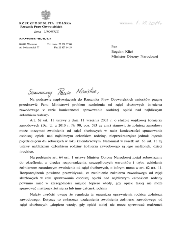 R Z E C Z P O S P O L I T A POLSKA Rzecznik Praw Obywatelskich Irena LIPOWICZ RPO-668187-III/11/LN 00-090 Warszawa Al. Solidarności 77 Tel. centr. 22 551 77 00 Fax 22 827 64 53 Pan Bogdan Klich Minister Obrony Narodowej Na podstawie napływających do Rzecznika Praw Obywatelskich wniosków pragnę przedstawić Panu Ministrowi problem zwolnienia od zajęć służbowych żołnierza zawodowego w razie konieczności sprawowania osobistej opieki nad najbliższym członkiem rodziny. Art. 62 ust. 11 ustawy z dnia 11 września 2003 r. o służbie wojskowej żołnierzy zawodowych (Dz. U. z 2010 r. Nr 90, poz. 593 ze zm.) stanowi, że żołnierz zawodowy może otrzymać zwolnienie od zajęć służbowych w razie konieczności sprawowania osobistej opieki nad najbliższym członkiem rodziny, nieprzekraczające jednak łącznie pięćdziesięciu dni roboczych w roku kalendarzowym. Natomiast w świetle art. 63 ust. 13 tej ustawy najbliższym członkiem rodziny żołnierza zawodowego są jego małżonek, dzieci i rodzice. Na podstawie art. 64 ust. 1 ustawy Minister Obrony Narodowej został zobowiązany do określenia, w drodze rozporządzenia, szczegółowych warunków i trybu udzielania żołnierzom zawodowym zwolnienia od zajęć służbowych, o którym mowa w art. 62 ust. 11. Rozporządzenie powinno przewidywać, że zwolnienie żołnierza zawodowego od zajęć służbowych w celu sprawowania osobistej opieki nad najbliższym członkiem rodziny powinno mieć w szczególności miejsce dopiero wtedy, gdy opieki takiej nie może sprawować małżonek żołnierza lub inny członek rodziny Należy zwrócić uwagę że regulacja ta ogranicza uprawnienia rodzica żołnierza zawodowego. Dotyczy to zwłaszcza uzależnienia zwolnienia żołnierza zawodowego od zajęć służbowych „dopiero wtedy, gdy opieki takiej nie może sprawować małżonek 2 żołnierza lub inny członek rodziny'". Nie kwestionując odmienności stosunku służbowego żołnierza zawodowego w porównaniu ze stosunkiem pracy czy stosunkiem służbowym innych służb mundurowych uważam jednak, że przyjęte rozwiązania nie powinny powodować nadmiernego ograniczenia praw rodzicielskich żołnierzy zawodowych. Może to narazić kwestionowane regulacje na zarzut naruszenia konstytucyjnych standardów ochrony praw rodzicielskich, jak również naruszenia zasady równości wobec prawa tym bardziej, że obecnie istnieje możliwość podejmowania zawodowej służby wojskowej przez kobiety, które są głównymi adresatkami omawianych przepisów. Należy także zauważyć, że wskazane wyżej regulacje w sposób zasadniczy różnią się także od rozwiązać przyjętych na gruncie prawa pracy i przepisów dotyczących innych służb mundurowych. Kwestia możliwości zwolnienia od zajęć służbowych lub zwolnienia od pracy w razie konieczności osobistego sprawowania opieki nad dziećmi i innymi członkami rodziny uregulowana jest w sposób jednolity we wszystkich przepisach dotyczących zarówno prawa pracy jak i innych służb mundurowych. - art. 32 i 34 ustawy z dnia 25 czerwca 1999 r. o świadczeniach pieniężnych z ubezpieczenia społecznego w razie choroby i macierzyństwa (Dz. U. z 2010 r. Nr 77, poz. 512 ze zm.); art. 152 ustawy z dnia 9 kwietnia 2010 r. o Służbie Więziennej (Dz. U. z 2010 r. Nr 79, poz. 523 ze zm.); art. 152 ust. 2 ustawy z dnia 27 sierpnia 2009 r. o Służbie Celnej (Dz. U. z 2009 r. Nr 168, poz. 1323 ze zm.); § 4-6 rozporządzenia Ministra Spraw Wewnętrznych i Administracji z dnia 2 września 2002 r. w sprawie szczegółowych praw i obowiązków oraz przebiegu służby policjantów (Dz. U. z 2002 r. Nr 151, poz. 1261); § 9-10 Rozporządzenia Ministra Spraw Wewnętrznych i Administracji z dnia 14 czerwca 2002 r. w sprawie zakresu obowiązków oraz podstaw, zakresu i trybu udzielania zwolnień od zajęć służbowych funkcjonariuszom Straży Granicznej (Dz. U. z 2002 r. Nr 97, poz. 879). W związku z powyższym, działając na podstawie art. 16 ust. 2 pkt 1 ustawy z dnia 15 lipca 1987 r. o Rzeczniku Praw Obywatelskich (Dz. U. z 2001 r, Nr 14, poz. 147 ze zm.) - zwracam się do Pana Ministra z uprzejmą prośbą o przedstawienie stanowiska w tej sprawie.