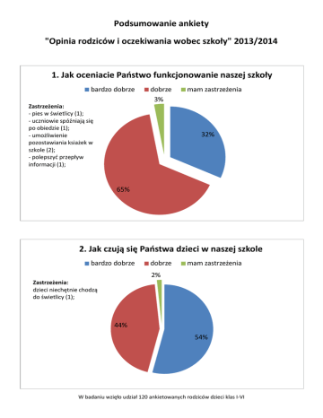 Podsumowanie ankiety "Opinia rodziców i oczekiwania wobec szkoły" 2013/2014 1. Jak oceniacie Państwo funkcjonowanie naszej szkoły bardzo dobrze dobrze 3% Zastrzeżenia: - pies w świetlicy (1); - uczniowie spóźniają się po obiedzie (1); - umożliwienie pozostawiania ksiażek w szkole (2); - polepszyć przepływ informacji (1); mam zastrzeżenia 32% 65% 2. Jak czują się Państwa dzieci w naszej szkole bardzo dobrze dobrze mam zastrzeżenia 2% Zastrzeżenia: dzieci niechętnie chodzą do świetlicy (1); 44% 54% W badaniu wzięło udział 120 ankietowanych rodziców dzieci klas I-VI 3. Czy nasuwają się Państwu ewentualne propozycje zmian możliwych do wprowadzenia Propozycje: - zamknięcie sklepiku (6); - zmiana oferty sklepiku na zdrową (4); - więcej zajęć sportowych (1); - dodatkowy język (2); - przygotowania do konkursu Kangur (1); - lepszy dostęp do gr. Zuchów (1); - świetlica dłużej otwarta (6:3017:00) (2) - szafki na podręczniki (2); tak 16% nie 84% Propozycje: - wprowadzenie sportów walki (1); - Dzień Rodzica (1); - świetlica od 6:00-16:00 (1); - powrót do mundurków (1) - więcej kół zainteresowań (2) - zabezpieczenie wejść do szkoły (1); 4. Czy widzą Państwo nowe płaszczyzny współpracy "szkoła-rodzic" lub "rodzic-szkoła" Jakie: - dziennik elektroniczny (4); - kontakt e-mail z nauczycielami (2); - przesyłanie informacji elektronicznie (z zebrań); - otwartość na współpracę; - Dzień Rodzica w kl. I-III (prezentacja zawodów); - zajęcia terapii ruchowej dla dzieci i rodziców (wspólnie); tak 13% nie 87% W badaniu wzięło udział 120 ankietowanych rodziców dzieci klas I-VI 5. Czy wyrażacie Państwo zainteresowanie czynnym angażowaniem się w proces tworzenia nowych, ciekawych przedsięwzięć na terenie szkoły? Jakie: - w sporadycznych akcjach; pikniki; zajęcia sportowe wspólnie; sprzedaż ciast; (IA) - zajęcia pozaszkolne, sportowe (IC) - zbiórki, akcje wspomagające działalność szkoły (IIA); - bal karnawałowy rodziców, piknik, zbiórki (IIC); tak 36% nie 64% Jakie: - spotkania z ciekawymi ludźmi, działalność charytatywna, przedstawienia teatralne (IIIB) - wycieczki, konkursy, FINANSOWO (IIIC) - imprezy szkolne, zbiórki korków, makulatury (kl.IV) - organizowanie integracyjnych imprez (VC) 6. Jakie dziedziny funkcjonowania szkoły są Państwo w stanie wesprzeć i w jakiej formie? Jakie: - pieczenie ciast, prace plastyczne, wsparcie edukacji prozdrowotnej, finansowej, festyny - fanty, napoje; (IA) - naprawa szafek, opieka nad klasą, sport, logistyka (IB) - materiały biurowe do świetlicy, pomoc w festynach, malowanie twarzy, wsparcie finansowe (IC) - pośrednictwo w organizacji koncertów na terenie szkoły (IIA) - zorganizowanie Dnia Tematycznego (humanistyka), czytanie bajek terapeutycznych (IIIB) - konkursy, finansowo (IIIC) ? Jakie: - korki, makulatura, akcje charytatywne (kl. IV) - zakup papieru xero, zakup pomocy dydaktycznych (VA); - pomoc w przygotowywaniu uroczystości szkolnych (VC); - składki, pomoc w remontowaniu sal, zakup pomocy naukowych, nagrody dla dzieci (kl. VI) W badaniu wzięło udział 120 ankietowanych rodziców dzieci klas I-VI 7. Czego oczekujecie Państwo od szkoły? Oczekiwania: - zapewnienie edukacji i bezpieczeństwa w trakcie zajęć - sprawiedliwe ocenianie - pozyskiwania funduszy unijnych - wysoki poziom nauczania - wyjazdy na basen - przygotowania do egz. 6-klasisty - dłuższego działania świetlicy - żeby panie ze świetlicy organizowały dzieciom czas i pomagały odrabiać zadania domowe - zajęć sportowych po zajęciach szkolnych (kl.I-III) - większej ilości szafek ? Oczekiwania: - kształtowania dzieci w światopoglądzie chrześcijańskim - ochrony dzieci przed agresją fizyczną i psychiczną - aby moje dziecko nauczyło się obowiązkowości i szacunku do innych - więcej rygoru - więcej dyscypliny - pomocy w wychowywaniu dzieci - nauki właściwego zachowania - rozwijania umiejętności pracy w grupie W badaniu wzięło udział 120 ankietowanych rodziców dzieci klas I-VI