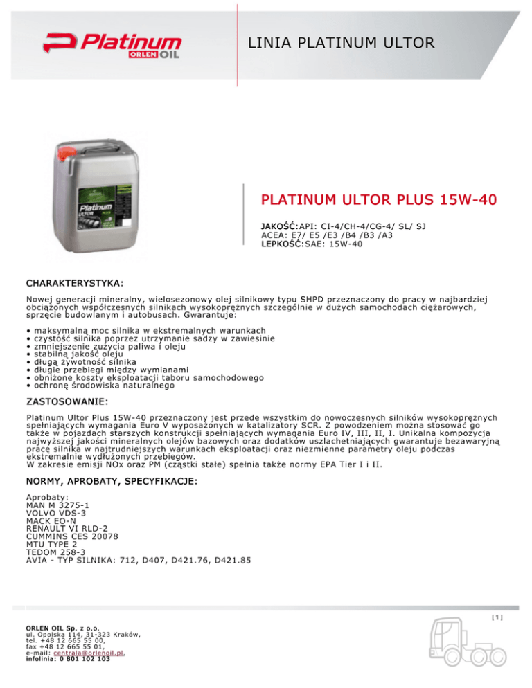 LINIA PLATINUM ULTOR PLATINUM ULTOR PLUS 15W40 JAKOŚĆ: JAKOŚĆ:API: CI4/CH4/CG4/ SL/ SJ ACEA: E7/ E5 /E3 /B4 /B3 /A3 LEPKOŚĆ: LEPKOŚĆ:SAE: 15W40 CHARAKTERYSTYKA: Nowej generacji mineralny, wielosezonowy olej silnikowy typu SHPD przeznaczony do pracy w najbardziej obciążonych współczesnych silnikach wysokoprężnych szczególnie w dużych samochodach ciężarowych, sprzęcie budowlanym i autobusach. Gwarantuje: • maksymalną moc silnika w ekstremalnych warunkach • czystość silnika poprzez utrzymanie sadzy w zawiesinie • zmniejszenie zużycia paliwa i oleju • stabilną jakość oleju • długą żywotność silnika • długie przebiegi między wymianami • obniżone koszty eksploatacji taboru samochodowego • ochronę środowiska naturalnego ZASTOSOWANIE: Platinum Ultor Plus 15W40 przeznaczony jest przede wszystkim do nowoczesnych silników wysokoprężnych spełniających wymagania Euro V wyposażonych w katalizatory SCR. Z powodzeniem można stosować go także w pojazdach starszych konstrukcji spełniających wymagania Euro IV, III, II, I. Unikalna kompozycja najwyższej jakości mineralnych olejów bazowych oraz dodatków uszlachetniających gwarantuje bezawaryjną pracę silnika w najtrudniejszych warunkach eksploatacji oraz niezmienne parametry oleju podczas ekstremalnie wydłużonych przebiegów. W zakresie emisji NOx oraz PM (cząstki stałe) spełnia także normy EPA Tier I i II. NORMY, APROBATY, SPECYFIKACJE: Aprobaty: MAN M 32751 VOLVO VDS3 MACK EON RENAULT VI RLD2 CUMMINS CES 20078 MTU TYPE 2 TEDOM 2583 AVIA TYP SILNIKA: 712, D407, D421.76, D421.85 ORLEN OIL Sp. z o.o. ul. Opolska 114, 31323 Kraków, tel. +48 12 665 55 00, fax +48 12 665 55 01, email: [email protected], infolinia: 0 801 102 103 LINIA PLATINUM ULTOR Spełnia wymagania: MBAPPROVAL 228.3 MBAPPROVAL 229.1 CUMMINS CES 20071/72/75/76/77 VOLKSWAGEN 505.00 SCANIA (DOTYCZY SILNIKÓW SCANIA EURO III I EURO IV Z OKRESAMI MIĘDZYWYMIANOWYMI 60.000 KM) DAF EUR 2 I EUR 3 IVECO DEUTZ DQCIII05 MACK EOM PLUS DETROIT DIESEL 7SE 270 CATERPILLAR ECF1A REKOMENDACJE, REFERENCJE XCMG EUROPA LIUGONG POLAND ISUZU PARAMETRY klasa lepkości SAE JEDNOSTKI WARTOŚCI TYPOWE 15W40 lepkość kinematyczna w temp. 100 0 C mm 2 /s 14,4 lepkość HTHS w 150 0 C MPaˇs 4,2 139 temperatura płynięcia 0C 30 temperatura zapłonu 0C 228 liczba zasadowa TBN Mg KOH/g 11,2 wskaźnik lepkości popiół siarczanowy Odparowalność wg Noack'a % 1,4 % (m/m) 13,0 UWAGA: Powyższe wartości parametrów fizykochemicznych są wartościami typowymi. Wartości rzeczywiste są umieszczane na świadectwach jakości dołączanych do każdej partii produktu. ORLEN OIL Sp. z o.o. ul. Opolska 114, 31323 Kraków, tel. +48 12 665 55 00, fax +48 12 665 55 01, email: [email protected], infolinia: 0 801 102 103