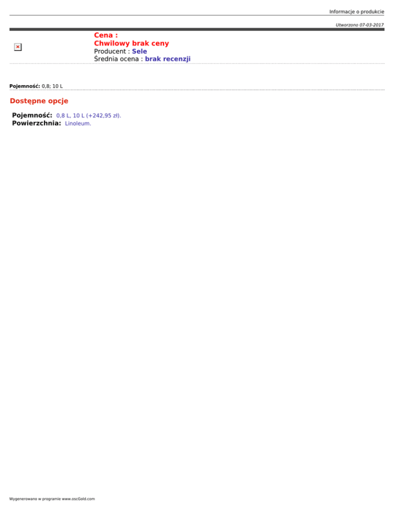 Informacje o produkcie Utworzono 07-03-2017 Cena : Chwilowy brak ceny Producent : Sele Średnia ocena : brak recenzji Pojemność: 0,8; 10 L Dostępne opcje Pojemność: 0,8 L, 10 L (+242,95 zł). Powierzchnia: Linoleum. Wygenerowano w programie www.oscGold.com