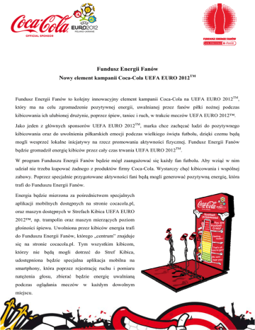 Fundusz Energii Fanów Nowy element kampanii Coca-Cola UEFA EURO 2012TM Fundusz Energii Fanów to kolejny innowacyjny element kampanii Coca-Cola na UEFA EURO 2012TM, który ma na celu zgromadzenie pozytywnej energii, uwalnianej przez fanów piłki nożnej podczas kibicowania ich ulubionej drużynie, poprzez śpiew, taniec i ruch, w trakcie meczów UEFA EURO 2012™. Jako jeden z głównych sponsorów UEFA EURO 2012TM, marka chce zachęcać ludzi do pozytywnego kibicowania oraz do uwolnienia piłkarskich emocji podczas wielkiego święta futbolu, dzięki czemu będą mogli wesprzeć lokalne inicjatywy na rzecz promowania aktywności fizycznej. Fundusz Energii Fanów będzie gromadził energię kibiców przez cały czas trwania UEFA EURO 2012TM. W program Funduszu Energii Fanów będzie mógł zaangażować się każdy fan futbolu. Aby wziąć w nim udział nie trzeba kupować żadnego z produktów firmy Coca-Cola. Wystarczy chęć kibicowania i wspólnej zabawy. Poprzez specjalnie przygotowane aktywności fani będą mogli generować pozytywną energię, która trafi do Funduszu Energii Fanów. Energia będzie mierzona za pośrednictwem specjalnych aplikacji mobilnych dostępnych na stronie cocacola.pl, oraz maszyn dostępnych w Strefach Kibica UEFA EURO 2012™, np. trampolin oraz maszyn mierzących poziom głośności śpiewu. Uwolniona przez kibiców energia trafi do Funduszu Energii Fanów, którego „centrum” znajduje się na stronie cocacola.pl. Tym wszystkim kibicom, którzy nie będą mogli dotrzeć do Stref Kibica, udostępniona będzie specjalna aplikacja mobilna na smartphony, która poprzez rejestrację ruchu i pomiaru natężenia głosu, zbierać będzie energię uwalnianą podczas oglądania meczów w każdym dowolnym miejscu. Po zakończeniu Mistrzostw zgromadzona energia zostanie zamieniona na wsparcie finansowe dla programu Lider-Animator, skierowanego do lokalnych animatorów sportu, na co dzień promujących aktywność fizyczną w swoich społecznościach. Program Lider-Animator skierowany jest do lokalnych animatorów, organizujących różnego rodzaju zajęcia rekreacyjne, programy szkolne i imprezy sportowe oparte na aktywności fizycznej. Głównymi celami programu są: Promowanie aktywności fizycznej, jako najlepszego sposobu kształtowania zdrowia i spędzania wolnego czasu. Wyszukiwanie, propagowanie i finansowe wsparcie projektów propagujących aktywność fizyczną nakierowaną na kształtowanie i utrzymanie zdrowia. Stworzenie bazy dobrych praktyk w zakresie projektów aktywności fizycznej. Aktywizowanie i zwiększenie efektywności działań liderów aktywności fizycznej. Promowanie na forum ogólnopolskim wyróżniających się liderów aktywności fizycznej. Inspirowanie do opracowywania i realizowania projektów dostosowanych do potrzeb środowiskowych i tradycji lokalnych Najciekawsze projekty zostaną uhonorowane grantami pieniężnymi na realizacje nowych inicjatyw, rozszerzenie lub kontynuowanie działalności związanej z promocją sportu i szeroko pojętej aktywności fizycznej. Wysokość grantów będzie zależna od środków finansowych pozyskanych w ramach aktywacji Coca-Cola Fundusz Energii Fanów. Partnerem programu Lider-Animator jest Szkolny Związek Sportowy, a jego patronem Ministerstwo Sportu i Turystyki. Partnerami mediowymi projektu są: Gazeta Wyborcza oraz portale sport.pl i gazeta.pl.