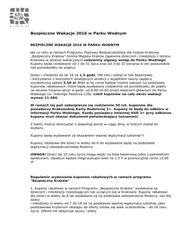 Bezpieczne Wakacje 2016 w Parku Wodnym BEZPIECZNE WAKACJE 2016 W PARKU WODNYM Jak co roku w ramach Programu Poprawy Bezpieczeństwa dla miasta Krakowa „Bezpieczny Kraków” Gmina Miejska Kraków zapewnia dzieciom i młodzieży z terenu Krakowa w okresie wakacyjnym codzienny ulgowy wstęp do Parku Wodnego. Kupony będą rozdawane od 1 do 31 lipca oraz od 3 do 31 sierpnia w dni powszednie (od poniedziałku do piątku). Dzieci i młodzież do lat 16 za 1,5 godz. (90 min.) pobyt w hali basenowej i korzystanie z wszystkich dostępnych atrakcji z wyjątkiem sauny zapłacą symboliczną opłatę 5,50 zł. Bilet w tej cenie będzie można zakupić na podstawie kuponów rabatowych, które będą wydawane codziennie od poniedziałku do piątku (w okresie trwania akcji) w godz. od 8.00-10.00 przed wejściem głównym do Parku Wodnego (ul. Dobrego Pasterza 126). Limit kuponów na cały okres wakacji wynosi 11 484. W ramach tej puli zabezpiecza się codziennie 50 szt. kuponów dla posiadaczy Krakowskiej Karty Rodzinnej 3+. Kupony te będą do odbioru w Informacji Parku Wodnego. Każdy posiadacz imiennej KKR 3+ przy odbiorze kuponu musi okazać dokument potwierdzający tożsamość. Z biletu można skorzystać o dowolnej porze w ciągu dnia, w którym został on wydany. Kupony będą wydawane za okazaniem ważnej legitymacji szkolnej!!! Kupony rabatowe dla dzieci w wieku do 6 lat wydawane będą na podstawie legitymacji ubezpieczeniowej Rodzica. UWAGA! Dzieci do 10 roku życia mogą wejść na halę basenową tylko z pełnoletnim opiekunem. Opiekun będzie mógł wykupić bilet na 1,5 h w promocyjnej cenie 13,00 zł. Regulamin wydawania kuponów rabatowych w ramach programu "Bezpieczny Kraków" 1. Kupony rabatowe w ramach Programu „Bezpieczny Kraków” wydawane są dzieciom i młodzieży mieszkającym lub uczącym się w Krakowie. Kupony rabatowe dla dzieci w wieku do 6 lat wydawane są na podstawie oświadczenia Rodzica, zaś dla dzieci i młodzieży w wieku od 7 do 16 lat na podstawie ważnej legitymacji szkolnej. Jako podstawowe kryterium dostępu do oferty ustala się wiek uczestników – do 16 roku życia. Oferta nie obejmuje sauny i plaży. 2. Dzienny limit wydawanych kuponów w okresie ferii zimowych to 650 szt oraz wakacji 261 szt . 3. W ramach tej puli zabezpiecza się codziennie 50 szt. kuponów dla posiadaczy Krakowskiej Karty Rodzinnej 3+. Kupony te będą do odbioru w Informacji Parku Wodnego. Każdy posiadacz imiennej KKR 3+ przy odbiorze kuponu musi okazać dokument potwierdzający tożsamość. 4. Odbiór kuponów rabatowych odbywa się na terenie Parku Wodnego w godzinach 8.00 – 10.00 od poniedziałku do piątku. 5. Kupon rabatowy jest ważny jedynie w dniu, w którym został wydany. 6. Osoba okazująca aktualną legitymację szkolną może otrzymać wyłącznie 1 kupon. 7. Rodzic okazujący legitymacje szkolne swoich dzieci lub legitymację ubezpieczeniową może otrzymać maksymalnie 3 kupony (wyjątkiem są posiadacze Krakowskiej Karty Rodzinnej 3+). 8. W sytuacjach, kiedy w punkcie wydawania kuponów pojawi się: a) osoba, która ukończyła 16 r.ż., b) osoba posiadająca legitymację bez aktualnej pieczątki c) osoba legitymująca się kartą rowerową, dowodem osobistym lub paszportem osoby wymienione w pkt. a) i b) proszone będą na koniec kolejki z informacją, iż w sytuacji kiedy dzienny limit wejść nie zostanie wykorzystany otrzymają kupon. W przypadku osób legitymujących się kartą rowerową lub paszportem, pkt. c), przekazany zostanie komunikat, iż osoby te muszą dowieźć legitymacje szkolne, gdyż jedynie pod takim warunkiem mogą zostać wpuszczone przez kasy biletowe. 9. Pracownicy kas biletowych będą weryfikować legitymacje podczas sprzedaży biletów. Zapraszamy! Powered by TCPDF (www.tcpdf.org)