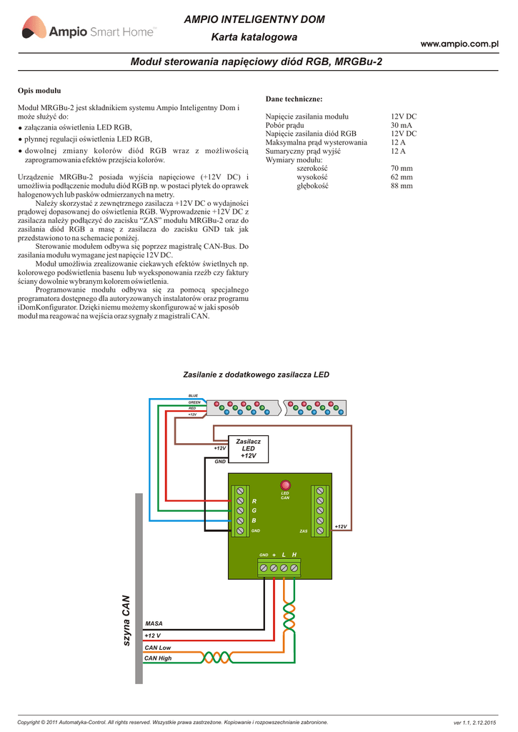 AMPIO INTELIGENTNY DOM Karta katalogowa www.ampio.com.pl Moduł sterowania napięciowy diód RGB, MRGBu-2 Opis modułu Dane techniczne: Moduł MRGBu-2 jest składnikiem systemu Ampio Inteligentny Dom i może służyć do: ź załączania oświetlenia LED RGB, ź płynnej regulacji oświetlenia LED RGB, ź dowolnej zmiany kolorów diód RGB wraz z możliwością zaprogramowania efektów przejścia kolorów. Napięcie zasilania modułu Pobór prądu Napięcie zasilania diód RGB Maksymalna prąd wysterowania Sumaryczny prąd wyjść Wymiary modułu: szerokość wysokość głębokość Urządzenie MRGBu-2 posiada wyjścia napięciowe (+12V DC) i umożliwia podłączenie modułu diód RGB np. w postaci płytek do oprawek halogenowych lub pasków odmierzanych na metry. Należy skorzystać z zewnętrznego zasilacza +12V DC o wydajności prądowej dopasowanej do oświetlenia RGB. Wyprowadzenie +12V DC z zasilacza należy podłączyć do zacisku “ZAS” modułu MRGBu-2 oraz do zasilania diód RGB a masę z zasilacza do zacisku GND tak jak przedstawiono to na schemacie poniżej. Sterowanie modułem odbywa się poprzez magistralę CAN-Bus. Do zasilania modułu wymagane jest napięcie 12V DC. Moduł umożliwia zrealizowanie ciekawych efektów świetlnych np. kolorowego podświetlenia basenu lub wyeksponowania rzeźb czy faktury ściany dowolnie wybranym kolorem oświetlenia. Programowanie modułu odbywa się za pomocą specjalnego programatora dostępnego dla autoryzowanych instalatorów oraz programu iDomKonfigurator. Dzięki niemu możemy skonfigurować w jaki sposób moduł ma reagować na wejścia oraz sygnały z magistrali CAN. 12V DC 30 mA 12V DC 12 A 12 A 70 mm 62 mm 88 mm Zasilanie z dodatkowego zasilacza LED BLUE GREEN RED +12V +12V Zasilacz LED +12V GND LED CAN R G B +12V GND szyna CAN GND ZAS + L H MASA +12 V CAN Low CAN High Copyright © 2011 Automatyka-Control. All rights reserved. Wszystkie prawa zastrzeżone. Kopiowanie i rozpowszechnianie zabronione. ver 1.1, 2.12.2015