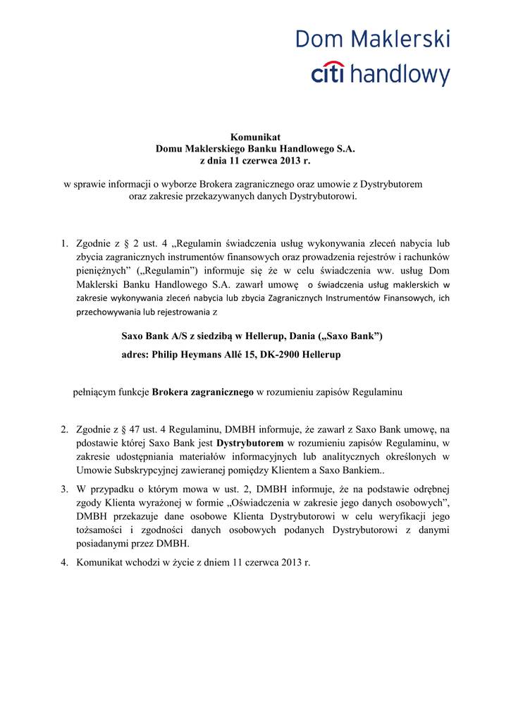 Komunikat Domu Maklerskiego Banku Handlowego S.A. z dnia 11 czerwca 2013 r. w sprawie informacji o wyborze Brokera zagranicznego oraz umowie z Dystrybutorem oraz zakresie przekazywanych danych Dystrybutorowi. 1. Zgodnie z § 2 ust. 4 „Regulamin świadczenia usług wykonywania zleceń nabycia lub zbycia zagranicznych instrumentów finansowych oraz prowadzenia rejestrów i rachunków pieniężnych” („Regulamin”) informuje się że w celu świadczenia ww. usług Dom Maklerski Banku Handlowego S.A. zawarł umowę o świadczenia usług maklerskich w zakresie wykonywania zleceń nabycia lub zbycia Zagranicznych Instrumentów Finansowych, ich przechowywania lub rejestrowania z Saxo Bank A/S z siedzibą w Hellerup, Dania („Saxo Bank”) adres: Philip Heymans Allé 15, DK-2900 Hellerup pełniącym funkcje Brokera zagranicznego w rozumieniu zapisów Regulaminu 2. Zgodnie z § 47 ust. 4 Regulaminu, DMBH informuje, że zawarł z Saxo Bank umowę, na pdostawie której Saxo Bank jest Dystrybutorem w rozumieniu zapisów Regulaminu, w zakresie udostępniania materiałów informacyjnych lub analitycznych określonych w Umowie Subskrypcyjnej zawieranej pomiędzy Klientem a Saxo Bankiem.. 3. W przypadku o którym mowa w ust. 2, DMBH informuje, że na podstawie odrębnej zgody Klienta wyrażonej w formie „Oświadczenia w zakresie jego danych osobowych”, DMBH przekazuje dane osobowe Klienta Dystrybutorowi w celu weryfikacji jego tożsamości i zgodności danych osobowych podanych Dystrybutorowi z danymi posiadanymi przez DMBH. 4. Komunikat wchodzi w życie z dniem 11 czerwca 2013 r.