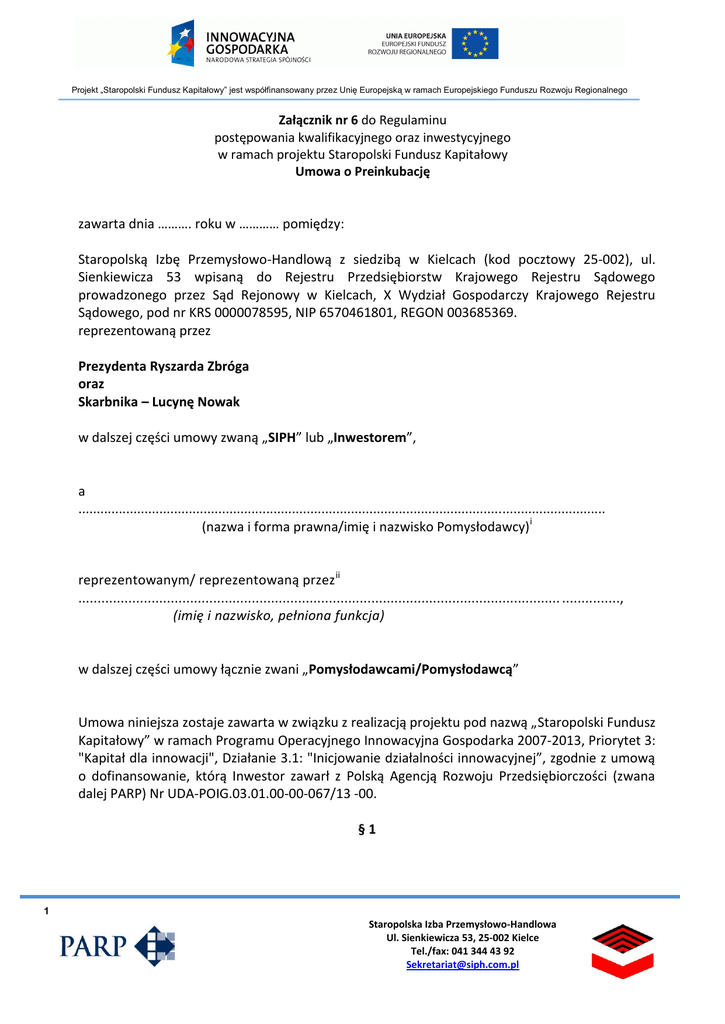 Projekt „Staropolski Fundusz Kapitałowy” jest współfinansowany przez Unię Europejską w ramach Europejskiego Funduszu Rozwoju Regionalnego Załącznik nr 6 do Regulaminu postępowania kwalifikacyjnego oraz inwestycyjnego w ramach projektu Staropolski Fundusz Kapitałowy Umowa o Preinkubację zawarta dnia ………. roku w ………… pomiędzy: Staropolską Izbę Przemysłowo-Handlową z siedzibą w Kielcach (kod pocztowy 25-002), ul. Sienkiewicza 53 wpisaną do Rejestru Przedsiębiorstw Krajowego Rejestru Sądowego prowadzonego przez Sąd Rejonowy w Kielcach, X Wydział Gospodarczy Krajowego Rejestru Sądowego, pod nr KRS 0000078595, NIP 6570461801, REGON 003685369. reprezentowaną przez Prezydenta Ryszarda Zbróga oraz Skarbnika – Lucynę Nowak w dalszej części umowy zwaną „SIPH” lub „Inwestorem”, a ............................................................................................................................................... (nazwa i forma prawna/imię i nazwisko Pomysłodawcy)i reprezentowanym/ reprezentowaną przez ii ............................................................................................................................. ..............., (imię i nazwisko, pełniona funkcja) w dalszej części umowy łącznie zwani „Pomysłodawcami/Pomysłodawcą” Umowa niniejsza zostaje zawarta w związku z realizacją projektu pod nazwą „Staropolski Fundusz Kapitałowy” w ramach Programu Operacyjnego Innowacyjna Gospodarka 2007-2013, Priorytet 3: "Kapitał dla innowacji", Działanie 3.1: "Inicjowanie działalności innowacyjnej”, zgodnie z umową o dofinansowanie, którą Inwestor zawarł z Polską Agencją Rozwoju Przedsiębiorczości (zwana dalej PARP) Nr UDA-POIG.03.01.00-00-067/13 -00. §1 1 Staropolska Izba Przemysłowo-Handlowa Ul. Sienkiewicza 53, 25-002 Kielce Tel./fax: 041 344 43 92 [email protected] Projekt „Staropolski Fundusz Kapitałowy” jest współfinansowany przez Unię Europejską w ramach Europejskiego Funduszu Rozwoju Regionalnego 1 Pomysłodawca, wyrażając zainteresowanie nawiązaniem współpracy i otrzymaniem wsparcia w ramach projektu: „Staropolski Fundusz Kapitałowy”, złożył do SIPH formularz zgłoszeniowy nr …………. z dnia …………, zawierający opis pomysłu innowacyjnego w postaci papierowej i elektronicznej. 2 Kopia złożonego formularza wraz ze szczegółowym opisem innowacyjnego pomysłu stanowią Załącznik nr 1 do niniejszej umowy. 3 Projekt ………………..zgłoszony przez Pomysłodawcę do SIPH zgodnie z pkt. 1 powyżej, polegający na ………………, został zakwalifikowany przez SIPH do etapu preinkubacji, którego celem jest weryfikacja rynkowych szans projektu i zasadności założenia nowej spółki kapitałowej z udziałem SIPH. 4 Przeprowadzenie badań innowacyjnego rozwiązania może być realizowane m.in. poprzez: ● Wsparcie doradcze pomysłodawców przy opracowaniu biznes planu wraz z analizą rynku i potencjału rynkowego ● Usługi doradcze w zakresie prac badawczo – rozwojowych ● Analiza opłacalności wejścia kapitałowego oraz inne czynności uzgodnione pomiędzy Stronami 5 Wydatki ponoszone na etapie preinkubacji pokrywane są przez SIPH i następnie rozliczane zgodnie z zasadami projektu. Pomysłodawca zostanie poinformowany o rozpoczęciu tzw. drugiego etapu preinkubacji, w którym ponoszone będą wydatki w ramach realizacji projektu zgłoszonego przez Pomysłodawcę. 6 Szczegółowe kwestie związane z warunkami i procedurą udzielenia wsparcia przez SIPH zawiera Regulamin projektu pt.: „REGULAMIN postępowania kwalifikacyjnego oraz inwestycyjnego w ramach projektu Staropolski Fundusz Kapitałowy”, którego treść stanowi załącznik nr 2 do niniejszej umowy. 7 Pomysłodawca zobowiązuje się wobec SIPH do pełnej współpracy przy opracowywaniu dokumentów oraz prowadzeniu prac w zakresie wykonania niniejszej umowy. 8 Podczas drugiego etapu preinkubacji projektu „Pomysłodawcy” zostanie stworzony biznesplan projektu inwestycyjnego „Pomysłodawcy” oraz zostanie uzgodnione postępowanie w celu ustalenia zasad zawarcia „Umowy inwestycyjnej” oraz „Umowy spółki” . 9 Za stworzenie biznesplanu odpowiada „Pomysłodawca”, przy czym SIPH udzieli wszelkiej możliwej pomocy, by taki dokument powstał. 10 Biznesplan musi zawierać wszystkie elementy wskazane przez SIPH. 11 Pomysłodawca wykona Biznesplan w terminie nie dłuższym niż do dnia …………...(3 miesięce od dnia podpisania umowy). 2 Staropolska Izba Przemysłowo-Handlowa Ul. Sienkiewicza 53, 25-002 Kielce Tel./fax: 041 344 43 92 [email protected] Projekt „Staropolski Fundusz Kapitałowy” jest współfinansowany przez Unię Europejską w ramach Europejskiego Funduszu Rozwoju Regionalnego §2 1 Pomysłodawca zobowiązuje się, że w przypadku pozytywnej oceny pomysłu przez SIPH i podjęciu decyzji o zakwalifikowaniu pomysłu do etapu inwestycyjnego, przystąpi do negocjacji i po ich pozytywnym zakończeniu w zakresie uzgodnienia pomiędzy stronami warunków współpracy, zawrze umowę inwestycyjną z SIPH na warunkach ustalonych w trakcie negocjacji, wynikających ze sprawozdania (raportu) z zakończenia etapu preinkubacji, zaakceptowanych przez Instytucję Wdrażającą (Polska Agencja Rozwoju Przedsiębiorczości). 2 Strony ustalają następujące ogólne warunki utworzenia lub wejścia kapitałowego do spółki, w razie pozytywnego zakończenia etapu preinkubacji: a) utworzona spółka będzie miała formę spółki z ograniczoną odpowiedzialnością lub spółki akcyjnej b) SIPH dokona ewentualnego wejścia kapitałowego poprzez objęcie udziałów (akcji) spółki, c) SIPH otrzyma prawo do delegowania swoich przedstawicieli do organów spółki w postaci zarządu i rady nadzorczej. „Umowa Inwestycyjna” określi wszystkie obowiązki i prawa udziałowców Spółki w tym w szczególności, ale nie wyłącznie: 1 a Zobowiązania SIPH do objęcia 