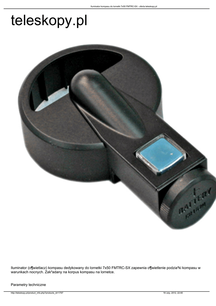 Iluminator kompasu do lornetki 7x50 FMTRC-SX - oferta teleskopy.pl teleskopy.pl Iluminator (o¶wietlacz) kompasu dedykowany do lornetki 7x50 FMTRC-SX zapewnia o¶wietlenie podzia³ki kompasu w warunkach nocnych. Zak³adany na korpus kompasu na lornetce. Parametry techniczne http://teleskopy.pl/product_info.php?products_id=1797 19 July, 2012, 22:40 Iluminator kompasu do lornetki 7x50 FMTRC-SX - oferta teleskopy.pl • ¬ród³o ¶wiat³a: czerwona dioda LED • Zasilanie: bateria CR1620 (3V) (w komplecie) http://teleskopy.pl/product_info.php?products_id=1797 19 July, 2012, 22:40