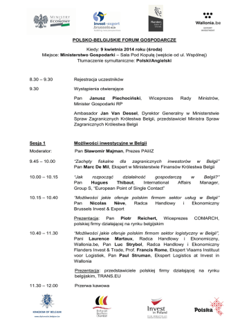 POLSKO-BELGIJSKIE FORUM GOSPODARCZE Kiedy: 9 kwietnia 2014 roku (środa) Miejsce: Ministerstwo Gospodarki – Sala Pod Kopułą (wejście od ul. Wspólnej) Tłumaczenie symultaniczne: Polski/Angielski 8.30 – 9.30 Rejestracja uczestników 9.30 Wystąpienia otwierające Pan Janusz Piechociński, Minister Gospodarki RP Wiceprezes Rady Ministrów, Ambasador Jan Van Dessel, Dyrektor Generalny w Ministerstwie Spraw Zagranicznych Królestwa Belgii, przedstawiciel Ministra Spraw Zagranicznych Królestwa Belgii Sesja 1 Możliwości inwestycyjne w Belgii Moderator: Pan Sławomir Majman, Prezes PAIiIZ 9.45 – 10.00 “Zachęty fiskalne dla zagranicznych inwestorów w Belgii” Pan Marc De Mil, Ekspert w Ministerstwie Finansów Królestwa Belgii 10.00 – 10.15 “Jak rozpocząć działalność gospodarczą w Pan Hugues Thibaut, International Affairs Group S, “European Point of Single Contact” 10.15 – 10.40 “Możliwości jakie oferuje polskim firmom sektor usług w Belgii” Pan Nicolas Nève, Radca Handlowy i Ekonomiczny Brussels Invest & Export Prezentacja: Pan Piotr Reichert, Wiceprezes polskiej firmy działającej na rynku belgijskim 10.40 – 11.30 Belgii?” Manager, COMARCH, “Możliwości jakie oferuje polskim firmom sektor logistyczny w Belgii”, Pani Laurence Martaux, Radca Handlowy i Ekonomiczny, Wallonia.be, Pan Luc Strybol, Radca Handlowy i Ekonomiczny Flanders Invest & Trade, Prof. Francis Rome, Ekspert Vlaams Instituut voor Logistiek, Pan Paul Struman, Ekspert Logistics at Invest in Wallonia Prezentacja: przedstawiciele polskiej firmy działającej na rynku belgijskim, TRANS.EU 11.30 – 12.00 Przerwa kawowa Sesja 2 Możliwości inwestycyjne w Polsce Moderator: Pan Bruno Lambrecht, Prezes Belgijskiej Izby Gospodarczej w Polsce 12.00 – 12.15 “Klimat inwestycyjny w Polsce”, Pani Iwona Chojnowska-Haponik, Dyrektor Departamentu Inwestycji Zagranicznych w PAIiIZ 12.15 – 12.30 „Współpraca polsko-belgijska. Promocja polskich możliwości gospodarczych”, Pan Krzysztof Turowski, Radca-Kierownik Wydziału Promocji Handlu i Inwestycji przy Ambasadzie RP w Brukseli 12.30 – 12.45 Prezentacja: Pan Jean-Charles Wibo, Prezes Vlassenroot Polska, belgijskiej firmy działającej na polskim rynku 12.45 – 13.00 Pytania oraz podsumowanie sesji przez moderatora 13.00 – 14.30 Buffet lunch oraz spotkania biznesowe w obecności Wiceprezesa Rady Ministrów RP, Ministra Gospodarki Pana Janusza Piechocińskiego