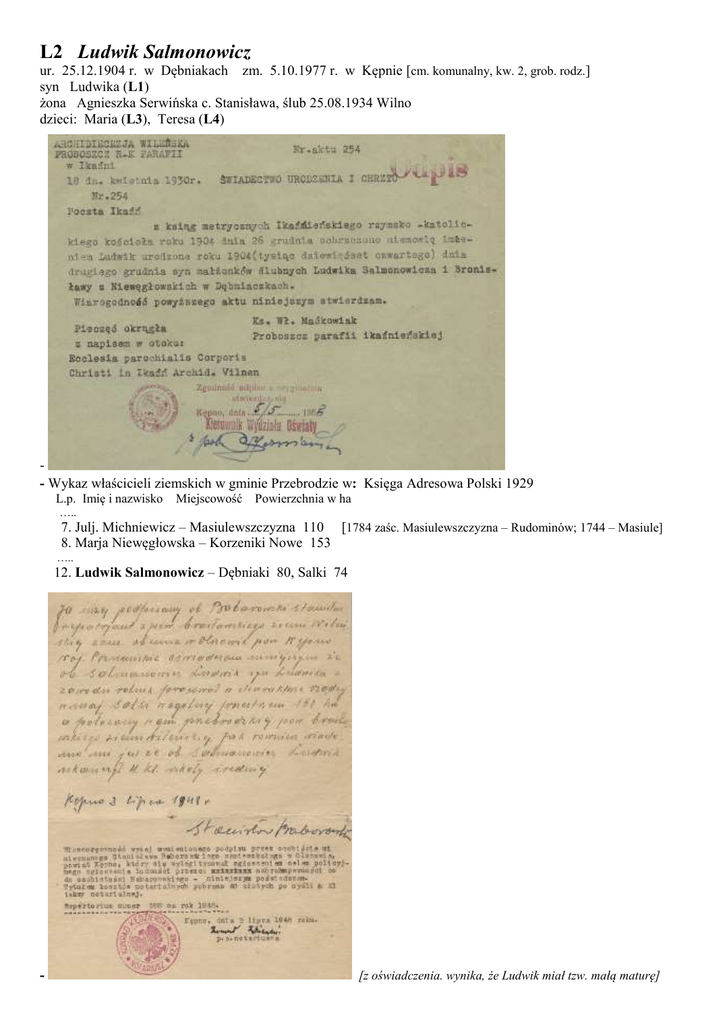 L2 Ludwik Salmonowicz ur. 25.12.1904 r. w Dębniakach zm. 5.10.1977 r. w Kępnie [cm. komunalny, kw. 2, grob. rodz.] syn Ludwika (L1) żona Agnieszka Serwińska c. Stanisława, ślub 25.08.1934 Wilno dzieci: Maria (L3), Teresa (L4) - Wykaz właścicieli ziemskich w gminie Przebrodzie w: Księga Adresowa Polski 1929 L.p. Imię i nazwisko Miejscowość Powierzchnia w ha ….. 7. Julj. Michniewicz – Masiulewszczyzna 110 [1784 zaśc. Masiulewszczyzna – Rudominów; 1744 – Masiule] 8. Marja Niewęgłowska – Korzeniki Nowe 153 ….. 12. Ludwik Salmonowicz – Dębniaki 80, Salki 74 - [z oświadczenia. wynika, że Ludwik miał tzw. małą maturę] - Сальмонович Людвик Людвикович. Родился в 1904 г., д. Дубники Браславского р-на Витебской обл.; поляк; образование среднее; крестьянин, единоличное хоз-во. Проживал: Витебская обл., Браславский р-н, д. Масюковщина. Арестован 18 августа 1940. Приговорен: ОСО 9 января 1941 г., обв.: 72, 74 УК БССР - А/с агитация. Приговор: 8 лет ИТЛ, отбыв.: Ухтоижемлаг, освоб. 12.1941. Реабилитирован 24 ноября 1989 г. Прокуратура Витебской обл. (Источник: Белорусский "Мемориал") [Ухтоижемлаг (рабочий поселок Ухта Коми АССР)] Ludwik Salmonowicz s. Ludwika, ur. w 1904 r. we wsi Dubniki*), powiat brasławski, woj. witebskie; narodowości polskiej; wykształcenie średnie; włościanin – właściciel gospodarstwa. Mieszkał we wsi Masiukowszczyna.**) Aresztowany 18 sierpnia 1940 r. Sądzony przez Sąd Okręgowy 9 stycznia 1941 r., oskarżony z art. 72 i 74 Kodeksu Karnego Białoruskiej SRR – agitacja antysocjalistyczna. Skazany na 8 lat łagru w Uchta (Komi ASRR). Zwolniony w grudniu 1941 r. Rehabilitowany 24.11.1989 r. przez prokuraturę w Witebsku. (Źródło: Białoruski „Memoriał”) *) ros. Дубники (Dubniki) = Dębniaki (folwark, gm. Przebrodzie; k. folw. Salki) **) w. być: Masiulewszczyzna (folwark, gm. Przebrodzie; k. folw. Salki) Zwolniony z łagru w Uchcie – po podpisaniu układu Sikorski-Majski. Dostał się do tworzonej w Sowietach armii polskiej gen. Andersa w marcu 1942 r. Służył w 5 Wileńskim Pułku Artylerii Lekkiej (5pal) 5 Wileński Pułk Artylerii Lekkiej (5 pal) wchodził w skład 5 Kresowej Dywizji Piechoty (5 KDP), która została sformowana w marcu 1943. Na przełomie sierpnia i września 1943 nastąpiło przegrupowanie dywizji z Kirkuku do Palestyny. Dywizję rozmieszczono 20 km na południe od Gazy, w rejonie Mughazi-Nuseirat. Dywizja zaczęła otrzymywać nowy sprzęt i uzbrojenie. W połowie stycznia 1944 dywizja została przesunięta do Egiptu (obóz w Qassasin). Tu dywizja otrzymała sprzęt i wyposażenie ściśle według etatów wojennych..Na początku 1944 przygotowano dywizję do transportu na Półwysep Apeniński, po czym zaokrętowano w Port Said. Na ziemi włoskiej wylądowała 21 lutego w Taranto.Tam weszła w skład 2 Korpusu Polskiego. Walczyła pod Sangro i Volturno. Poprzez Linię Gustawa (bitwa pod Monte Cassino) przeszła do walk nad Adriatykiem. Potem walczyła w rejonie Loreto, w Apeninach Emiliańskich oraz toczyła ciężkie walki nad Senio i pod Bolonią zakończone jej zdobyciem 21 IV 1945. Po zakończeniu działań wojennych pozostawała w składzie wojsk okupacyjnych we Włoszech. W czerwcu 1946 została przewieziona do Anglii, a od 7 września rozpoczęto zapisy do Polskiego Korpusu Przysposobienia i Rozmieszczenia. Żołnierze – członkowie Korpusu mogli: w dowolnym terminie wrócić do Polski, w dowolnym terminie emigrować do innych krajów, zaciągnąć się do armii brytyjskiej lub podjąć pracę zawodową w Wielkiej Brytanii. Z 2 Korpusem Polskim odbył m.in. całą kampanię włoską, w tym brał udział w bitwie pod Monte Cassino (w czasie której został ranny i doznał częściowej utraty słuchu) Oświadczenie pana Romana Żaby, zam. w Szczecinku, ul. Jeziorna 10 Po Kampanii Włoskiej służył jeszcze na Bliskim Wschodzie, skąd (przez Włochy) w 1946 r. przybył do Wielkiej Brytanii, gdzie został członkiem Korpusu Przysposobienia i Rozmieszczenia, w którym służył do 23.02.1948 r. Po wyrażeniu chęci powrotu do Polski (nawiązał kontakt z rodziną) – trafił do Pennylands Camp w Cummnock (Szkocja). Pennylands Camp, Cummnock, Ayrshire, Szkocja – w l. 1944-45 obóz dla jeńców niemieckich i włoskich. Po zakończeniu wojny użyty jako obóz repatriacyjny dla żołnierzy polskich, którzy wyrazili chęć powrotu do Polski. Do Polski wrócił w lutym 1948 r. i zamieszkał we wsi Lubczyna – w ówczesnym powiecie kępińskim – gdzie mieszkała („repatriowana” w XII 1945 r. z Dębniaków) jego żona Agnieszka z córkami. Agnieszka Salmonowiczowa była w Lubczynie kierowniczką szkoły podstawowej, w której uczyły się jej córki. Ludwik podjął pracę księgowego w PGR Lubczyna. Ludwik Salmonowicz z żoną i córkami (Lubczyna 1949 r.) W początku lat 50-tych, na podstawie wydanego przez Sowietów zaświadczenia [tzw. справка], Agnieszka wystąpiła o odszkodowanie za pozostawiony w ZSRR majątek, w wyniku czego otrzymała mały domek w Kępnie, Archiwum Państwowe w Poznaniu. Seria: Rolnictwo i Leśnictwo. 53/1071/O/1422 Orzeczenia WKZ [Wojewódzkiej Komisji Ziemskiej] w Poznaniu w sprawie przydziału gospodarstw. Salmonowicz, w pow. Kępno, str. 155 Kępno, m. pow. w płd. części woj. wielkopolskiego (ok. 80 km na płd od Kalisza; ok. 100 km na wsch. od Wrocławia) dokąd rodzina przeprowadziła się w 1953 r. - Kępno, ok. 1955 r. Stoją od lewej: Maria (L3, córka Ludwika), Wanda (siostra Ludwika), Ludwik (L2), NN; Siedzą od lewej: Agnieszka (żona Ludwika), Teresa (siostra Ludwika) Ludwik po