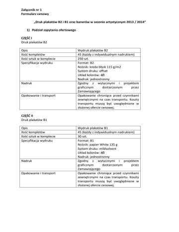 Załącznik nr 1 Formularz cenowy „Druk plakatów B2 i B1 oraz banerów w sezonie artystycznym 2013 / 2014” 1) Podział zapytania ofertowego CZĘŚĆ I Druk plakatów B2 Opis Ilość kompletów Ilość sztuk w komplecie Specyfikacja wydruku Nadruk Opakowanie i transport Wydruk plakatów B2 45 (każdy z indywidualnym nadrukiem) 250 szt. Format: B2 Nośnik: kreda błysk 115 g/m2 System druku: offset Układ kolorów: 4/0 Nadruk: jednostronny Zgodny z wytycznymi i projektem graficznym dostarczonym przez Zamawiającego Opakowanie chroniące przed czynnikami zewnętrznymi na czas transportu. Koszty transportu muszą być uwzględnione w złożonej ofercie cenowej. CZĘŚĆ II Druk plakatów B1 Opis Ilość kompletów Ilość sztuk w komplecie Specyfikacja wydruku Nadruk Opakowanie i transport Wydruk plakatów B1 45 (każdy z indywidualnym nadrukiem) 30 szt. Format: B1 Nośnik: papier White 135 g System druku: mildsolvent Układ kolorów: 4/0 Nadruk: jednostronny Zgodny z wytycznymi i projektem graficznym dostarczonym przez Zamawiającego Opakowanie chroniące przed czynnikami zewnętrznymi na czas transportu. Koszty transportu muszą być uwzględnione w złożonej ofercie cenowej. CZĘŚĆ III Druk banerów Opis Ilość sztuk Specyfikacja wydruku Nadruk, oczkowanie i zgrzewanie Opakowanie i transport Wydruk banerów 25 (każdy z indywidualnym nadrukiem) Format: 8200 mm x 900 mm Nośnik: frontlit System druku: mildsolvent Układ kolorów: 4/0 Nadruk: jednostronny Zgodnie z wytycznymi i projektem graficznym dostarczonym przez Zamawiającego określanym indywidualnie do każdego zamówienia. Opakowanie chroniące przed czynnikami zewnętrznymi na czas transportu. Koszty transportu muszą być uwzględnione w złożonej ofercie cenowej.