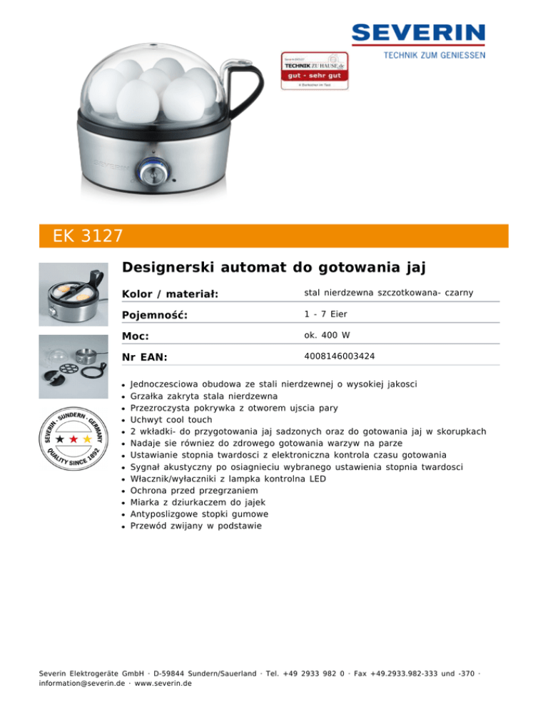 EK 3127 Designerski automat do gotowania jaj Kolor / materiał: stal nierdzewna szczotkowana- czarny Pojemność: 1 - 7 Eier Moc: ok. 400 W Nr EAN: 4008146003424 ● ● ● ● ● ● ● ● ● ● ● ● ● Jednoczesciowa obudowa ze stali nierdzewnej o wysokiej jakosci Grzałka zakryta stala nierdzewna Przezroczysta pokrywka z otworem ujscia pary Uchwyt cool touch 2 wkładki- do przygotowania jaj sadzonych oraz do gotowania jaj w skorupkach Nadaje sie równiez do zdrowego gotowania warzyw na parze Ustawianie stopnia twardosci z elektroniczna kontrola czasu gotowania Sygnał akustyczny po osiagnieciu wybranego ustawienia stopnia twardosci Włacznik/wyłaczniki z lampka kontrolna LED Ochrona przed przegrzaniem Miarka z dziurkaczem do jajek Antyposlizgowe stopki gumowe Przewód zwijany w podstawie Severin Elektrogeräte GmbH · D-59844 Sundern/Sauerland · Tel. +49 2933 982 0 · Fax +49.2933.982-333 und -370 · [email protected] · www.severin.de