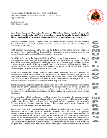 Sekretáriu Estadu Konselhu Ministrus no Porta-vòz Ofisiál Governu Timor-Leste Ágio Pereira 21 Abril 2010 Díli, Timor-Leste Sua Exa. Xanana Gusmão, Primeiru-Ministru Timor-Leste, hahú nia konsultas nasionais ho Povu kona-ba vizaun foun ida ba paíz, liuhusi Planu estratéjiku Dezenvolvimentu (PED) ba períodu 2011 to’o 2030 Primeiru-Ministru Xanana Gusmão hahú nia viajen bá iha distritus no sub-distritus Timor-Leste tomak laran, hodi hala’o konsultas nasionais kona-ba Planu Estratéjiku ba Dezenvolvimentu (PED). PED hanesan mapeamentu estratéjiku ida ba futuru, ne’ebé kobre períodu 2010 to’o 2030, ho objetivu atu lori Timor-Leste sai husi ekonomia ho baixus rendimentus ba paíz ho rendimentus médius altus, kleur liu ona, to’o tinan 2030. Estratéjia ne’e, bazeia ba iha nesesidade atu Timor-Leste hetan armonia ho rejiaun no bele utiliza nia rekursus hodi maksimiza ka hasa’e aas benefísius ba tempu naruk iha áreas infra-estruturas, edukasaun, saúde, empregu no evolusaun setór públiku no setór privadu. Kona-ba tesidu fíziku no kulturál Timor-Leste nian tetu didi’ak ona iha PED, ho hanoin atu forma no hametin identidade nasionál ba tempu naruk, ne’ebé bele hametin unidade no sai hanesan buat ne’ebé timór nian rasik. Planu ne’e estabelese vizaun kona-ba dezenvolve ekonomia ida ke moderna no diversifikada, ho infra-estruturas i ho kualidade di’ak, inklui estradas, bee, portus no telekomunikasoens. Agrikultura subsistênsia ka ne’ebé hodi hadau de’it moris, tenke troka ho agrikultura komersiál, atu bele aumenta rendimentus ba tempu naruk i ba komunidades tomak, no mós prodúz rasik hahán ba populasoens. Tranzisaun signifika katak tradisaun Timor-Leste ne’ebé ho ekonomia rurál, tenke muda tomak ona iha 2030. Urbanizasaun progresiva ho planu ne’ebé di’ak, sei halo be, mais-de metade populasaun, bele moris iha áreas urbanas ka iha sidade laran, ne’ebé ekonomia servisus sei fó rendimentus sustentáveis ho kresimentus ba longu prazu entre setores hotu-hotu. Setór petróleu, inklui produsaun petróleu no gás ho indústrias derivadas, hanesan petrokímikus, mak kaer papél fundamentál iha dezenvolvimentu. Indústria petróleu nian ne’ebé forte iha rai laran, sei harí baze industriál ne’ebé importante ba ekonomia. Servisus mak sei domina kona-ba empregu iha setores tomak laran, hanesan mós turizmu, komérsiu no administrasaun públika. Sekretáriu Estadu Ágio Pereira dehan “Sua Exelênsia Primeiru-Ministru Xanana Gusmão haka’as-an tebes hodi garante unidade nasionál no inkluzaun iha prosesu dezenvolvimentu nasionál. Metas ka buat ne’ebé hakarak atinji mak oinsá bele lori ita nian nasaun la’o tuir estrada ida ke lais liu no sustentável, tuir dalan dezenvolvimentu, utiliza ita nia rekursus umanus i naturais hodi hasai ita nia paíz husi moris-kiak no halo nasaun ne’e sai dezenvolvida. Timor-Leste moris ona iha períodu ne’ebé hakmatek tebes, i ho kresimentu ekonómiku, tanba ne’e mak to’o ona tempu atu ita rasik halo planu ba ita nia perkursu ka dalan ba ita nia futuru. Planu estratéjiku Dezenvolvimentu nian hanesan veíkulu ka meiu ida ne’ebé ita bele utiliza hodi atinji ita nia metas no aspirasoens ba aban-bain rua hanesan nasaun ida.” FIM Ba informasoens seluktán favór kontakta: Ágio Pereira +670 723 0011 Correio electrónico: [email protected] ou [email protected] Portal electrónico: www.timor-leste.gov.tl