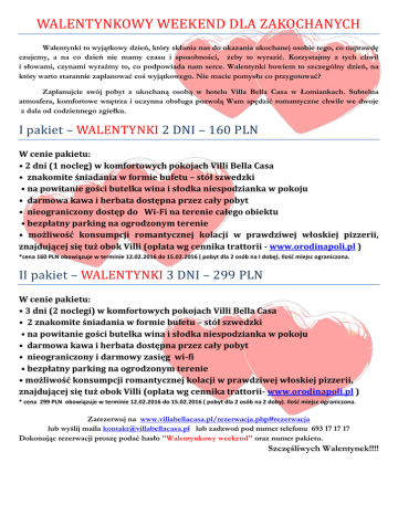 WALENTYNKOWY WEEKEND DLA ZAKOCHANYCH Walentynki to wyjątkowy dzień, który skłania nas do okazania ukochanej osobie tego, co naprawdę czujemy, a na co dzień nie mamy czasu i sposobności, żeby to wyrazić. Korzystajmy z tych chwil i słowami, czynami wyraźmy to, co podpowiada nam serce. Walentynki bowiem to szczególny dzień, na który warto starannie zaplanować coś wyjątkowego. Nie macie pomysłu co przygotować? Zaplanujcie swój pobyt z ukochaną osobą w hotelu Villa Bella Casa w Łomiankach. Subtelna atmosfera, komfortowe wnętrza i uczynna obsługa pozwolą Wam spędzić romantyczne chwile we dwoje z dala od codziennego zgiełku. I pakiet – WALENTYNKI 2 DNI – 160 PLN W cenie pakietu: • 2 dni (1 nocleg) w komfortowych pokojach Villi Bella Casa • znakomite śniadania w formie bufetu – stół szwedzki • na powitanie gości butelka wina i słodka niespodzianka w pokoju • darmowa kawa i herbata dostępna przez cały pobyt • nieograniczony dostęp do Wi-Fi na terenie całego obiektu • bezpłatny parking na ogrodzonym terenie • możliwość konsumpcji romantycznej kolacji w prawdziwej włoskiej pizzerii, znajdującej się tuż obok Villi (oplata wg cennika trattorii - www.orodinapoli.pl ) *cena 160 PLN obowiązuje w terminie 12.02.2016 do 15.02.2016 ( pobyt dla 2 osób na I dobę). Ilość miejsc ograniczona. II pakiet – WALENTYNKI 3 DNI – 299 PLN W cenie pakietu: • 3 dni (2 noclegi) w komfortowych pokojach Villi Bella Casa • 2 znakomite śniadania w formie bufetu – stół szwedzki • na powitanie gości butelka wina i słodka niespodzianka w pokoju • darmowa kawa i herbata dostępna przez cały pobyt • nieograniczony i darmowy zasięg wi-fi • bezpłatny parking na ogrodzonym terenie • możliwość konsumpcji romantycznej kolacji w prawdziwej włoskiej pizzerii, znajdującej się tuż obok Villi (oplata wg cennika trattorii- www.orodinapoli.pl ) * cena 299 PLN obowiązuje w terminie 12.02.2016 do 15.02.2016 ( pobyt dla 2 osób na 2 doby). Ilość miejsc ograniczona. Zarezerwuj na www.villabellacasa.pl/rezerwacja.php#rezerwacja lub wyślij maila [email protected] lub zadzwoń pod numer telefonu 693 17 17 17 Dokonując rezerwacji proszę podać hasło "Walentynkowy weekend" oraz numer pakietu. Szczęśliwych Walentynek!!!!