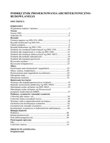 PODRĘCZNIK PROJEKTOWANIA ARCHITEKTONICZNOBUDOWLANEGO SPIS TREŚCI: PODSTAWY Wyjaśnienie znaków i skrótów........................................................1 Normy Normy DIN......................................................................................2 Jednostki SI.....................................................................................4 Rysunki Formaty papieru wg DIN 476, 4999................................................6 Rysunki techniczne wg DIN 824.....................................................7 Układ rysunków...............................................................................8 Rysunki budowlane wg DIN 1356..................................................9 Symbole na rysunkach budowlanych wg DIN 1356.....................10 Symbole dla zaopatrzenia w wodę wg DIN 1988.........................14 Symbole dla instalacji elektrycznych wg DIN 18015...................16 Symbole dla techniki zabezpieczeń...............................................19 Symbole dla instalacji gazowych..................................................20 Rysowanie ręcdzne........................................................................21 Rysowanie komputerowe..............................................................22 Miary Porównanie miar niemieckich i angielskich.................................23 Miary, ciężary, temperatura..........................................................24 Przetwarzanie miar angielskich na milimetry...............................25 Obciążenia stałe............................................................................26 Obciążenia ruchome.....................................................................32 Budowanie bez barier Wymiary dla niepełnosprawnych na wózkach...............................33 Budynki użyteczności publicznej wg DIN 18024..........................34 Mieszkania wolne od barier wg DIN 18025..................................35 Mieszkania wolne od barier wg Wzorcowych przepisów budowlanych (MBO)....................................................37 Podstawy wymiarów i stosunki wymiarów Człowiek jako miara i cel..............................................................38 Człowiek miarą wszystkich rzeczy................................................39 Wymiary ciała a zapotrzebowanie na miejsce...............................40 Geometryczna koordynacja wymiarów.........................................42 Geometryczne stosunki wymiarów...............................................43 Koordynacja wymiarowa w budownictwie nadziemnym.............46 Biologia budowli Podstawy......................................................................................48 Klimat pomieszczeń.....................................................................49 Pola elektromagnetyczne.............................................................50 Postrzeganie optyczne Oko...............................................................................................51 Człowiek a barwa.........................................................................53 PROCES PLANOWANIA Projektowanie Co to jest projektowanie?.............................................................54 Poziomy odniesienia....................................................................55 Arkusz pytań.................................................................................56 Budowanie zrównoważone Ogólnie, planowanie, budowanie.................................................58 Źródła oszczędności.....................................................................59 Facility managment (Zarządzanie udogodnieniami) Otoczenie.....................................................................................60 Metody..........................................................................................61 Budowanie w stanie istniejącym Zachować i zmieniać....................................................................62 Opieka nad zabytkami..................................................................63 Ochrona zabytków........................................................................64 Zapis stanu istniejącego...............................................................65 Zmiana użytkowania....................................................................66 Planowanie i kierowanie budową Publiczne prawo budowlane.........................................................68 Prywatne prawo budowlane, VOB, HOAI....................................69 Fazy świadczeń.............................................................................70 Wskaźniki użytkowania budowlanego.........................................75 Tereny oddzielające......................................................................76 Koszty budowy.............................................................................77 CZĘŚCI BUDYNKU Posadowienie Wykopy budowlane......................................................................78 Fundamenty...................................................................................81 Izolacje wodochronne, drenaż......................................................83 Remont.........................................................................................85 Ściany Mur z kamienia.............................................................................86 Mur z elementów mineralnych.....................................................87 Konstrukcje mieszane..................................................................90 Remont.........................................................................................91 Stropy Konstrukcje stropów.....................................................................92 Remont.........................................................................................93 Renowacja betonu........................................................................94 Podłogi......................