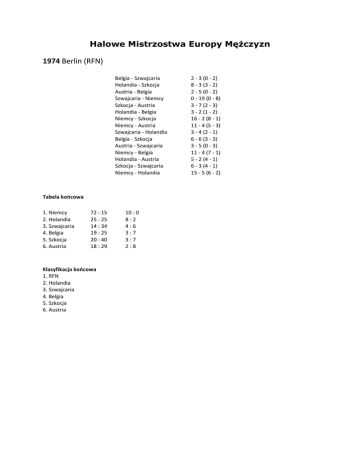Halowe Mistrzostwa Europy Mężczyzn 1974 Berlin (RFN) Belgia - Szwajcaria Holandia - Szkocja Austria - Belgia Szwajcaria - Niemcy Szkocja - Austria Holandia - Belgia Niemcy - Szkocja Niemcy - Austria Szwajcaria - Holandia Belgia - Szkocja Austria - Szwajcaria Niemcy - Belgia Holandia - Austria Szkocja - Szwajcaria Niemcy - Holandia Tabela końcowa 1. Niemcy 2. Holandia 3. Szwajcaria 4. Belgia 5. Szkocja 6. Austria 72 : 15 25 : 25 14 : 34 19 : 25 20 : 40 18 : 29 Klasyfikacja końcowa 1. RFN 2. Holandia 3. Szwajcaria 4. Belgia 5. Szkocja 6. Austria 10 : 0 8:2 4:6 3:7 3:7 2:8 2 - 3 (0 - 2) 8 - 3 (3 - 2) 2 - 5 (0 - 2) 0 - 19 (0 - 8) 3 - 7 (2 - 3) 3 - 2 (1 - 2) 16 - 2 (8 - 1) 11 - 4 (5 - 3) 3 - 4 (2 - 1) 6 - 6 (3 - 3) 3 - 5 (0 - 3) 11 - 4 (7 - 1) 5 - 2 (4 - 1) 6 - 3 (4 - 1) 15 - 5 (6 - 2) 01 - 03.02.1975r. Novara (Włochy) eliminacje HME Mężczyzn Skład osobowy Kierownictwo: Witold Fater Tadeusz Socholik Marian Tyczyński - kierownik - trener - sędzia Zawodnicy: Henryk Skrzypiec Stanisław Kasprzyk Krzysztof Sitko Jerzy Czajka Henryk Horwat Jerzy Przybyła Piotr Hyży Roman Bomba Franciszek Korczyk Henryk Grotowski Andrzej Myśliwiec Jerzy Marcinkowski Polska - Szkocja Włochy - Francja Holandia - Dania Polska - Szwajcaria Holandia - Francja Włochy - Dania Szkocja - Francja Holandia - Szwajcaria Polska - Dania Holandia - Szkocja Francja - Dania 6-7 4-3 7-3 5-6 6-9 5-2 6-7 11-5 6-7 9-5 13-6 Włochy - Szwajcaria Włochy - Holandia Szkocja - Szwajcaria Polska - Francja Dania - Szwajcaria Włochy - Szkocja Polska - Holandia Francja - Szwajcaria Dania - Szkocja Włochy - Polska Ostateczna kolejność turnieju 1. Holandia 2. Francja 3. Szkocja 4. Włochy 5. Szwajcaria 6. Dania 7. POLSKA 10 pkt. 9 pkt. 7 pkt. 6 pkt. 5 pkt. 3 pkt. 2 pkt. 57-35 47-34 35-35 24-26 32-38 36-42 36-47 3- 3 5-10 8- 7 6- 9 5- 5 3- 3 8-14 6- 6 3- 6 4- 5 1976 Arnhem (Holandia) Niemcy - Belgia Niemcy - Holandia Niemcy - Szkocja Niemcy - Austria Niemcy - Francja Belgia - Holandia Belgia - Szkocja Belgia - Austria Belgia - Francja Holandia - Szkocja Holandia - Austria Holandia - Francja Szkocja - Austria Szkocja - Francja Austria - Francja 14 - 3 12 - 4 13 - 5 12 - 3 16 - 4 9-6 8-5 7-4 8-6 7-6 13 - 10 12 - 5 6-3 7-3 5-4 Klasyfikacja końcowa 1. Niemcy 2. Belgia 3. Holandia 4. Szkocja 5. Austria 6. Francja 10 : 0 8:2 6:4 4 :6 2:8 0 : 10 67 : 19 35 : 35 42 : 42 29 : 34 25 : 42 22 : 48 1980 Zürich (Szwajcaria) Niemcy - Hiszpania Szwajcaria - Anglia Holandia - Szkocja Szwajcaria - Austria Niemcy - Szwajcaria Niemcy - Anglia Szwajcaria - Szkocja Holandia - Austria Anglia - Hiszpania Szkocja - Austria Holandia - Hiszpania Szwajcaria - Holandia Szkocja - Hiszpania Austria - Anglia Niemcy - Austria Niemcy - Holandia Hiszpania - Austria Anglia - Holandia Szwajcaria - Hiszpania Szkocja - Anglia 18 - 1 3-8 8-4 5-6 12 - 2 9-2 7-7 8-2 5-3 5-1 8-3 4-9 7-4 4-4 10 - 1 14 - 3 5-4 7-6 4-8 7-6 Klasyfikacja końcowa 1. Niemcy 2. Holandia 3. Szkocja 4. Anglia 5. Hiszpania 6. Austria 7. Szwajcaria 76 : 11 42 : 34 32 : 39 32 : 32 24 : 46 18 : 37 25 : 50 12 : 0 8:4 7:5 7:5 4:8 3:9 1 : 11 24 - 28.02.1983r. Orlean (Francja) eliminacje do HME Mężczyzn Kierownictwo: Jerzy Smorawiński Marek Cichy Adam Filemonowicz Zygmunt Pawlicki - kierownik, lekarz - trener kadry - trener współpracujący - sędzia Zawodnicy: Zygfryd Józefiak Zbigniew Rachwalski Krzysztof Miachalak Leszek Andrzejczak Jan Mielniczak Józef Miłek Krzysztof Głodowski Andrzej Myśliwiec Leszek Hensler Grzegorz Mulkowski Stanisław Stąpor Uczestniczące drużyny Austria, Francja, Polska, RFN, Szkocja, Szwajcaria, Walia Wyniki turnieju Szkocja - Walia Francja - Szwajcaria RFN - Austria Szwajcaria - Szkocja Polska - RFN Francja - Austria Polska - Walia RFN - Szkocja Francja - Walia Szkocja - Polska Francja - RFN 4- 2 6- 4 14- 1 5- 6 5-10 6- 3 4- 9 13- 4 5- 5 11- 4 3-11 Szwajcaria - Austria RFN - Walia Francja - Szkocja Polska - Szwajcaria Austria - Szkocja Walia - Szwajcaria Francja - Polska RFN - Szwajcaria Austria - Polska Austria - Walia Tabela końcowa 1. RFN 2. Francja 3. Szkocja 4. Walia 5. Szwajcaria 6. POLSKA 7. Austria 12 pkt. 9 pkt. 8 pkt. 4 pkt. 4 pkt. 4 pkt. 1 pkt. 73-18 34-33 35-31 28-37 38-50 39-56 23-45 6- 5 10- 1 6- 5 13-1 12- 6 5- 9 9- 6 15- 4 6- 7 6- 6 16 - 19.02.1984r. Mechelen (Belgia) Skład osobowy Kierownictwo: Witold Fater Marek Cichy Jerzy Smorawiński Zygmunt Pawlicki Zawodnicy: Zygfryd Józefiak Zbigniew Rachwalski Jan Rygol Leszek Andrzejczak Jerzy Mirosław Jacek Merlinger Leszek Hensler Zbigniew Kulpa Wacław Łukaszewski Sławomir Łukaszewski Andrzej Myśliwiec Grupa B Austria - Szwajcaria Irlandia - Hiszpania Polska - Walia Szwajcaria - Belgia Hiszpania - Austria Polska - Irlandia Belgia - Walia Irlandia - Szwajcaria Austria - Belgia Polska - Hiszpania Walia - Szwajcaria Austria - Polska Hiszpania - Belgia Irlandia - Austria Polska - Szwajcaria Walia - Hiszpania Irlandia - Belgia Irlandia - Walia Hiszpania - Szwajcaria Belgia - Polska Walia - Austria 10 - 3 4-8 3-6 6-3 5-7 5-7 5-4 4-2 5-2 7-9 4-5 8-6 7-3 2-7 6-7 5 - 15 4-4 3-1 7-6 5-7 4-5 Końcowa tabela 1. Austria 2. Hiszpania 3. Irlandia 4. Szwajcaria 5. Belgia 6. POLSKA 7. Walia 12 pkt. 10 pkt. 7 pkt. 6 pkt. 3 pkt. 2 pkt. 2 pkt. 42-22 51-32 24-27 29-34 22-33 34-42 24-36 - kierownik - trener kadry - lekarz - sędzia 20 - 22.02.1987r. Toruń (Polska) eliminacje do HME Mężczyzn Kierownictwo: Grzegorz Mulkowski Marek Cichy Adam Filemonowicz Jerzy Smorawiński Krzysztof Otto - kierownik - trener - trener współpracujący - lekarz - fizjoterapeuta Zawodnicy: Zbigniew Kulpa Piotr Śmiglewski Jacek Głowiński Wacław Łukaszewski Paweł Bogucki Leszek Hensler Andrzej Jaroszewski Zbigniew Rachwalski Wojciech Klatt Piotr Żółtowski Karol Podżorski Sławomir Lankauf Sławomir Kamiński Roman Petrykowski Uczestnicy Anglia, Austria, Niemcy, Polska, Szwecja, Walia, Włochy Austria - Niemcy Anglia - Walia Polska - Szwecja Austria - Włochy Niemcy - Walia Anglia - Szwecja Polska - Austria Włochy - Walia A