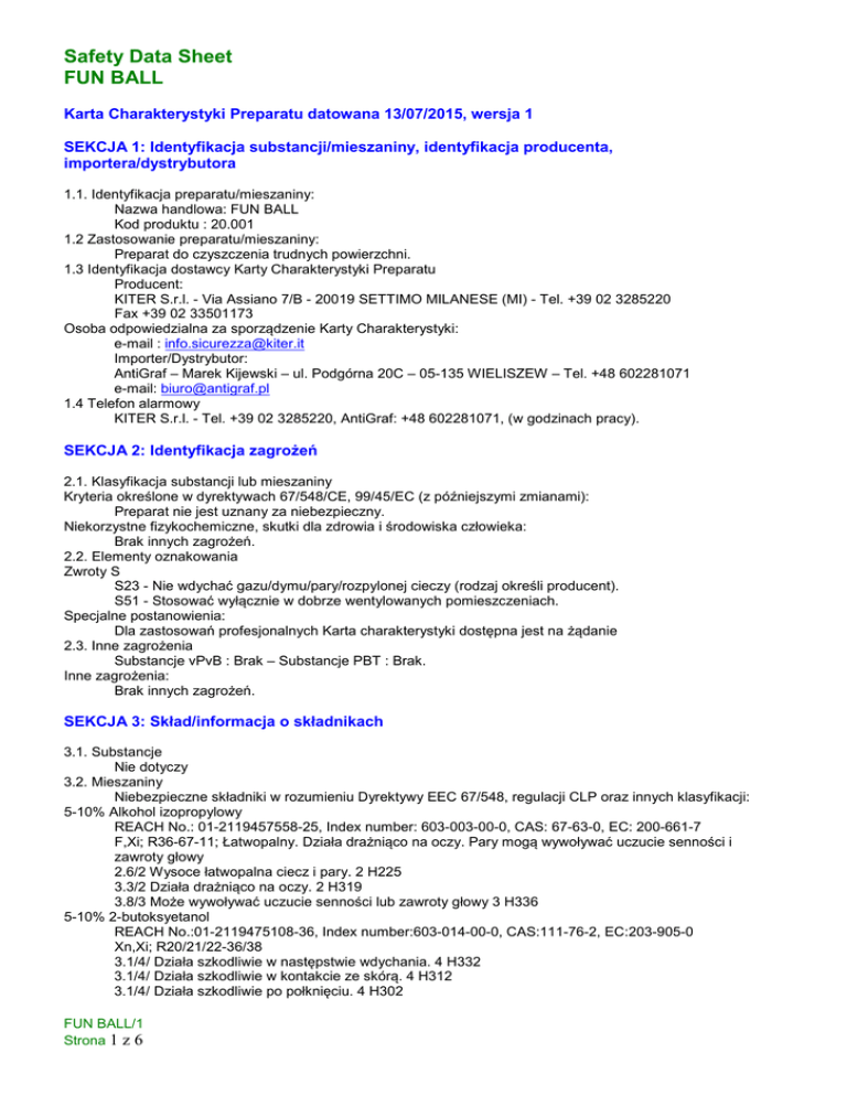 Safety Data Sheet FUN BALL Karta Charakterystyki Preparatu datowana 13/07/2015, wersja 1 SEKCJA 1: Identyfikacja substancji/mieszaniny, identyfikacja producenta, importera/dystrybutora 1.1. Identyfikacja preparatu/mieszaniny: Nazwa handlowa: FUN BALL Kod produktu : 20.001 1.2 Zastosowanie preparatu/mieszaniny: Preparat do czyszczenia trudnych powierzchni. 1.3 Identyfikacja dostawcy Karty Charakterystyki Preparatu Producent: KITER S.r.l. - Via Assiano 7/B - 20019 SETTIMO MILANESE (MI) - Tel. +39 02 3285220 Fax +39 02 33501173 Osoba odpowiedzialna za sporządzenie Karty Charakterystyki: e-mail : [email protected] Importer/Dystrybutor: AntiGraf – Marek Kijewski – ul. Podgórna 20C – 05-135 WIELISZEW – Tel. +48 602281071 e-mail: [email protected] 1.4 Telefon alarmowy KITER S.r.l. - Tel. +39 02 3285220, AntiGraf: +48 602281071, (w godzinach pracy). SEKCJA 2: Identyfikacja zagrożeń 2.1. Klasyfikacja substancji lub mieszaniny Kryteria określone w dyrektywach 67/548/CE, 99/45/EC (z późniejszymi zmianami): Preparat nie jest uznany za niebezpieczny. Niekorzystne fizykochemiczne, skutki dla zdrowia i środowiska człowieka: Brak innych zagrożeń. 2.2. Elementy oznakowania Zwroty S S23 - Nie wdychać gazu/dymu/pary/rozpylonej cieczy (rodzaj określi producent). S51 - Stosować wyłącznie w dobrze wentylowanych pomieszczeniach. Specjalne postanowienia: Dla zastosowań profesjonalnych Karta charakterystyki dostępna jest na żądanie 2.3. Inne zagrożenia Substancje vPvB : Brak – Substancje PBT : Brak. Inne zagrożenia: Brak innych zagrożeń. SEKCJA 3: Skład/informacja o składnikach 3.1. Substancje Nie dotyczy 3.2. Mieszaniny Niebezpieczne składniki w rozumieniu Dyrektywy EEC 67/548, regulacji CLP oraz innych klasyfikacji: 5-10% Alkohol izopropylowy REACH No.: 01-2119457558-25, Index number: 603-003-00-0, CAS: 67-63-0, EC: 200-661-7 F,Xi; R36-67-11; Łatwopalny. Działa drażniąco na oczy. Pary mogą wywoływać uczucie senności i zawroty głowy 2.6/2 Wysoce łatwopalna ciecz i pary. 2 H225 3.3/2 Działa drażniąco na oczy. 2 H319 3.8/3 Może wywoływać uczucie senności lub zawroty głowy 3 H336 5-10% 2-butoksyetanol REACH No.:01-2119475108-36, Index number:603-014-00-0, CAS:111-76-2, EC:203-905-0 Xn,Xi; R20/21/22-36/38 3.1/4/ Działa szkodliwie w następstwie wdychania. 4 H332 3.1/4/ Działa szkodliwie w kontakcie ze skórą. 4 H312 3.1/4/ Działa szkodliwie po połknięciu. 4 H302 FUN BALL/1 Strona 1 z 6 Safety Data Sheet FUN BALL 3.3/2 Działa drażniąco na oczy. 2 H319 3.2/2 Działa drażniąco na skórę. 2 H315 Zawiera (Reg. (CE) N. 648/2004): Poniżej 5 %: niejonowych powierzchniowo czynnych substancji, substancji kationowych, środków zapachowych i dezynfekcyjnych. SEKCJA 4: Środki pierwszej pomocy 4.1. Opis środków pierwszej pomocy: W przypadku kontaktu ze skórą: Umyć wodą z mydłem. W przypadku kontaktu z oczami: W razie zanieczyszczenia preparatem, oczy przepłukać obficie i dokładnie czystą wodą przez ok. 10 min. Podczas płukania mrugać powiekami, aby ułatwić wypłukanie preparatu. W przypadku utrzymania się podrażnienia zasięgnąć porady medycznej.. W przypadku połknięcia: NIE WYMUSZAĆ WYMIOTÓW. Zasięgnąć porady medycznej. W przypadku dostania się do dróg oddechowych: W razie podrażnienia dróg oddechowych, wyprowadzić osobę poszkodowaną na świeże powietrze, rozluźnić ubranie. Zasięgnąć porady medycznej.. 4.2. Najważniejsze ostre i opóźnione objawy oraz skutki narażenia: Brak. 4.3. Wskazania dotyczące wszelkiej natychmiastowej pomocy lekarskiej i szczególnego postępowania z poszkodowanym: W razie wypadku: skontaktować się z lekarzem lub pogotowiem. Zabrać ze sobą etykietę lub niniejszą kartę charakterystyki. Leczenie: Brak specjalnych zaleceń. SEKCJA 5: Postępowanie w przypadku pożaru 5.1. Środki gaśnicze Właściwe środki gaśnicze: Woda, dwutlenek węgla (CO2). Środki gaśnicze, których nie wolno używać ze względów bezpieczeństwa: Nie są ustalone. 5.2. Szczególne zagrożenia związane z substancją lub mieszaniną: Nie wdychać gazów powstałych podczas eksplozji i pożaru. Podczas pożaru może powstać gęsty dym. 5.3. Informacje dla straży pożarnej: Normalne ubranie strażackie i pełne wyposażenie dla ochrony dróg oddechowych. Woda gaśnicza powinna być zebrana w taki sposób aby nie dostała się do ścieków. Jeśli to bezpieczne, należy niezwłocznie usunąć nieuszkodzone pojemniki poza teren zagrożenia SEKCJA 6: Postępowanie w przypadku niezamierzonego uwolnienia do środowiska 6.1. Indywidualne środki ostrożności, wyposażenie ochronne i procedury w sytuacjach awaryjnych: Używać osobistych środków ochrony. Dla bezpieczeństwa usunąć osoby niepożądane. Stosować się do zaleceń ujętych w punktach 7 i 8. 6.2. Środki ostrożności w zakresie ochrony środowiska: Nie dopuścić do dostania się do gruntu/gleby. Nie dopuścić do dostania się do wód gruntowych i kanalizacji. Zanieczyszczoną wodę usunąć. W przypadku ulatniania się gazów lub uwolnienia do cieków wodnych, gleby lub kanalizacji zawiadomić odpowiednie służby. Materiał rozlany zasypać absorbentem, najlepiej piaskiem 6.3. Metody i materiały zapobiegające rozprzestrzenianiu się skażenia i służące do usuwania skażenia: Spłukać obficie wodą. 6.4. Odniesienia do innych sekcji: Postępowanie z odpadami opisane jest w sekcji 13 środki ostrożności omówione są w sekcji 8. FUN BALL/1 Strona 2 z 6 Safety Data Sheet FUN BALL SEKCJA 7: Postępowanie z substancjami i mieszaninami oraz ich magazynowanie 7.1. Środki ostrożności dotyczące bezpiecznego postępowania: Unikać kontaktu ze skórą i oczami, wdychania oparów. Nie jeść i nie pić podczas pracy. Zapoznać się ze środkami bezpieczeństwa omówionymi w sekcji 8. 7.2. Warunki bezpiecznego magazynowania, łącznie z informacjami dotyczącymi wszelkich wzajemnych niezgodności: Przechowywać z dala od żywności, napojów oraz 